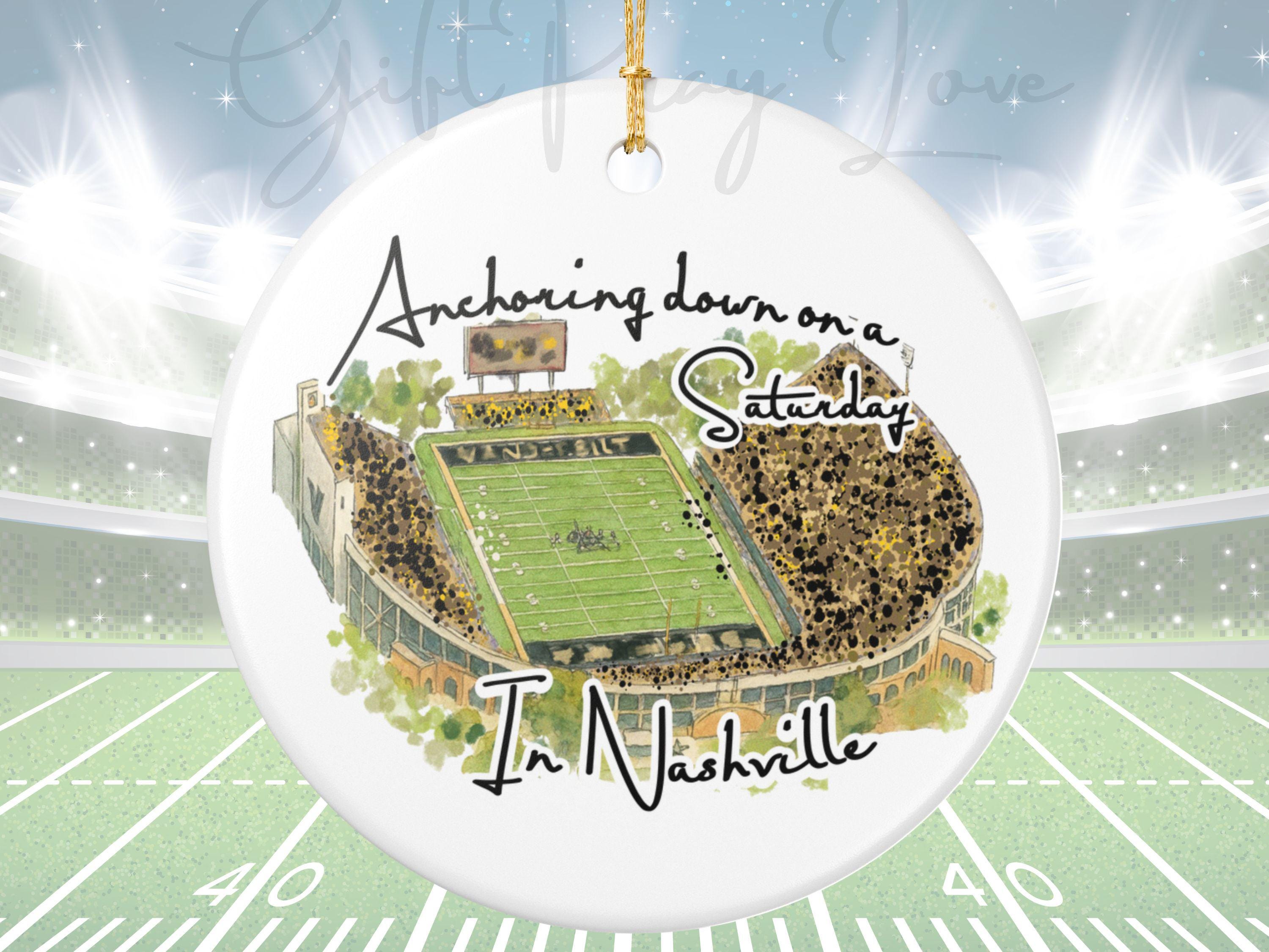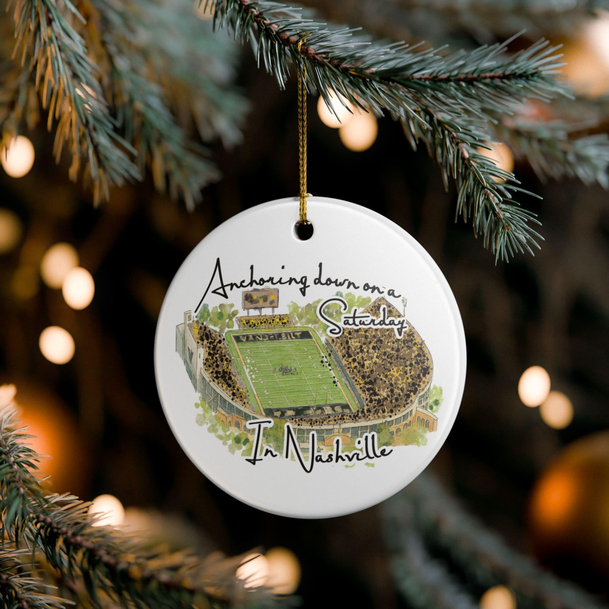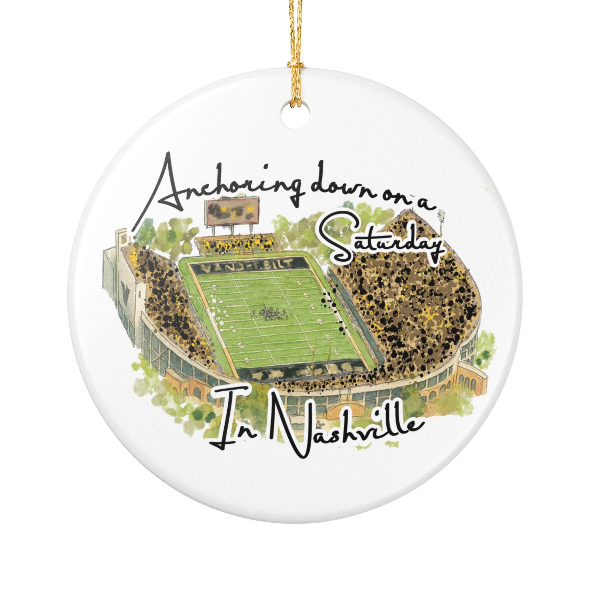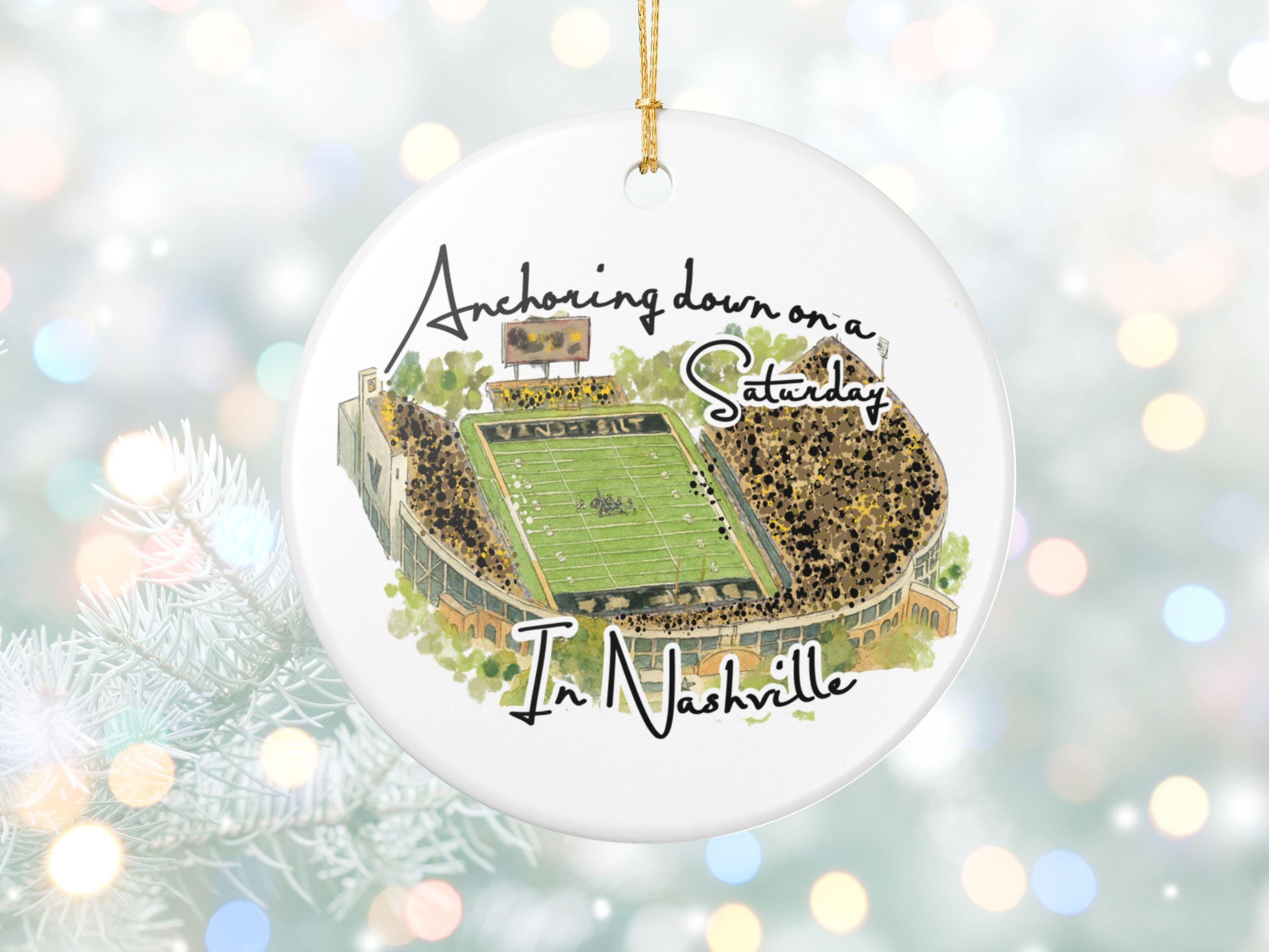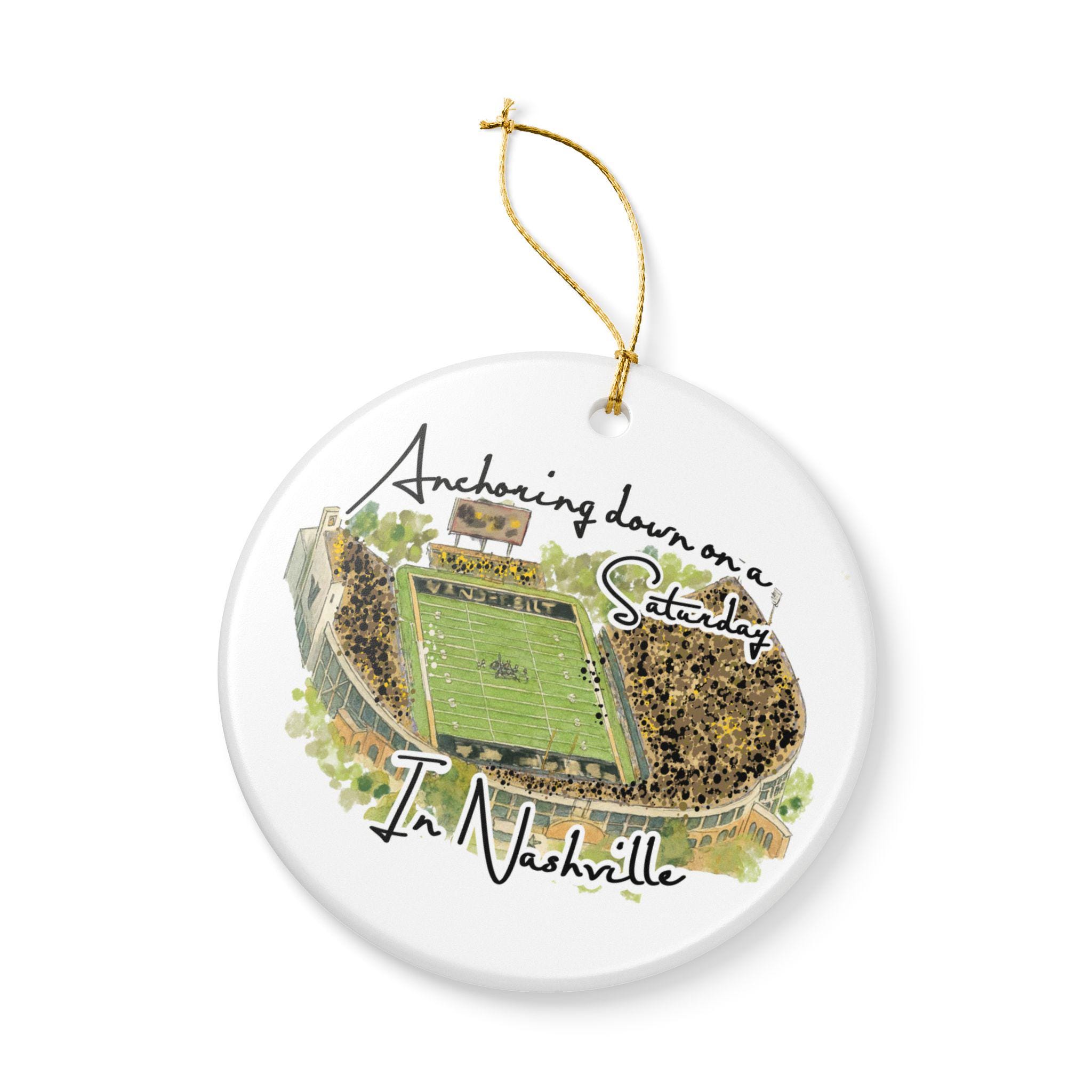 Celebrate black-and-gold pride with this Vanderbilt-inspired watercolor stadium ornament, designed for fans who love a fall Saturday in Nashville. Featuring the phrase “Anchoring down on a Saturday in Nashville” and a hand-painted style stadium illustration, this round ceramic ornament brings the spirit of game day straight to your holiday décor.