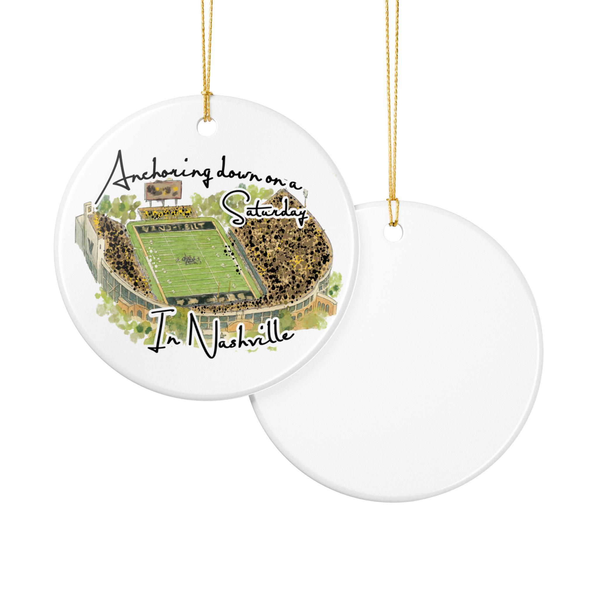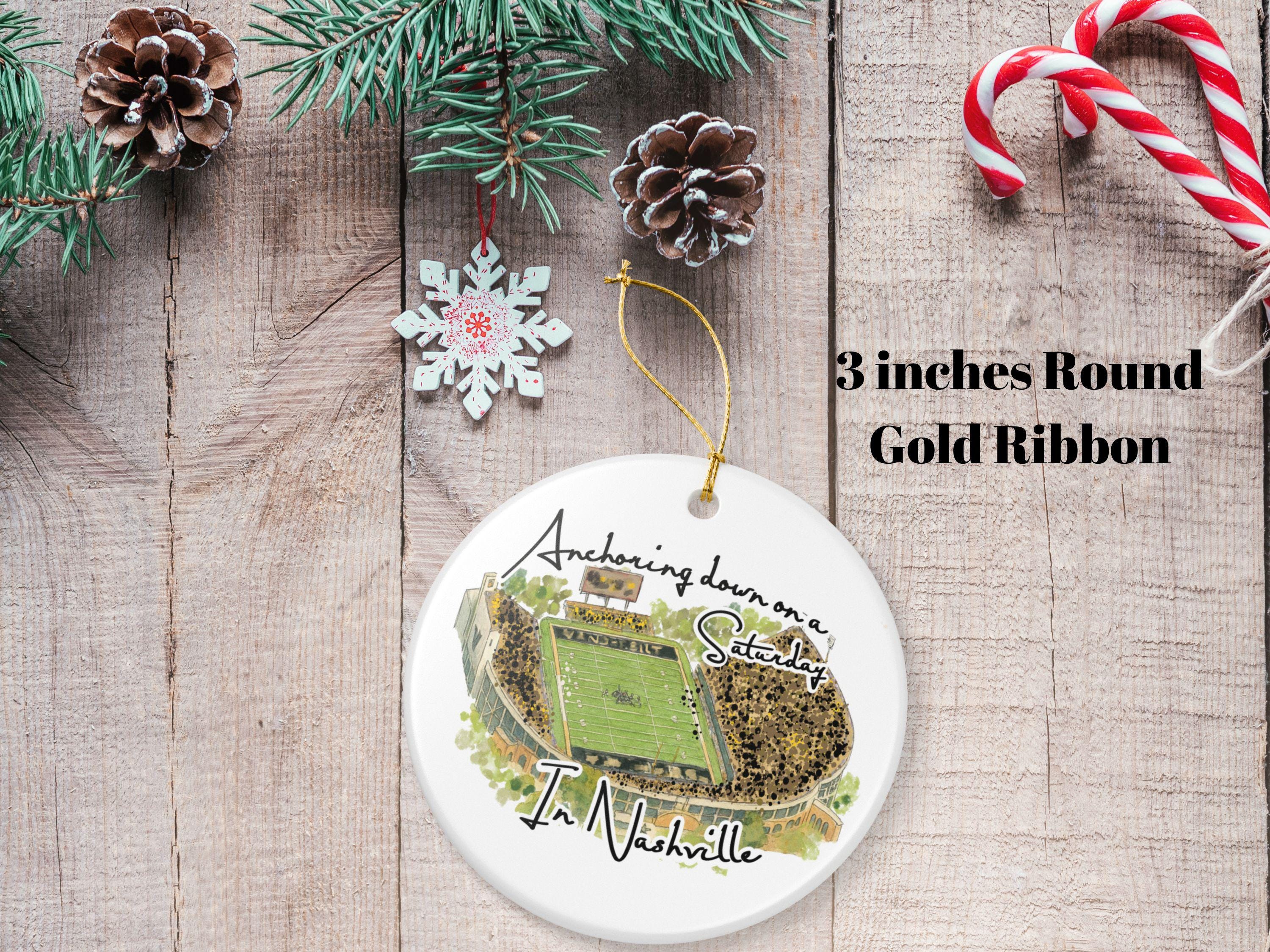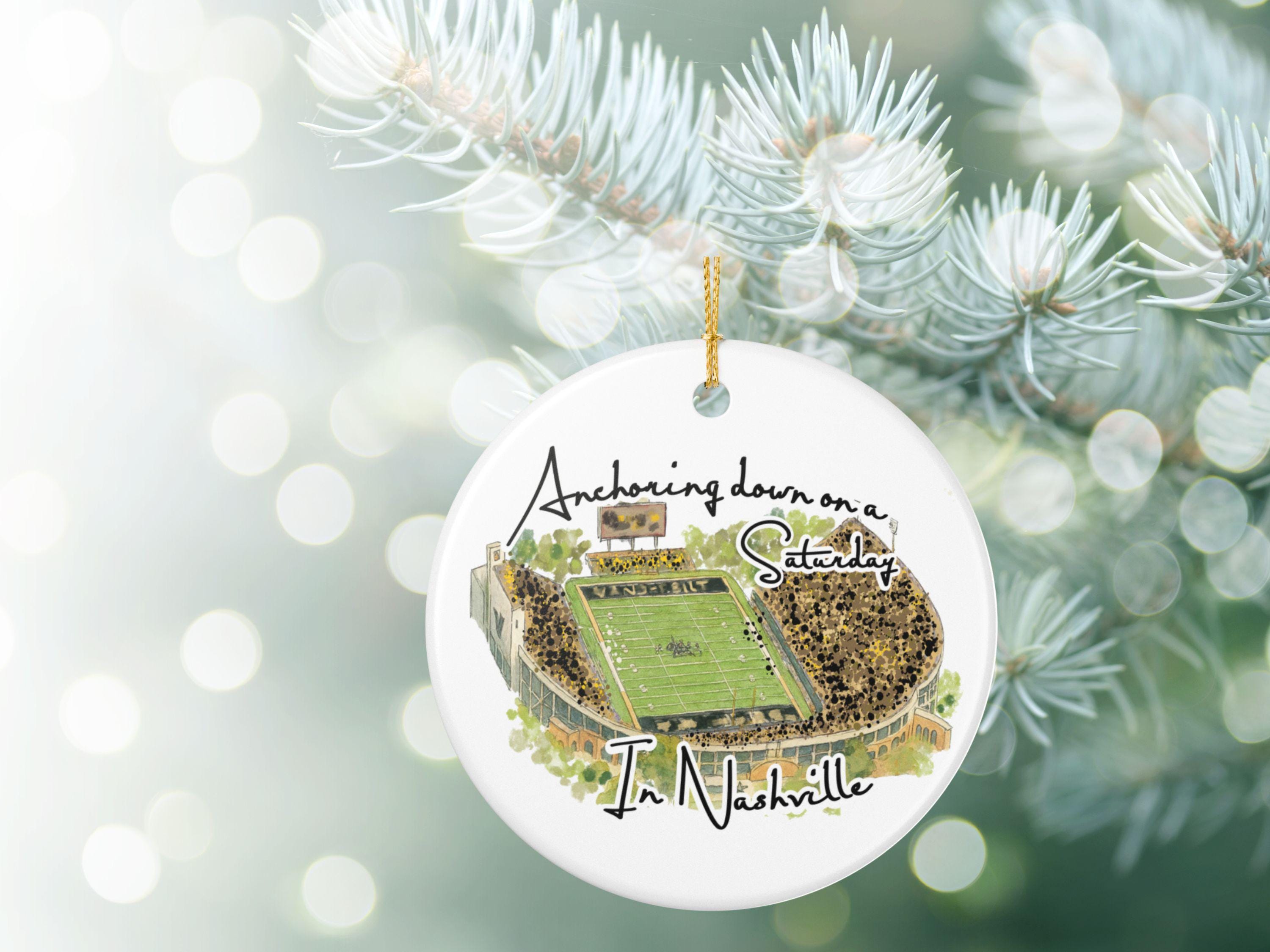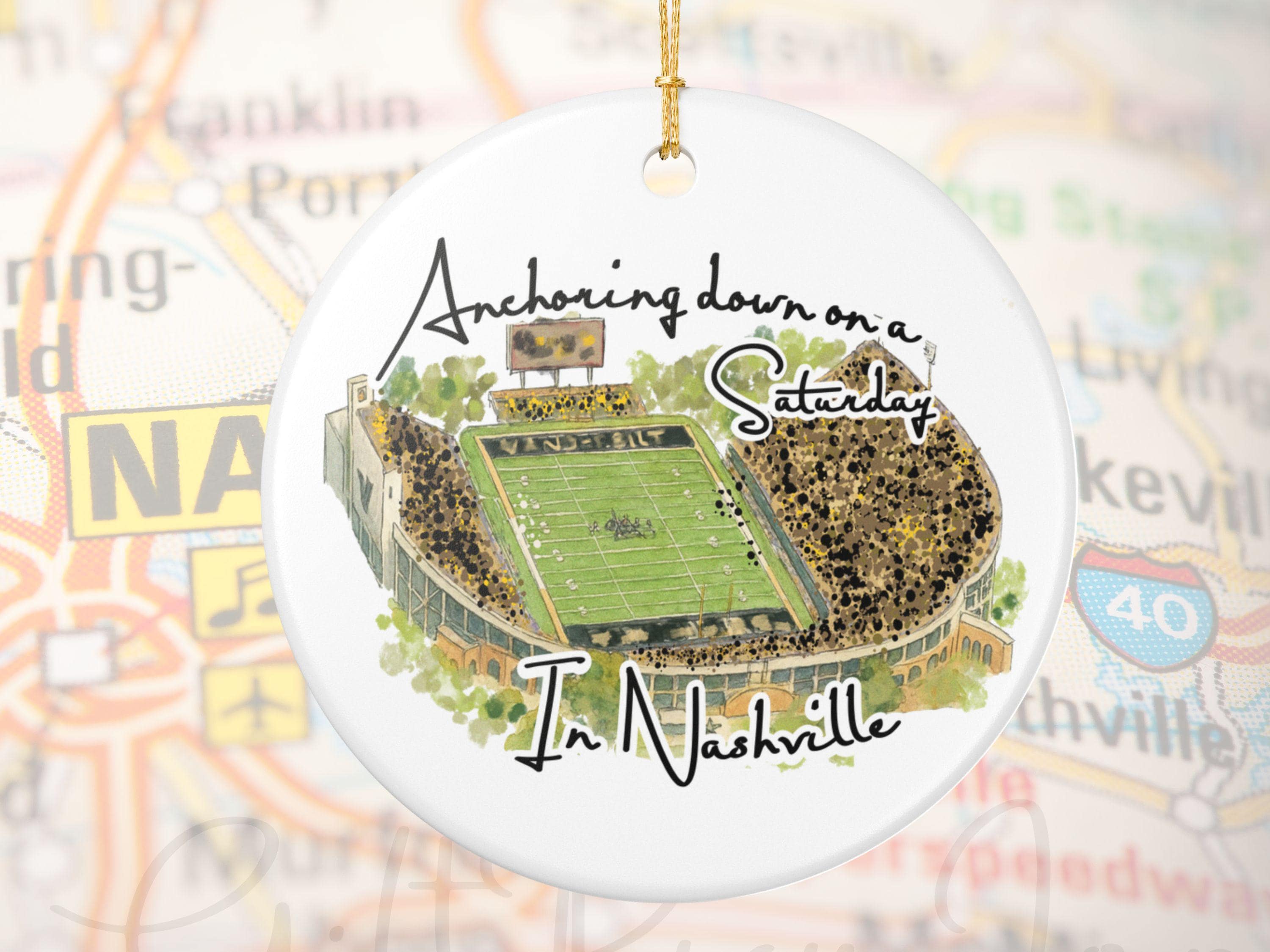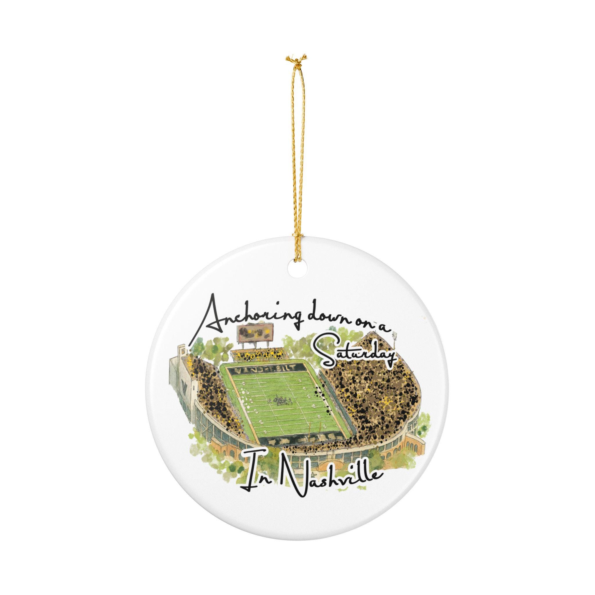 Celebrate black-and-gold pride with this Vanderbilt-inspired watercolor stadium ornament, designed for fans who love a fall Saturday in Nashville. Featuring the phrase “Anchoring down on a Saturday in Nashville” and a hand-painted style stadium illustration, this round ceramic ornament brings the spirit of game day straight to your holiday décor.