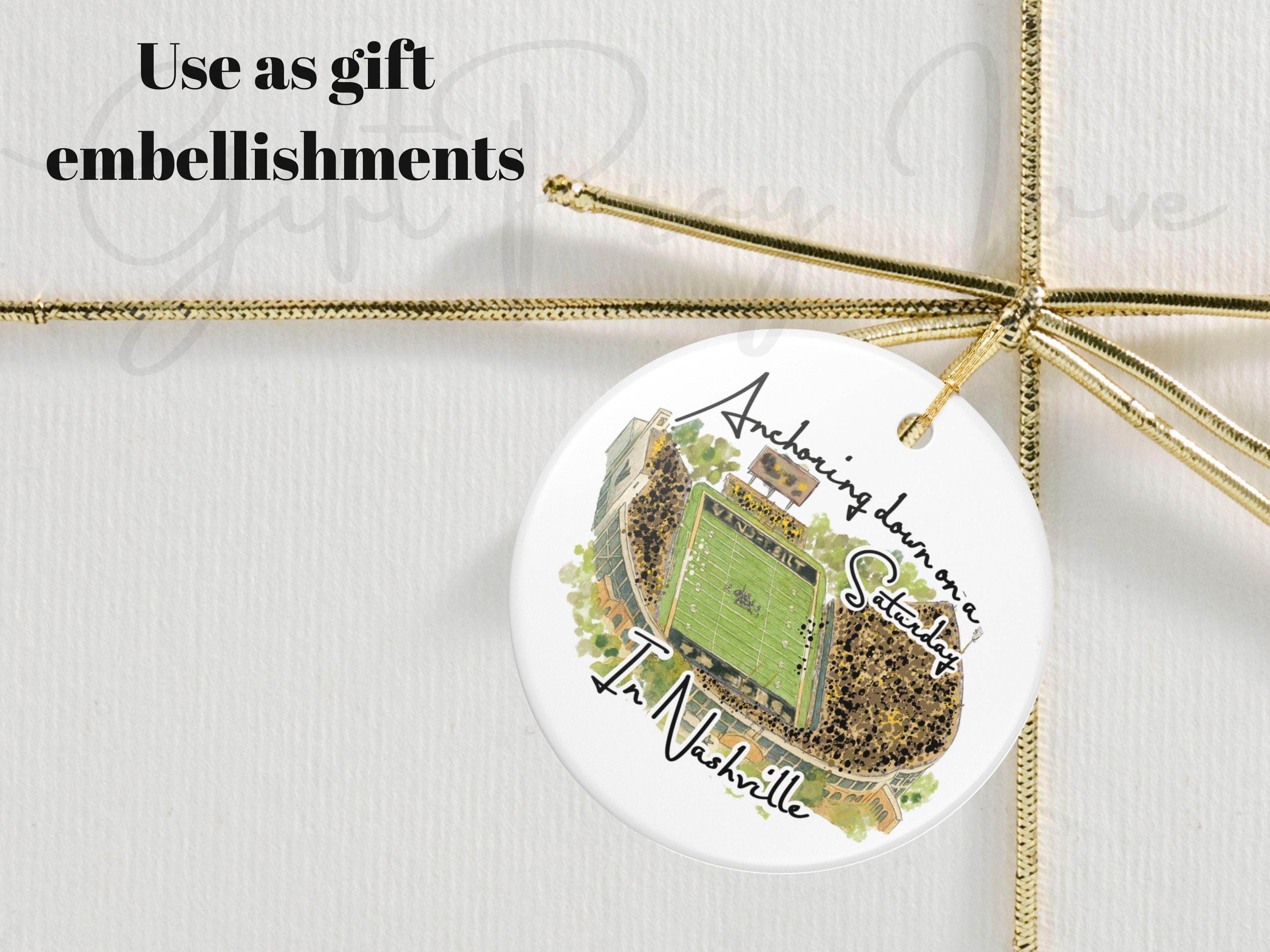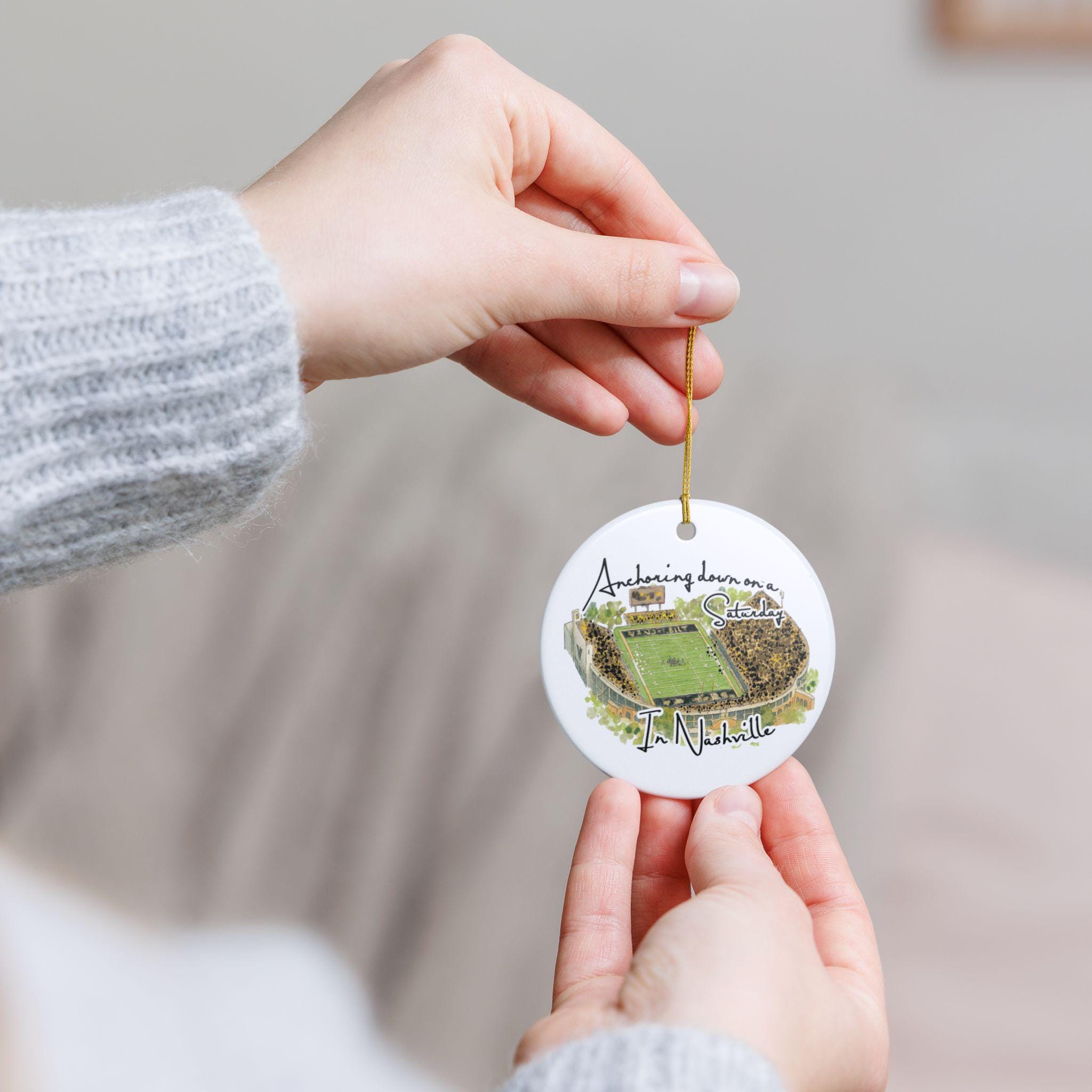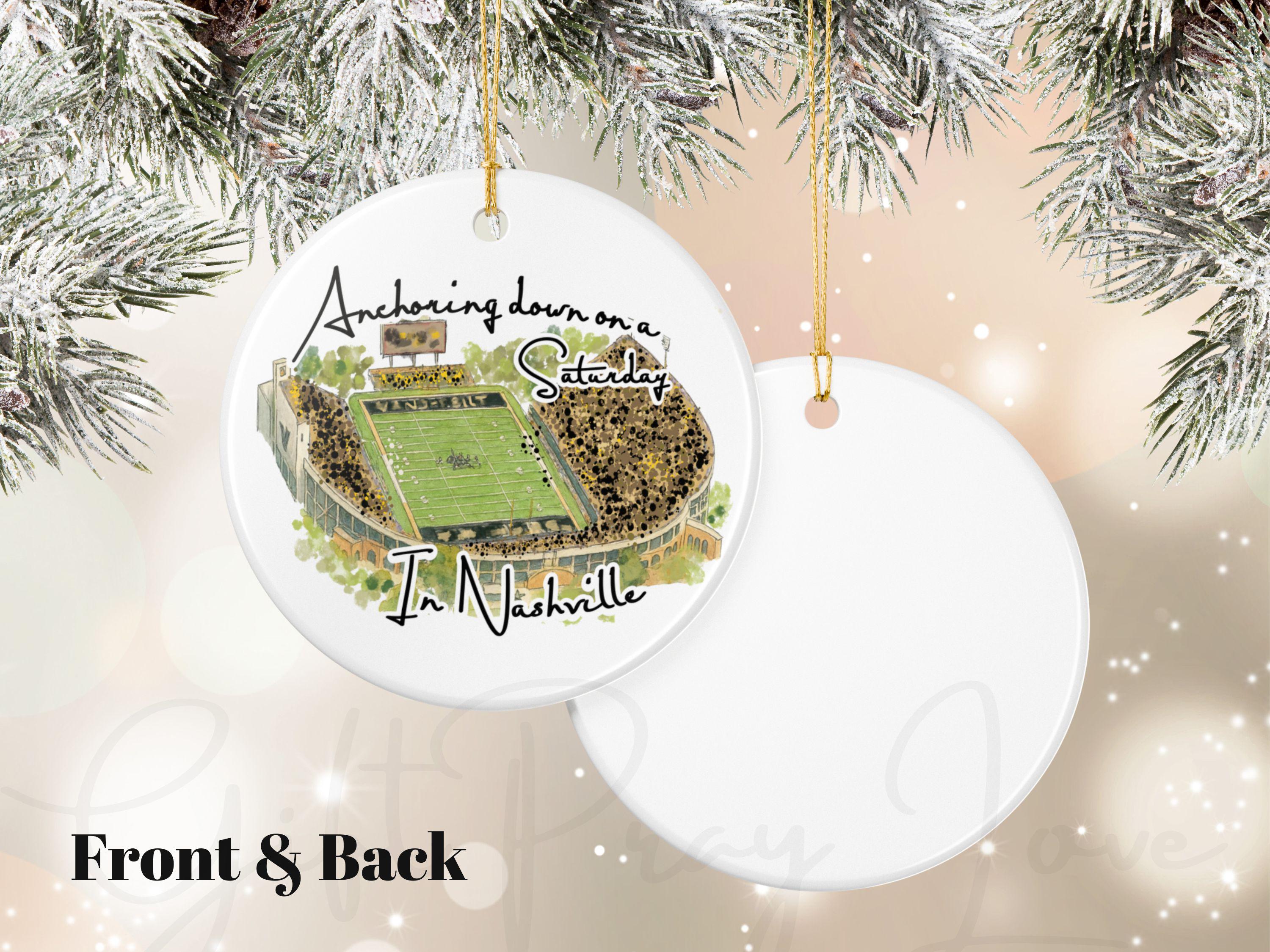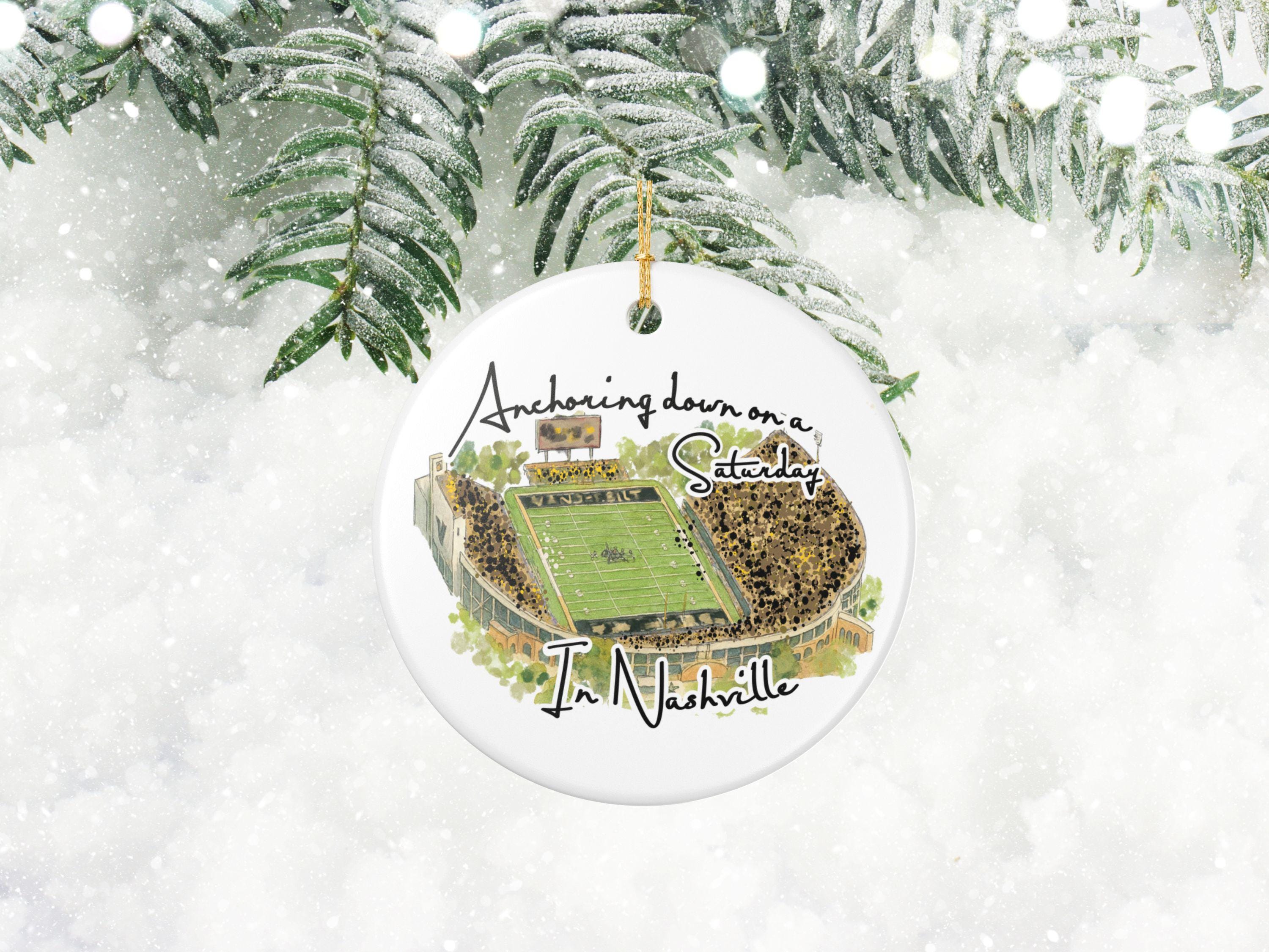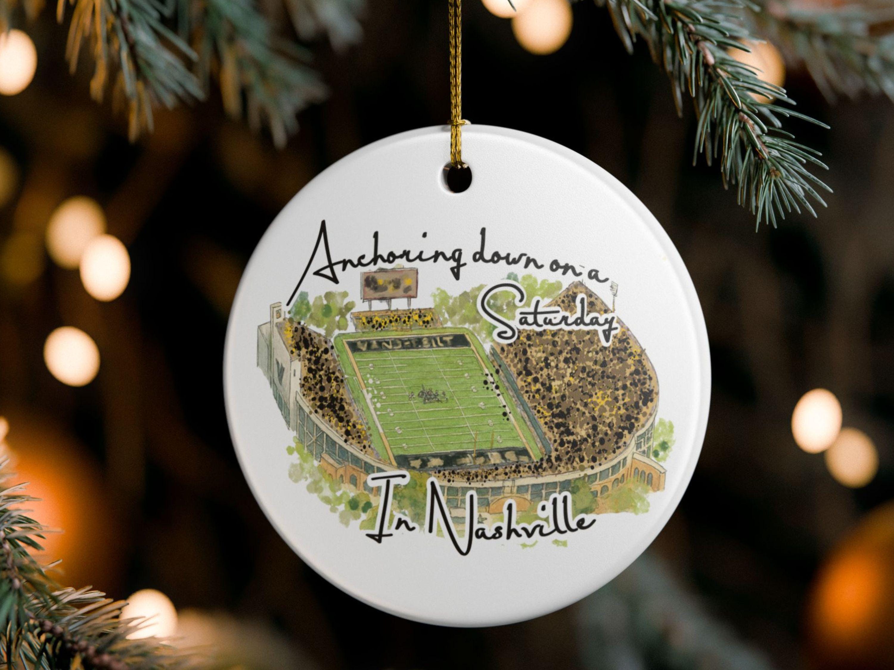 Celebrate black-and-gold pride with this Vanderbilt-inspired watercolor stadium ornament, designed for fans who love a fall Saturday in Nashville. Featuring the phrase “Anchoring down on a Saturday in Nashville” and a hand-painted style stadium illustration, this round ceramic ornament brings the spirit of game day straight to your holiday décor.