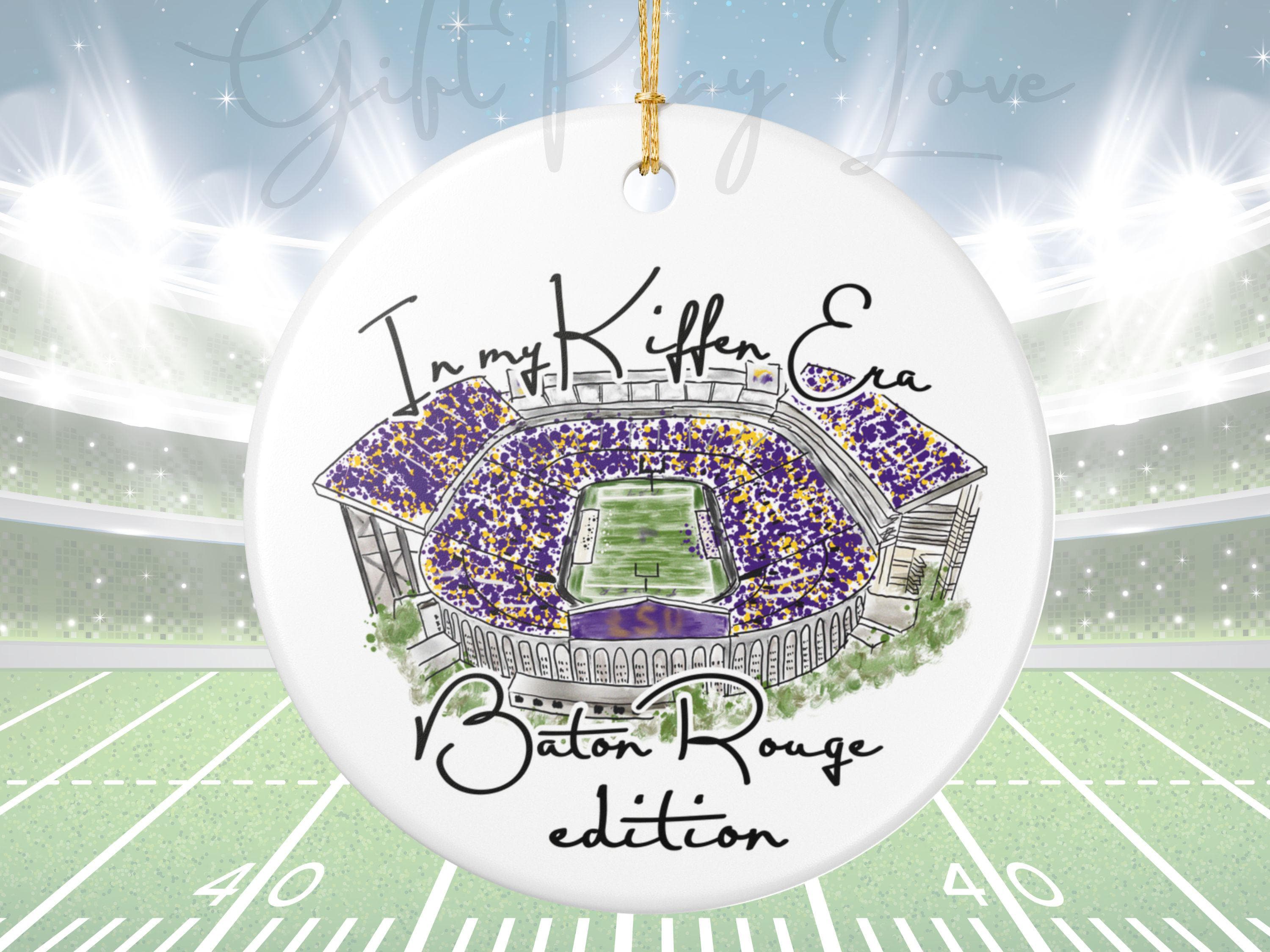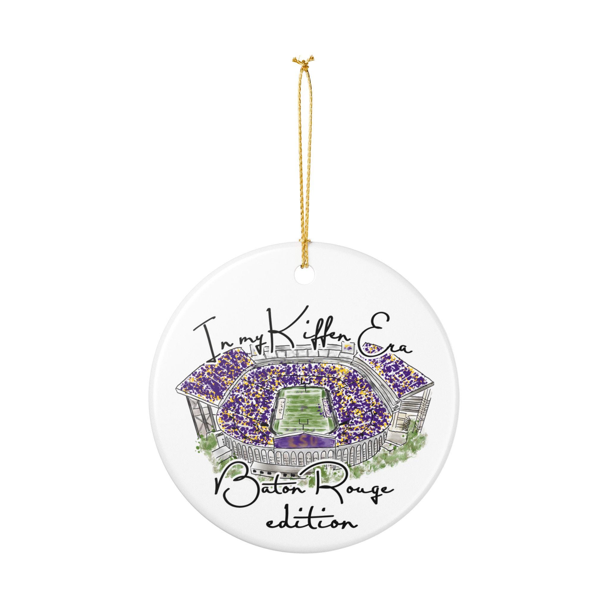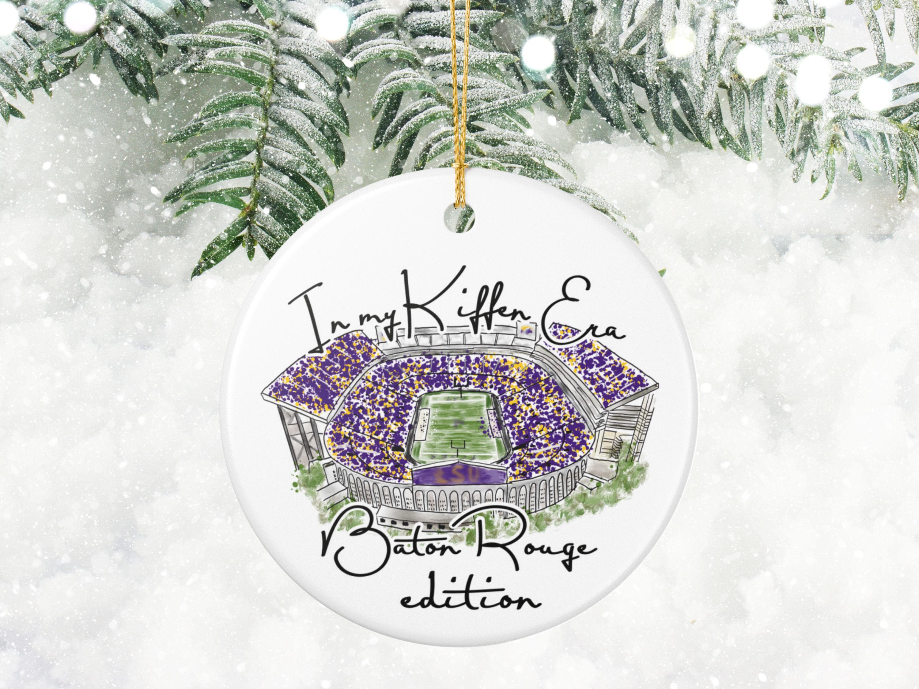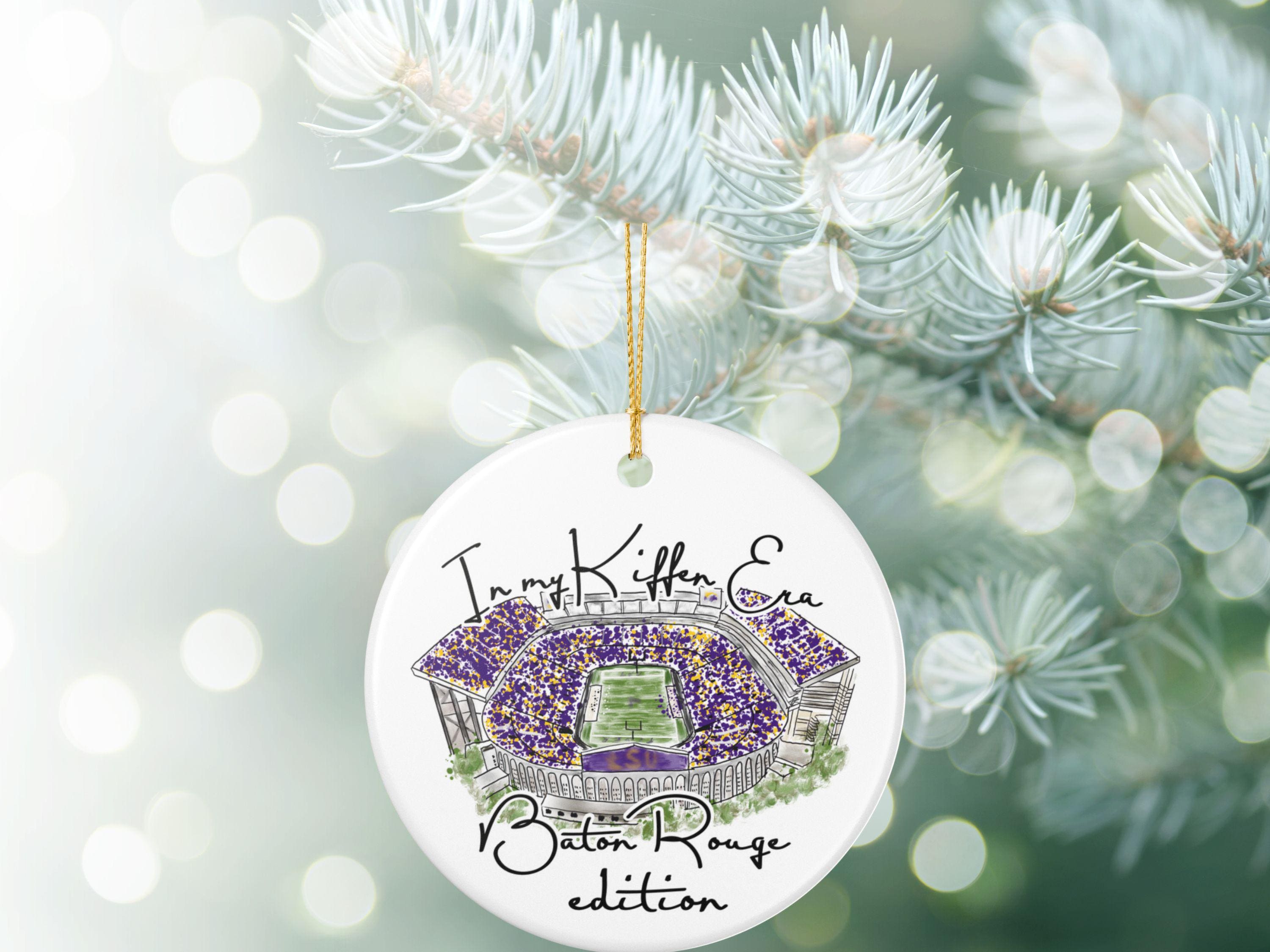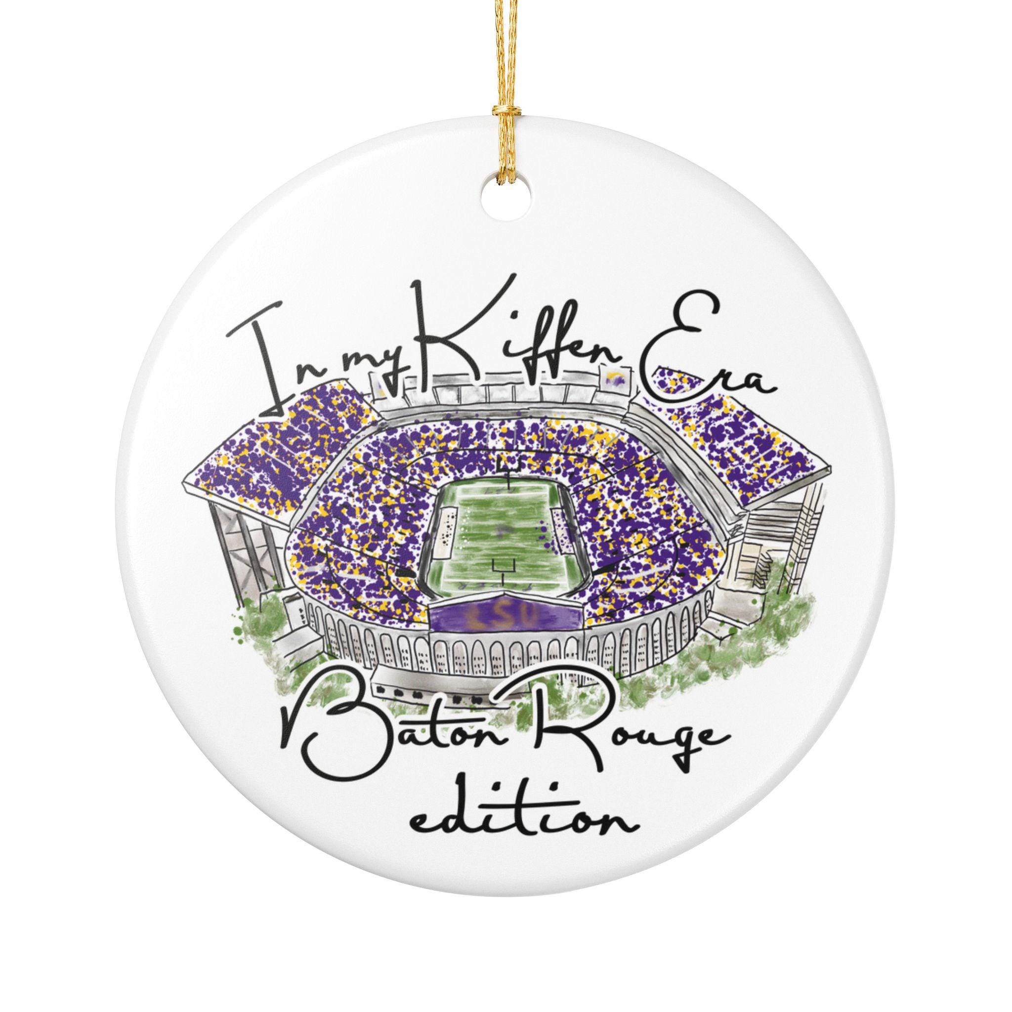 Celebrate the energy of a Baton Rouge matchup with this vibrant watercolor stadium ornament featuring the playful phrase “In My Kiffin Era – Baton Rouge Edition.” Designed for LSU fans who love the excitement of a purple-and-gold Saturday, this ceramic ornament blends hand-rendered watercolor style with a modern game-day aesthetic.