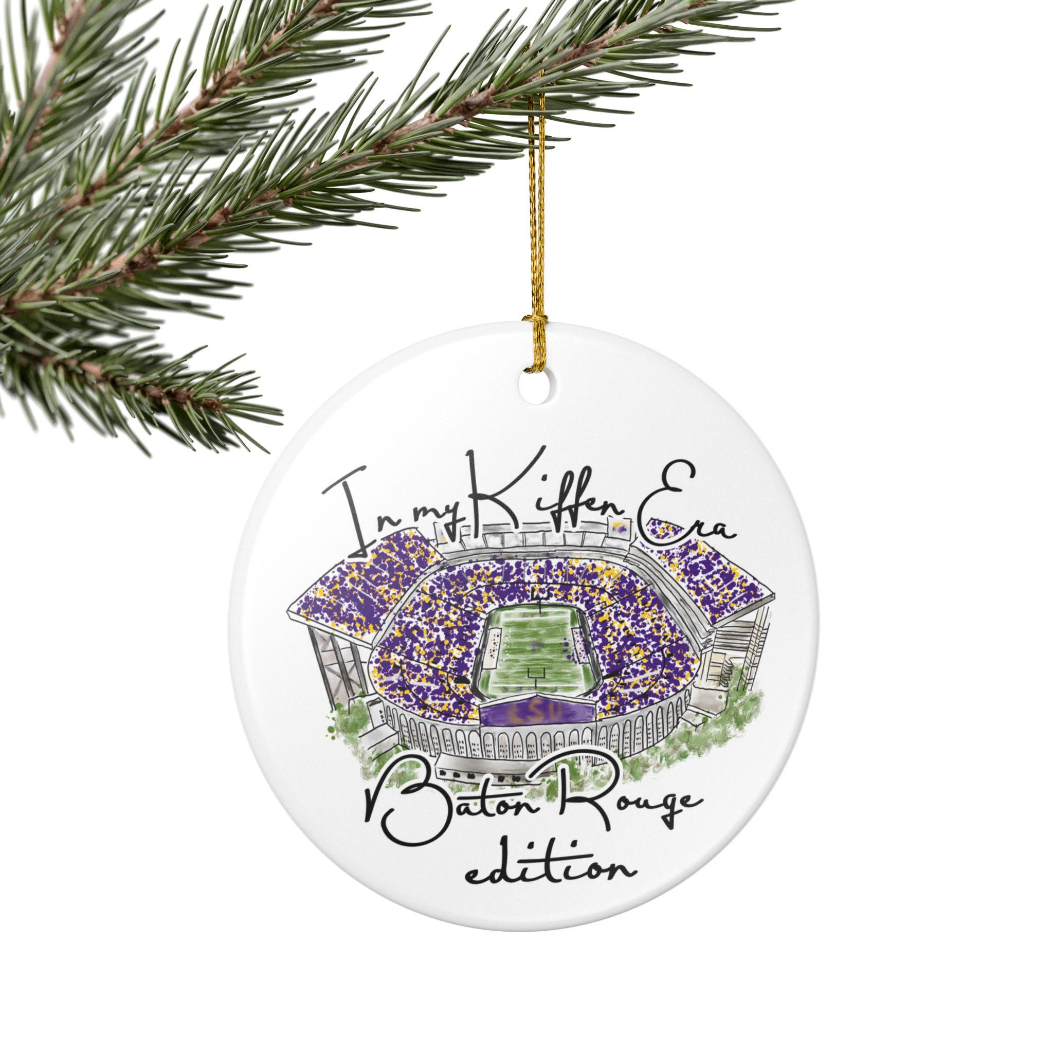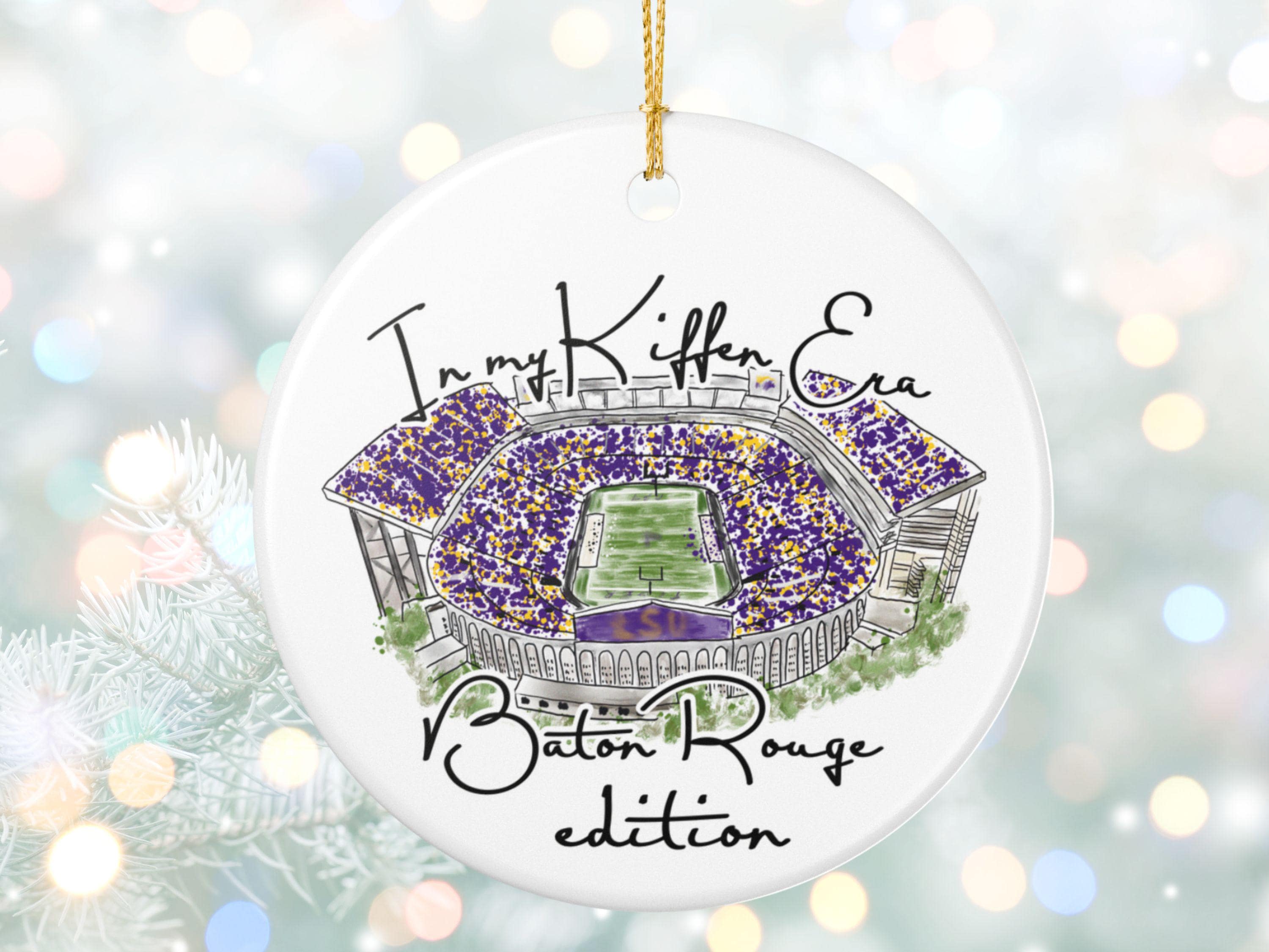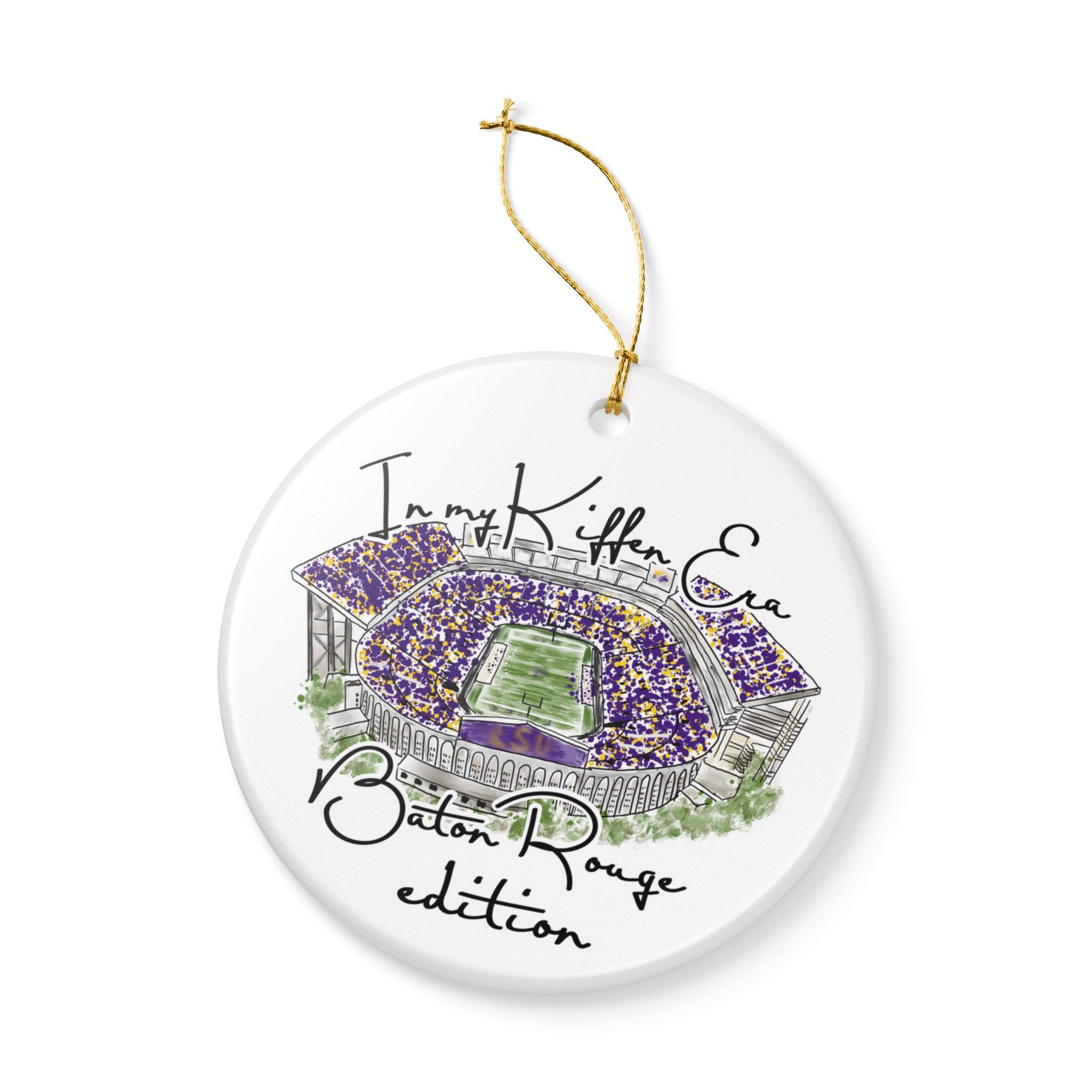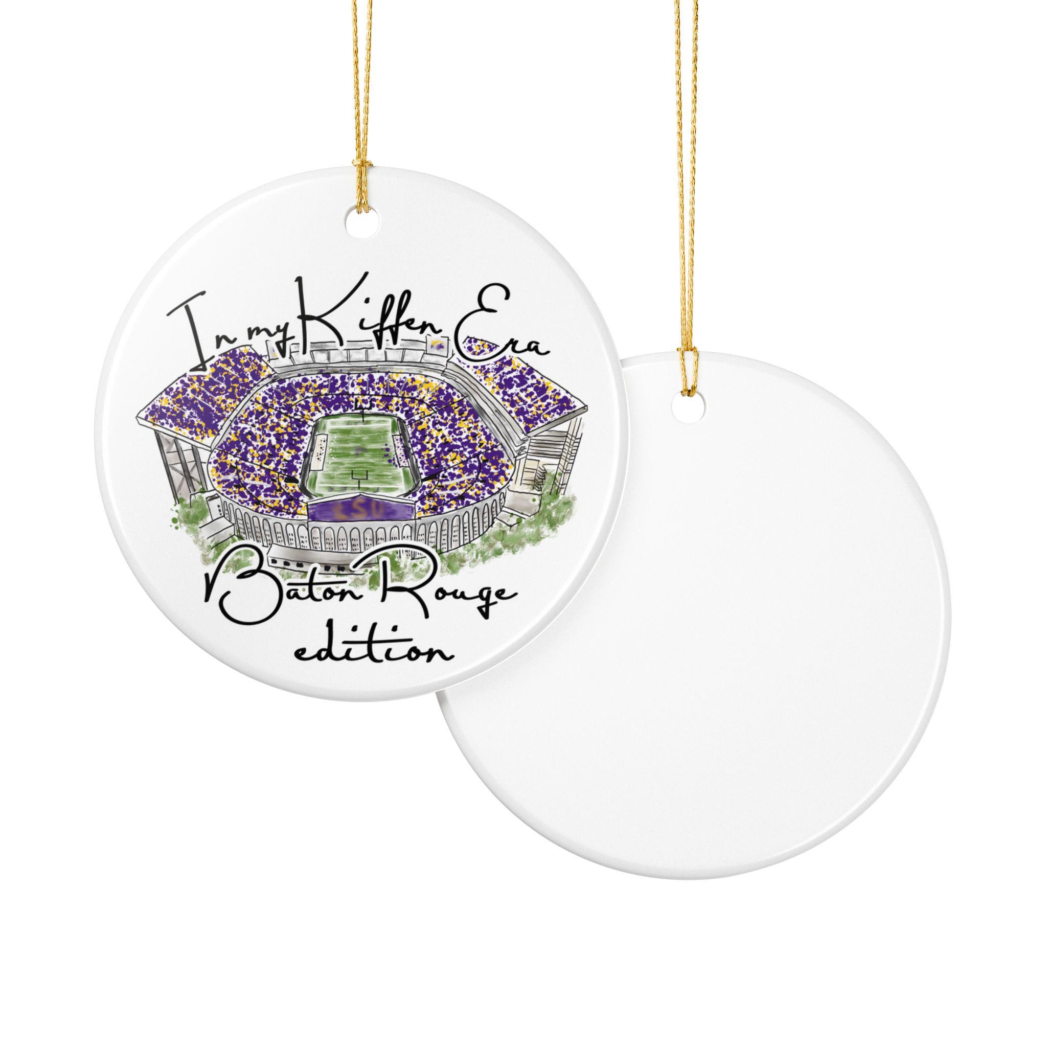 Celebrate the energy of a Baton Rouge matchup with this vibrant watercolor stadium ornament featuring the playful phrase “In My Kiffin Era – Baton Rouge Edition.” Designed for LSU fans who love the excitement of a purple-and-gold Saturday, this ceramic ornament blends hand-rendered watercolor style with a modern game-day aesthetic.