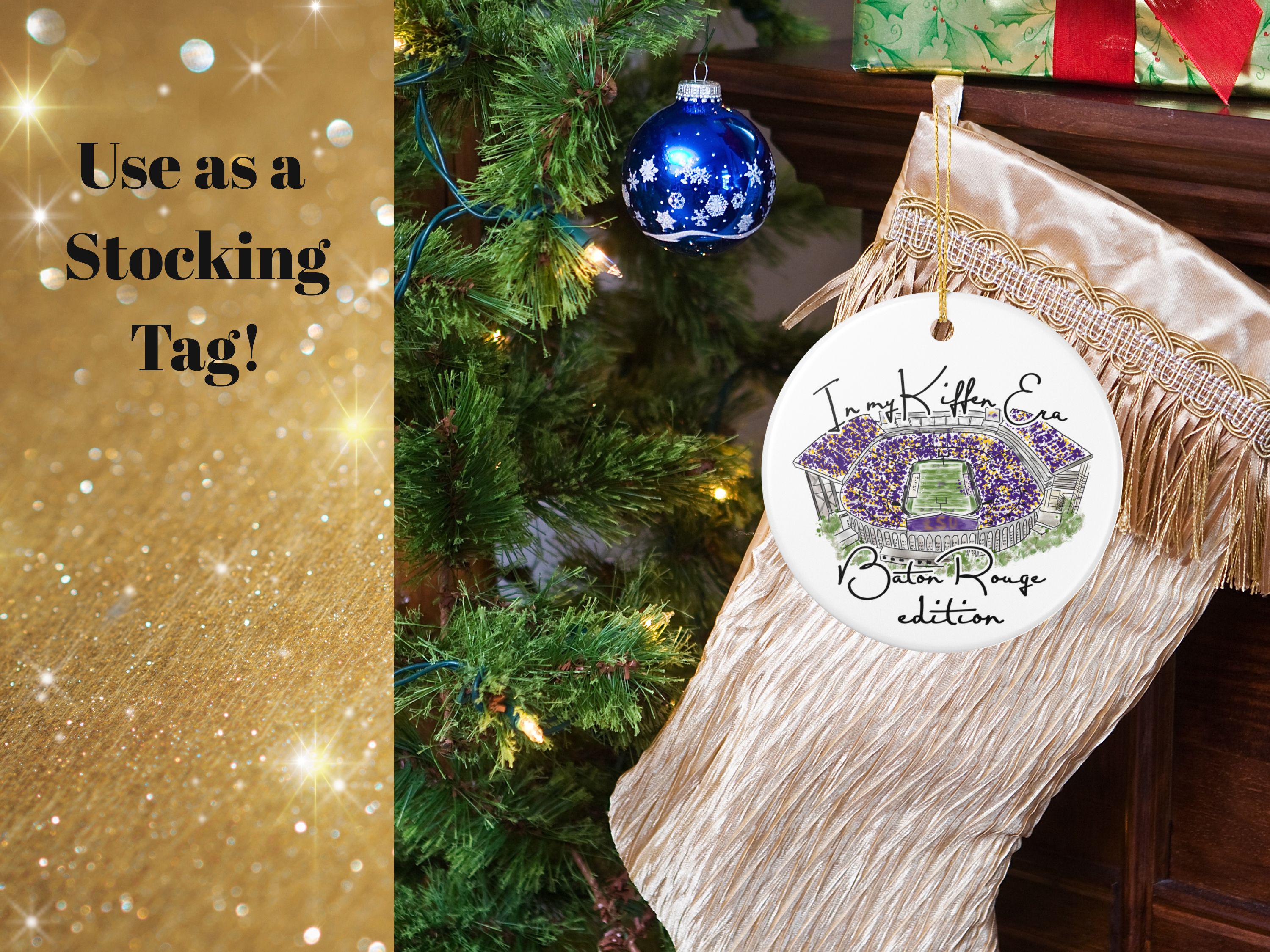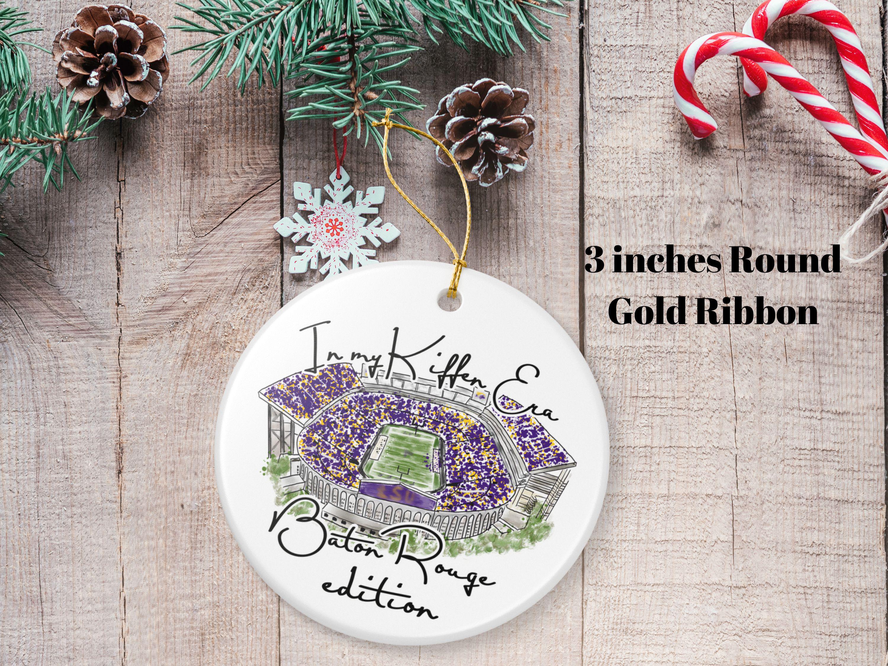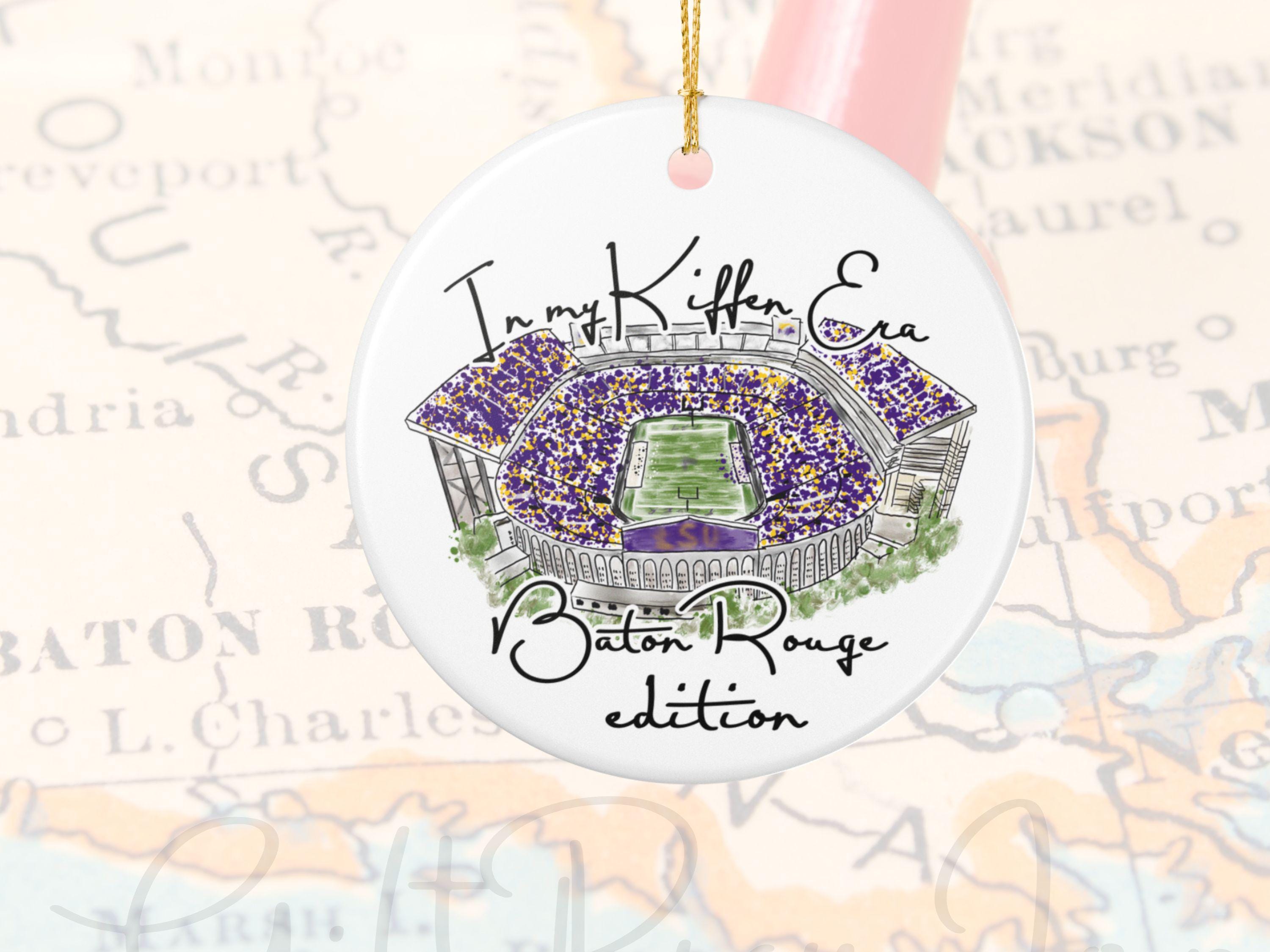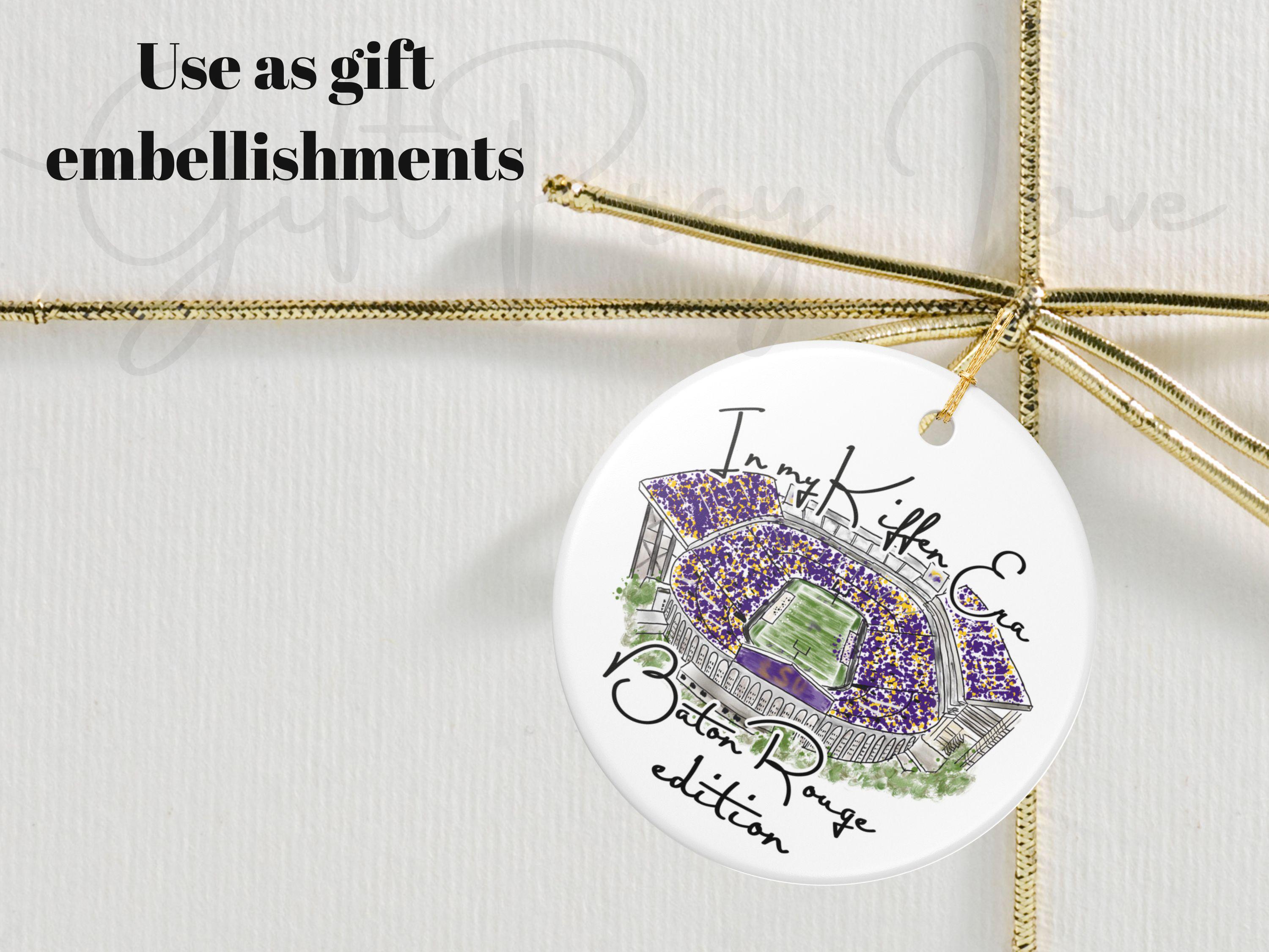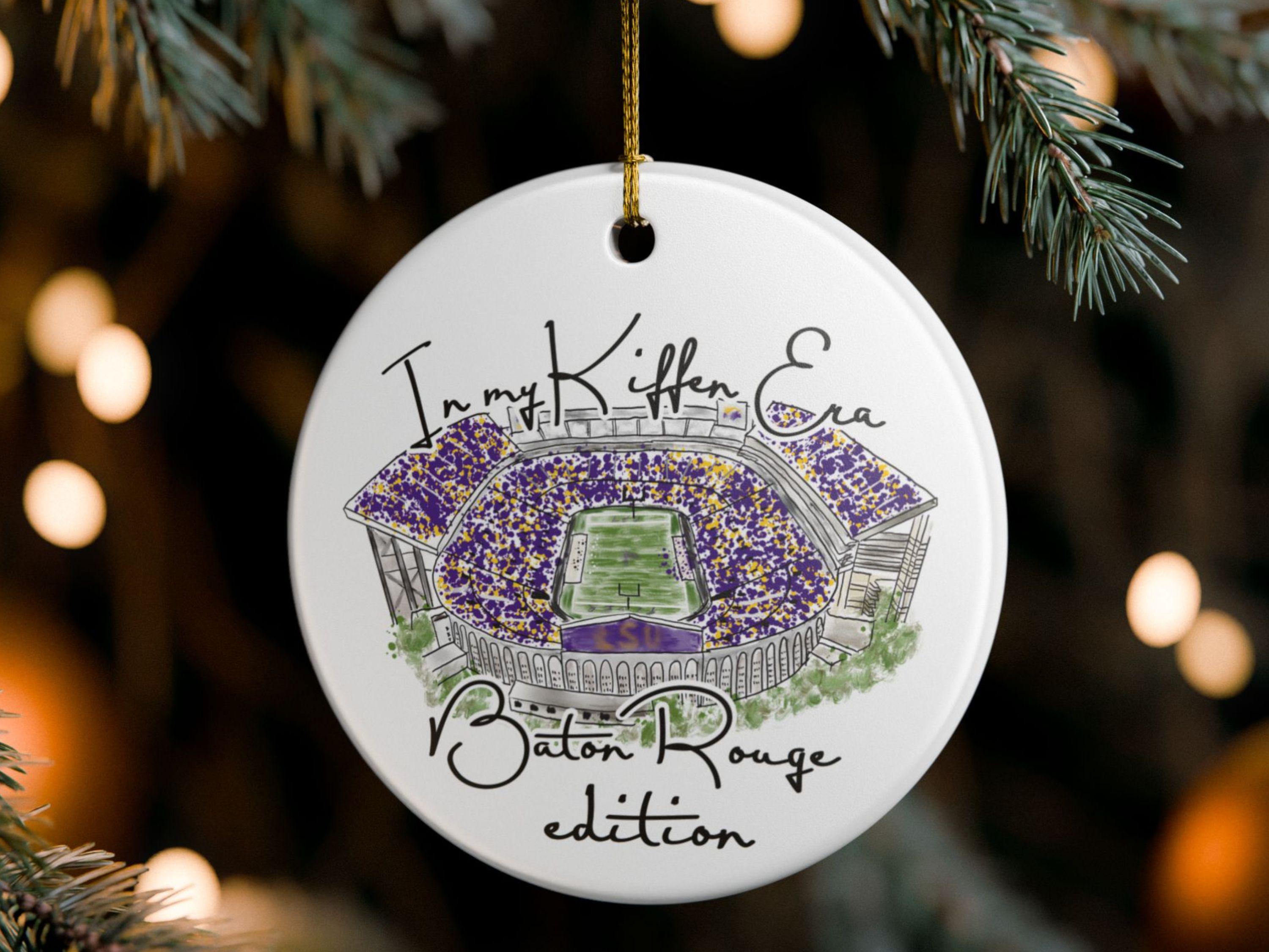 Celebrate the energy of a Baton Rouge matchup with this vibrant watercolor stadium ornament featuring the playful phrase “In My Kiffin Era – Baton Rouge Edition.” Designed for LSU fans who love the excitement of a purple-and-gold Saturday, this ceramic ornament blends hand-rendered watercolor style with a modern game-day aesthetic.