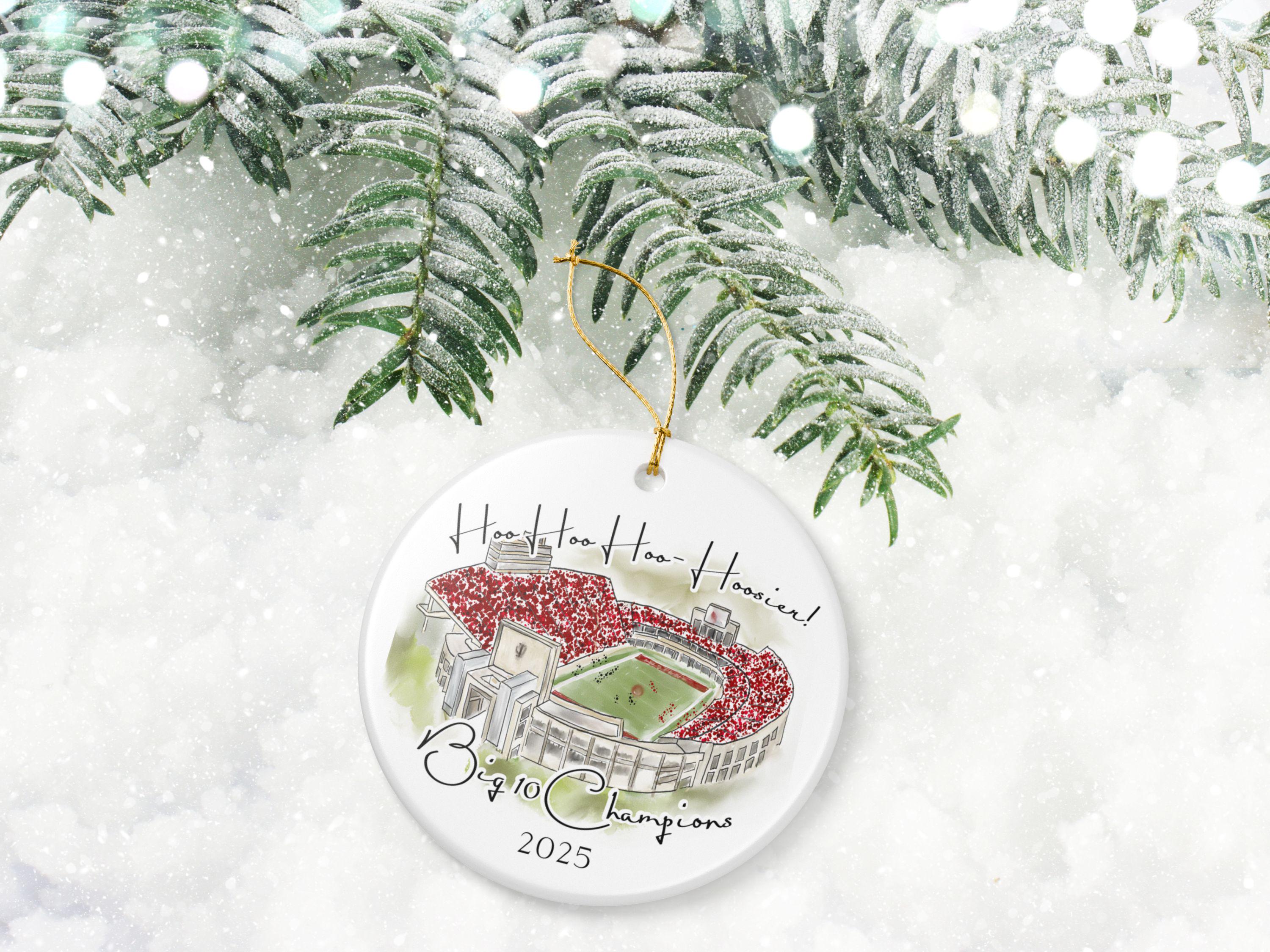 Celebrate game day in Bloomington with this handcrafted ceramic ornament featuring a watercolor illustration of the Indiana football stadium and the spirited phrase “Hoo Hoo Hoo—Hoosier! Kind of Saturday.” Designed for Hoosier fans who love the energy of crimson-filled Saturdays, this piece blends nostalgic watercolor style with modern, collectible charm. Big 10 Championship version also available.
