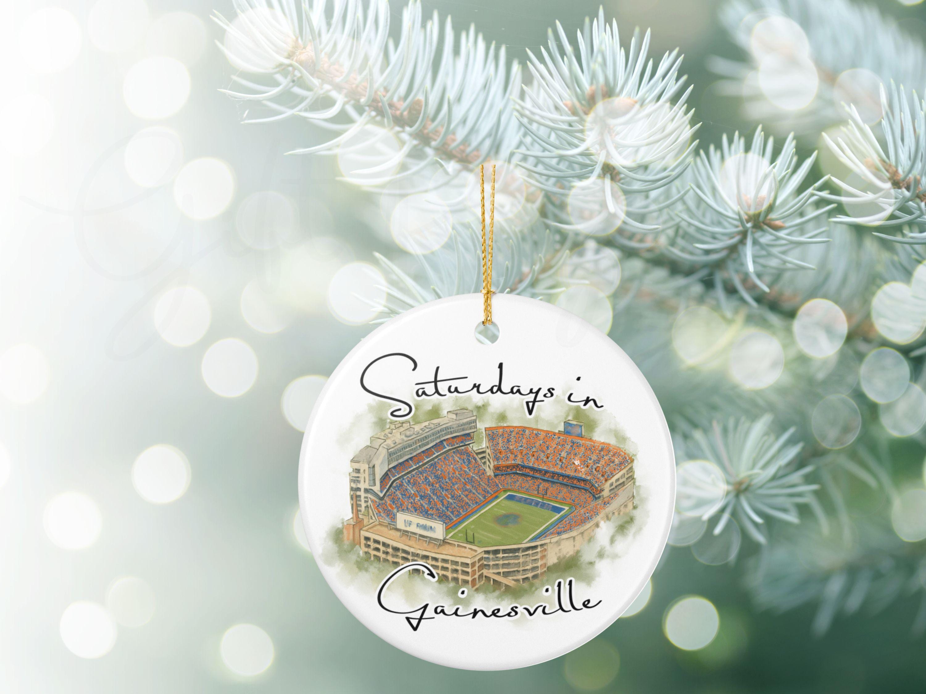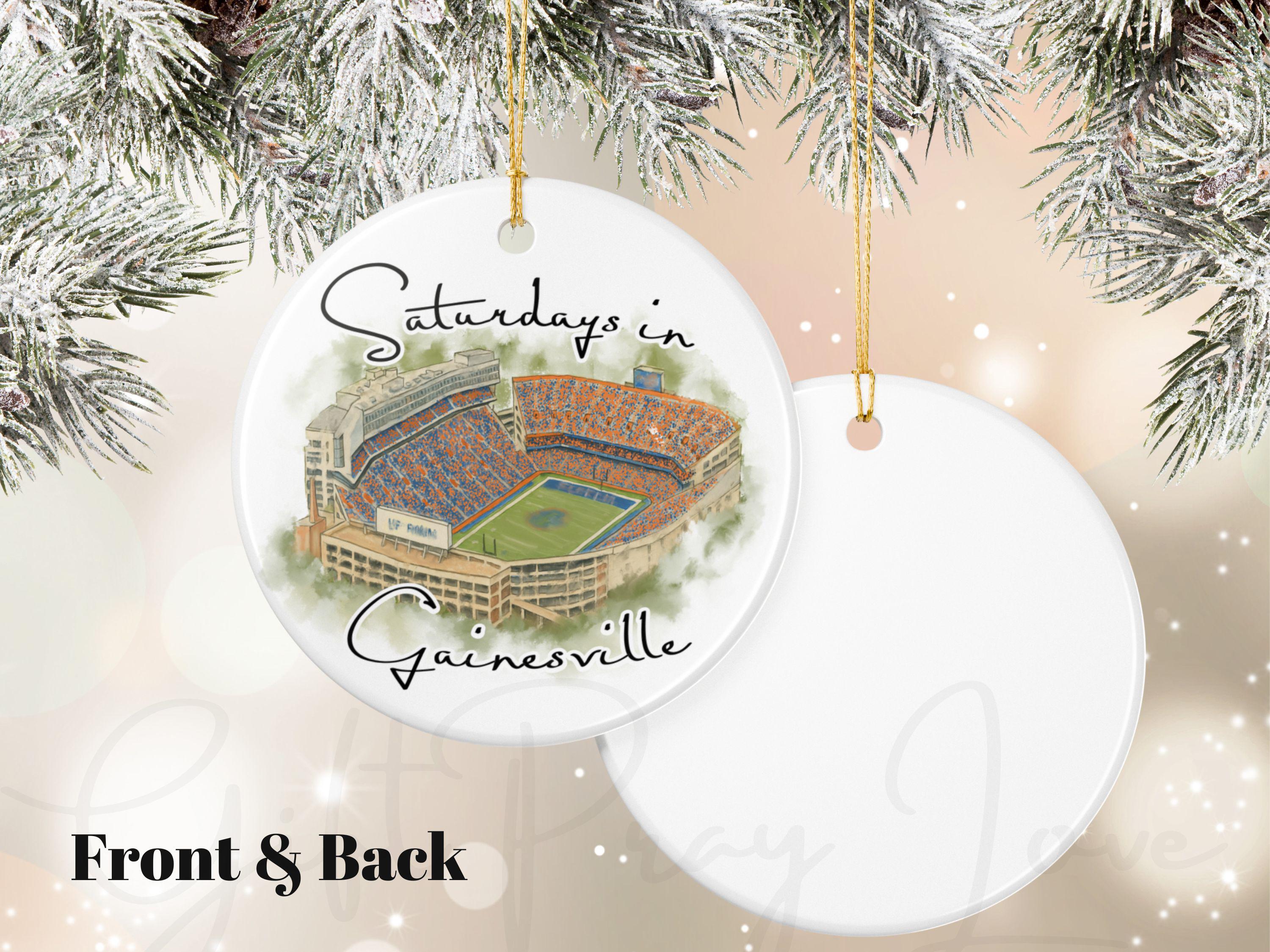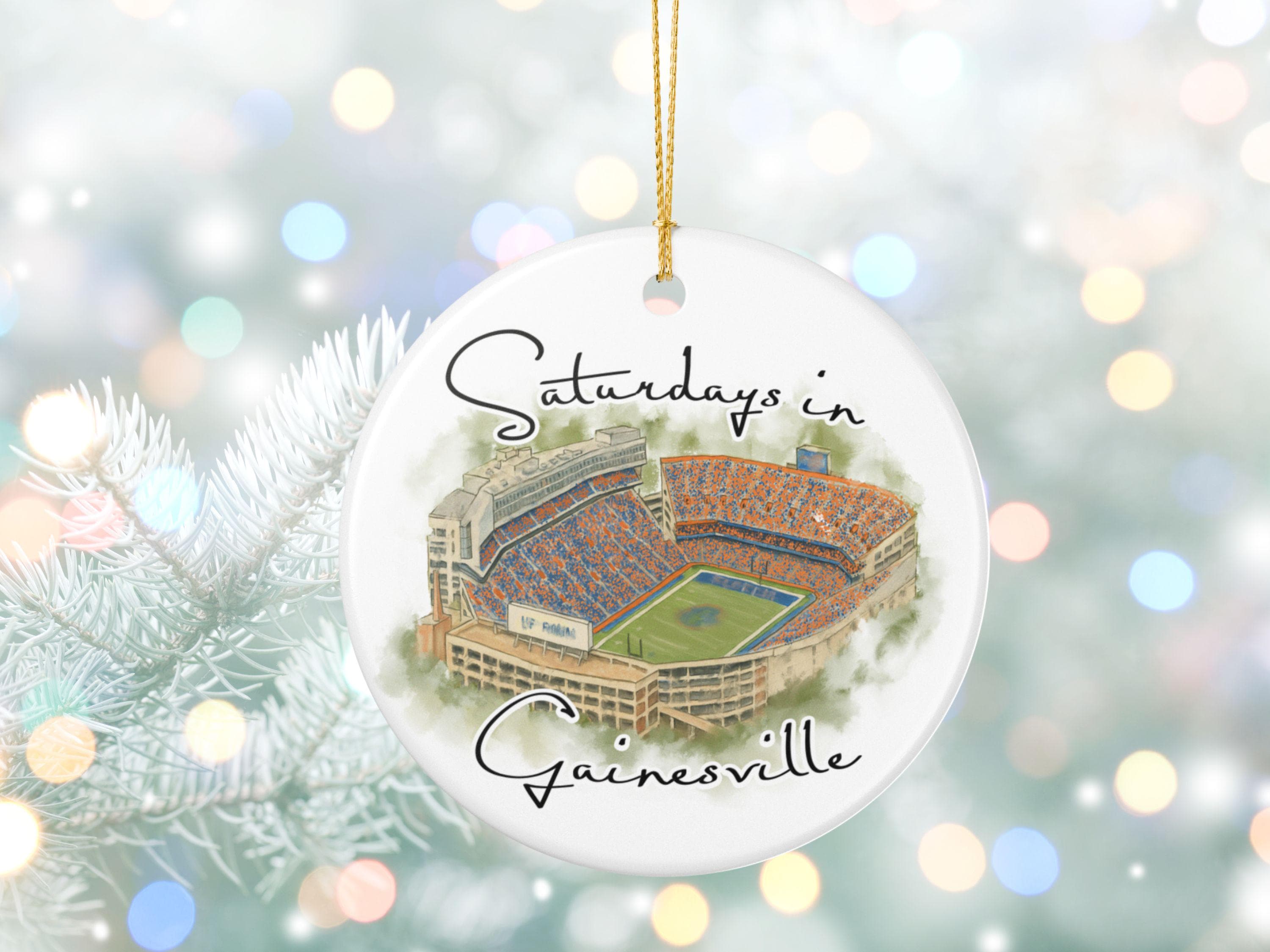 This piece blends watercolor art, college-town nostalgia, and modern minimalist design, creating a keepsake that stands out on any Christmas tree. Whether celebrating a first season in Gainesville, reminiscing about college days, or gifting to a devoted fan, this ornament is a cherished reminder of unforgettable Saturdays.