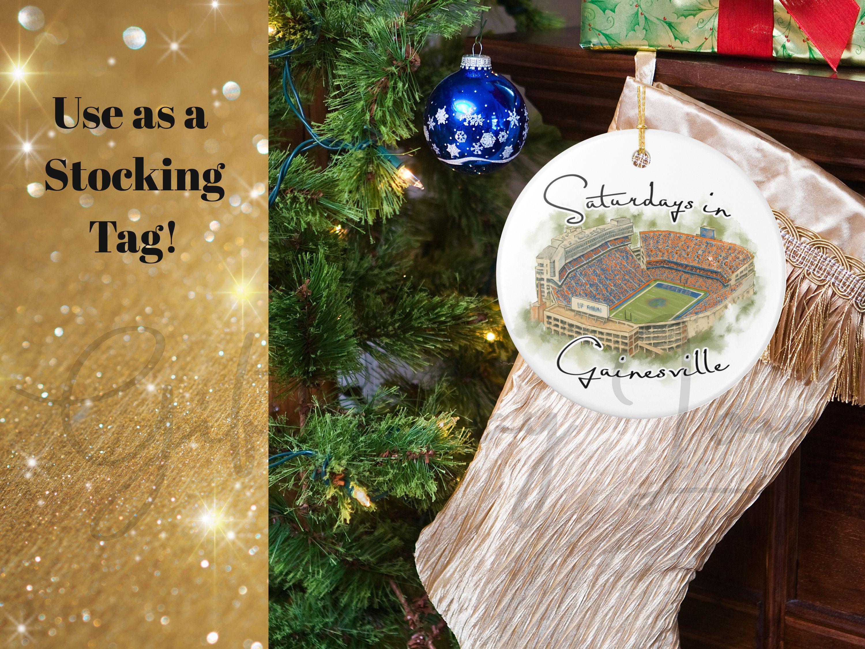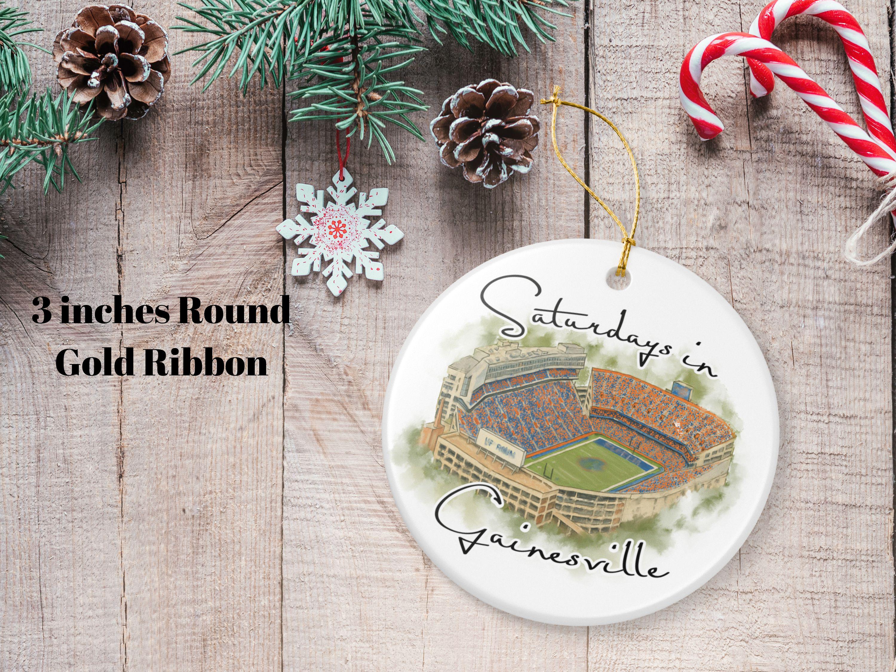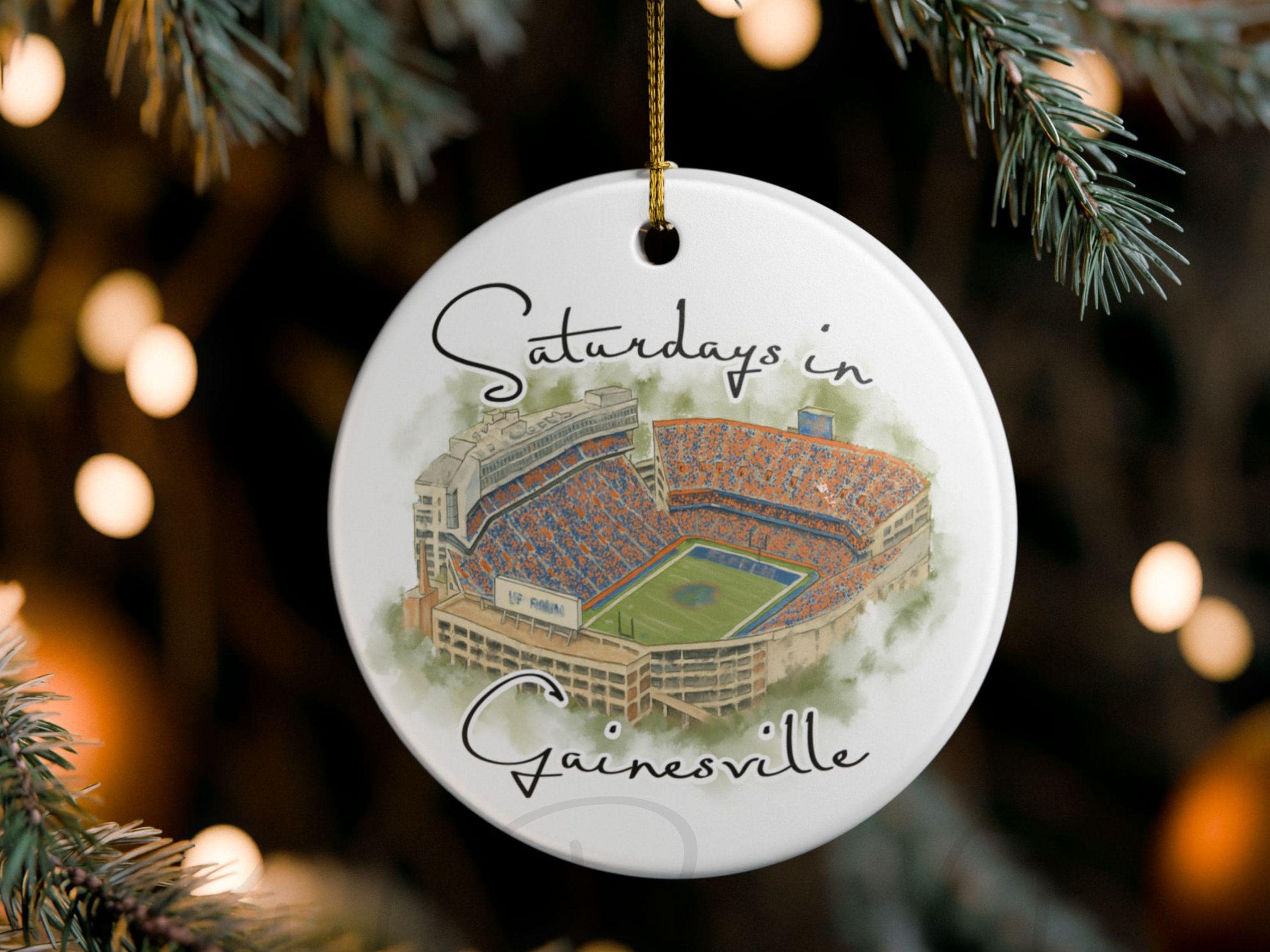 This piece blends watercolor art, college-town nostalgia, and modern minimalist design, creating a keepsake that stands out on any Christmas tree. Whether celebrating a first season in Gainesville, reminiscing about college days, or gifting to a devoted fan, this ornament is a cherished reminder of unforgettable Saturdays.