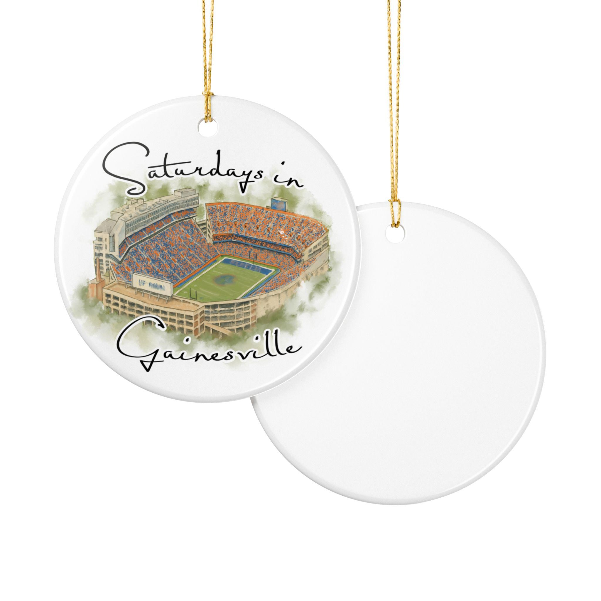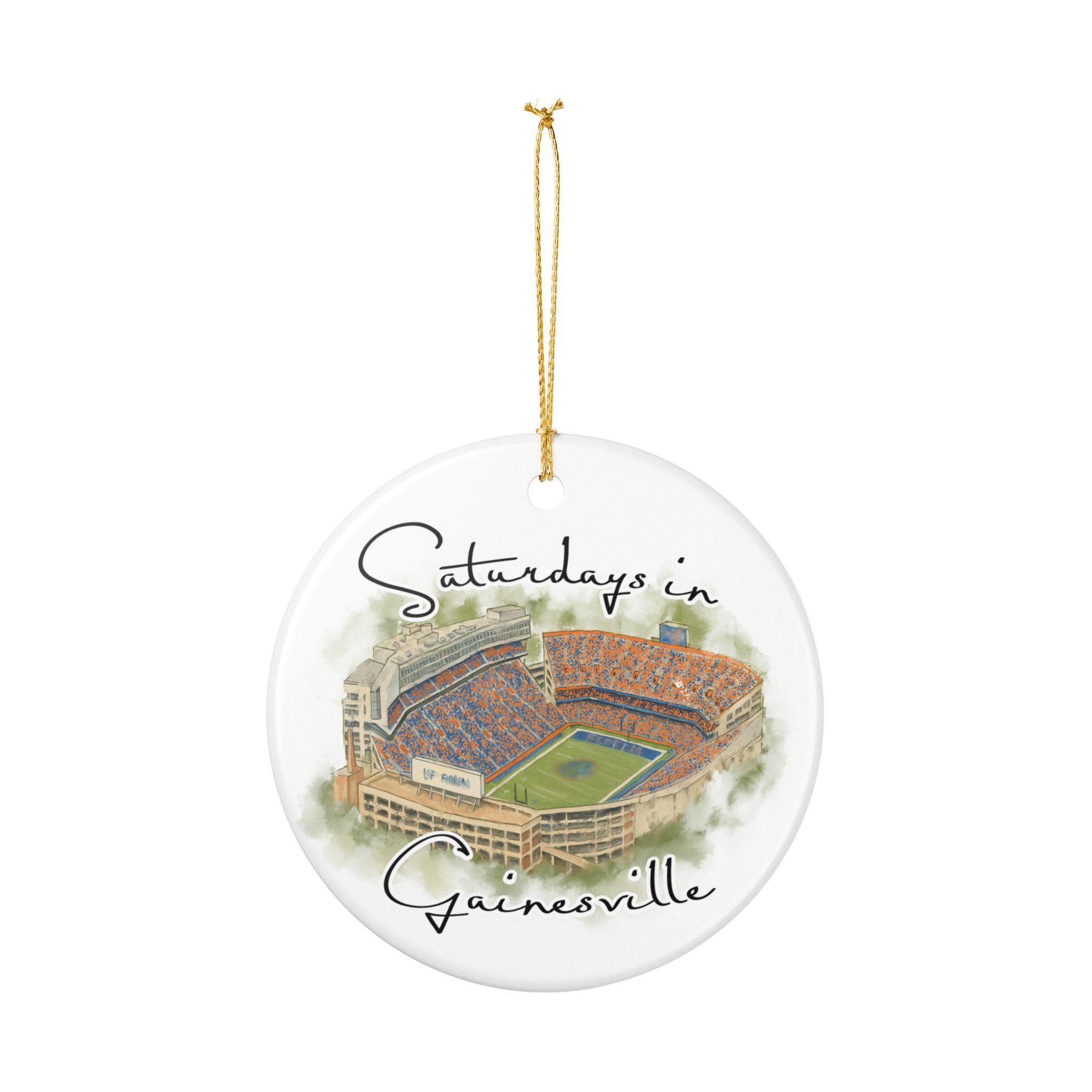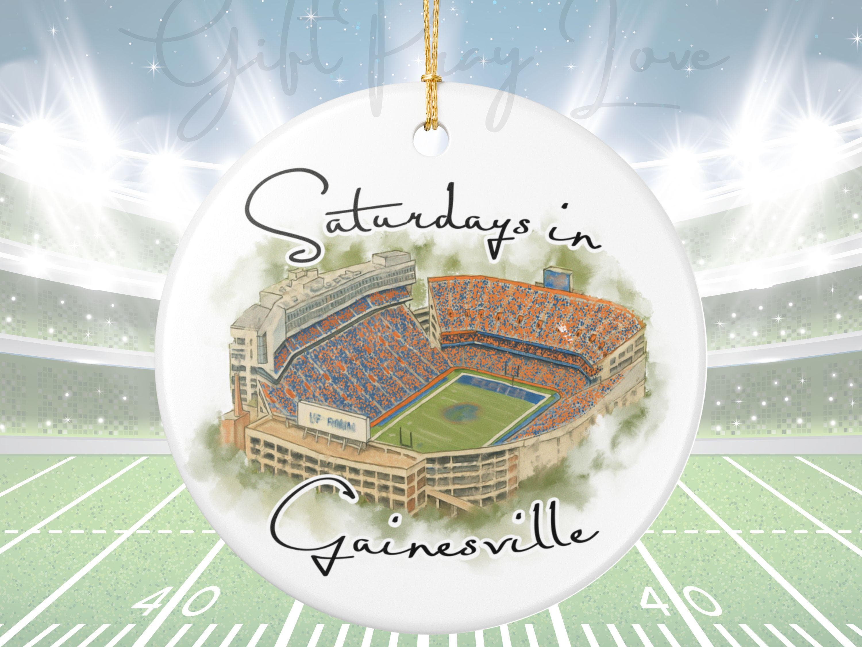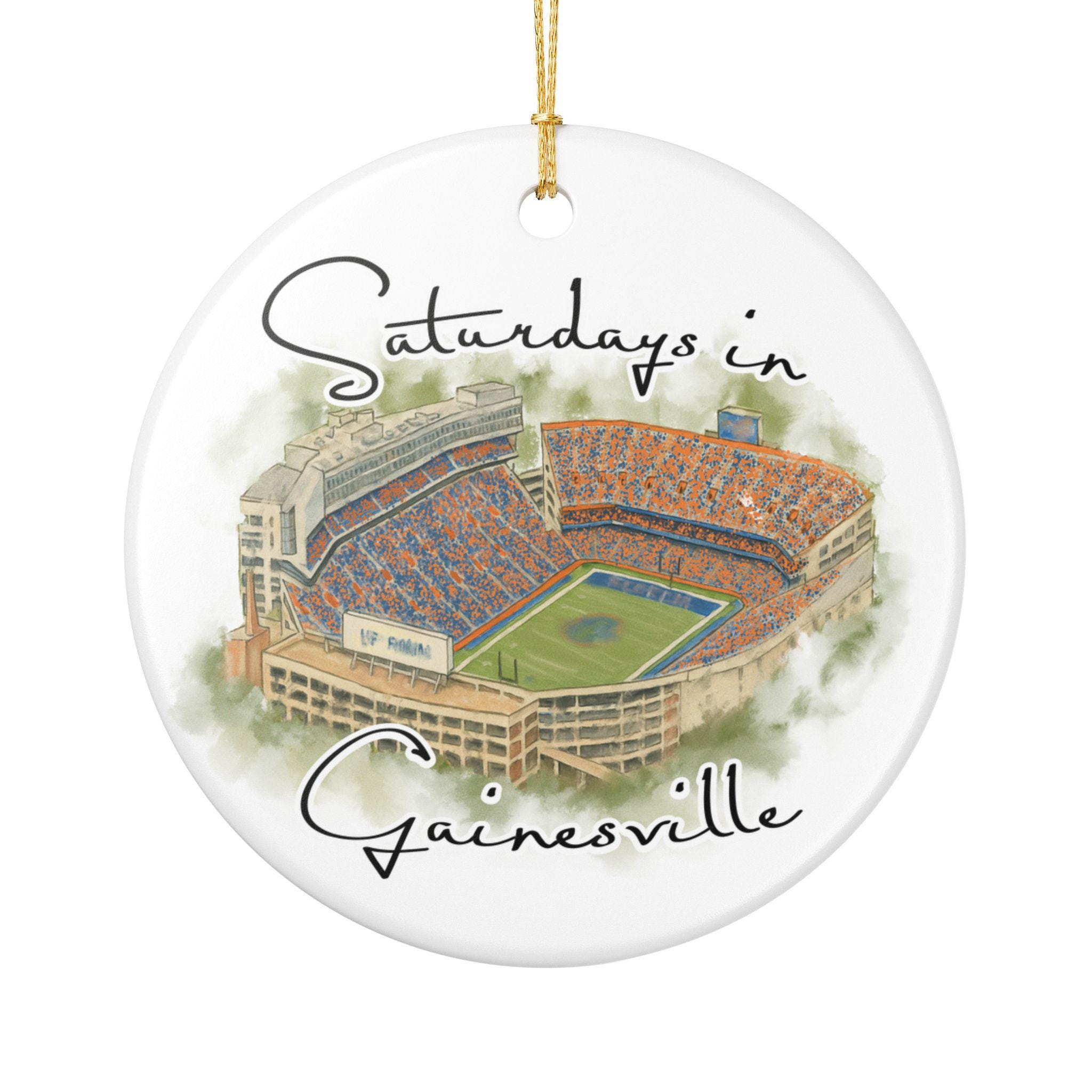 Celebrate the spirit of Saturdays in Gainesville with this beautifully illustrated watercolor stadium ornament. Featuring an artistic aerial view of Gainesville’s iconic game-day scene at the Swamp, this ceramic ornament captures the energy, colors, and tradition that Florida fans love. Printed with high-resolution artwork on a smooth, glossy finish, it makes the perfect keepsake for holiday decorating, year-round display, or gifting to any Gainesville football lover.