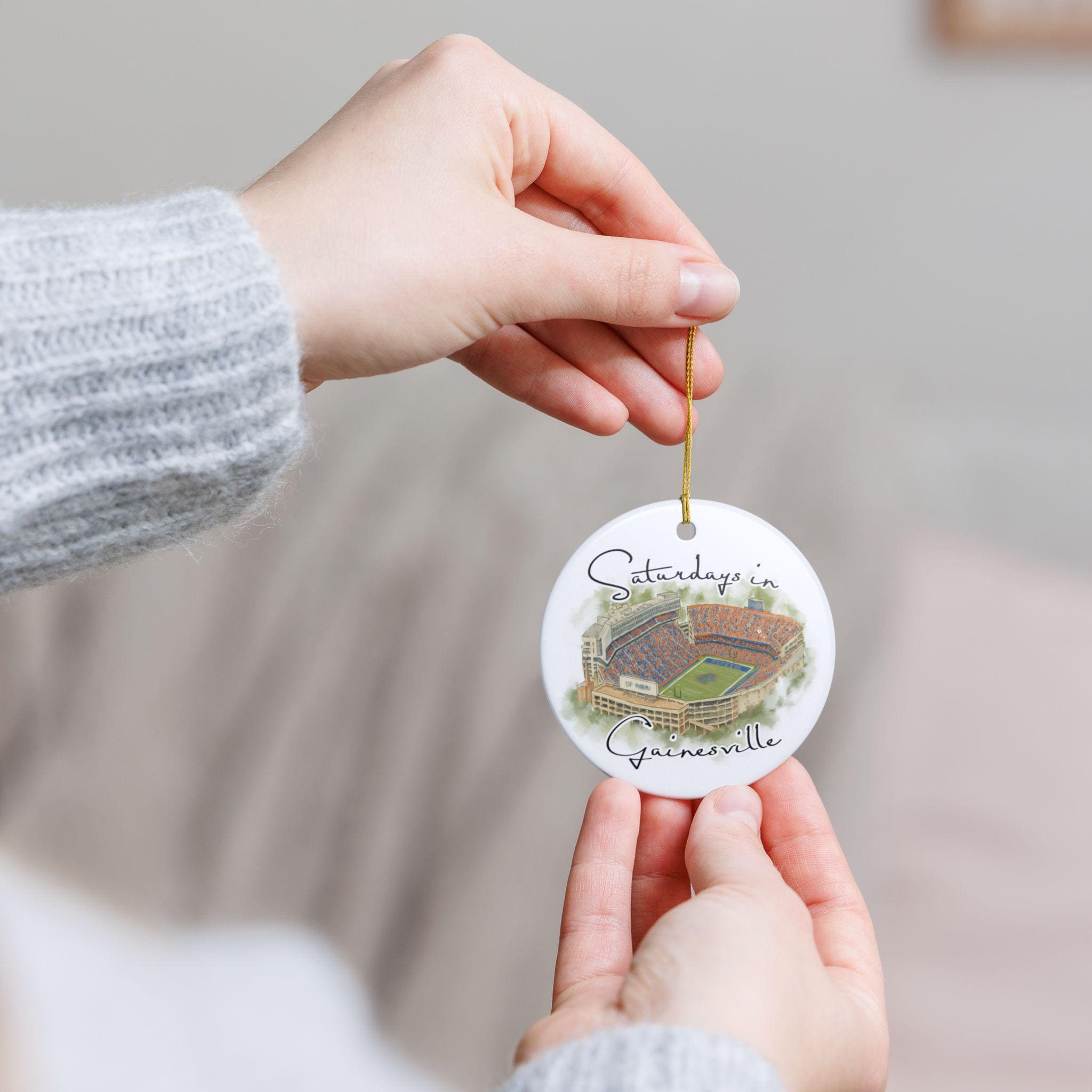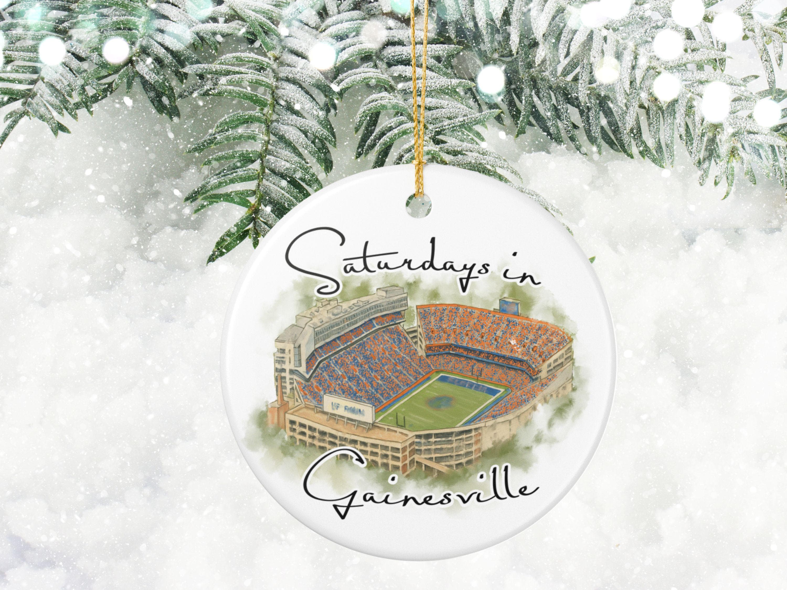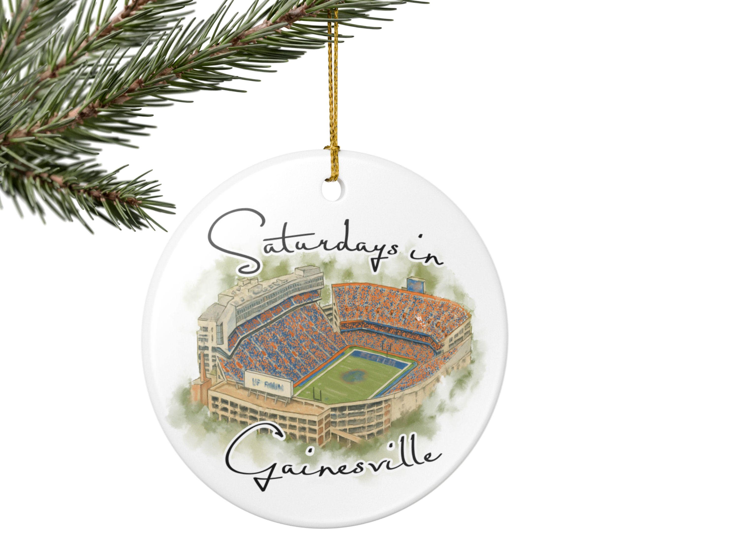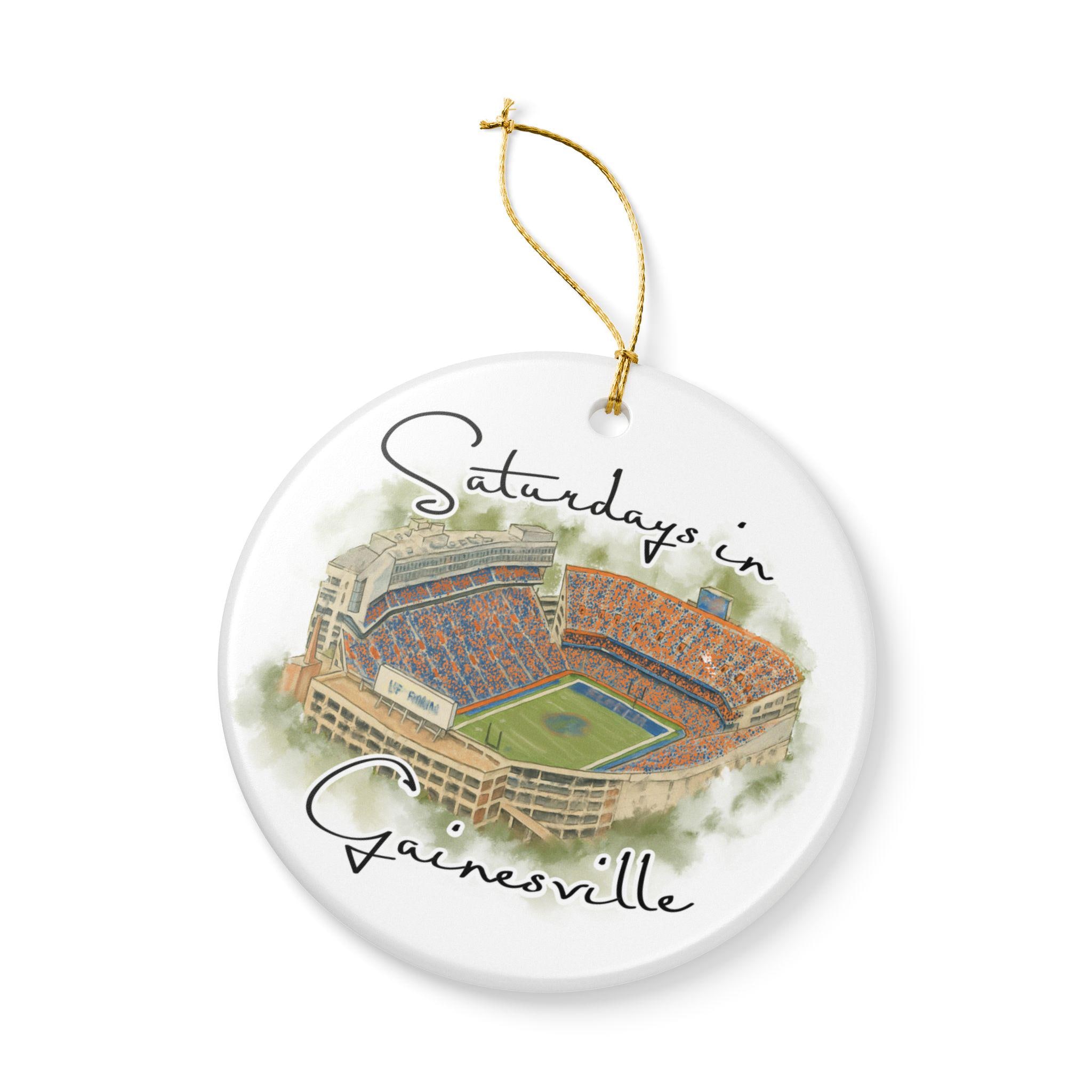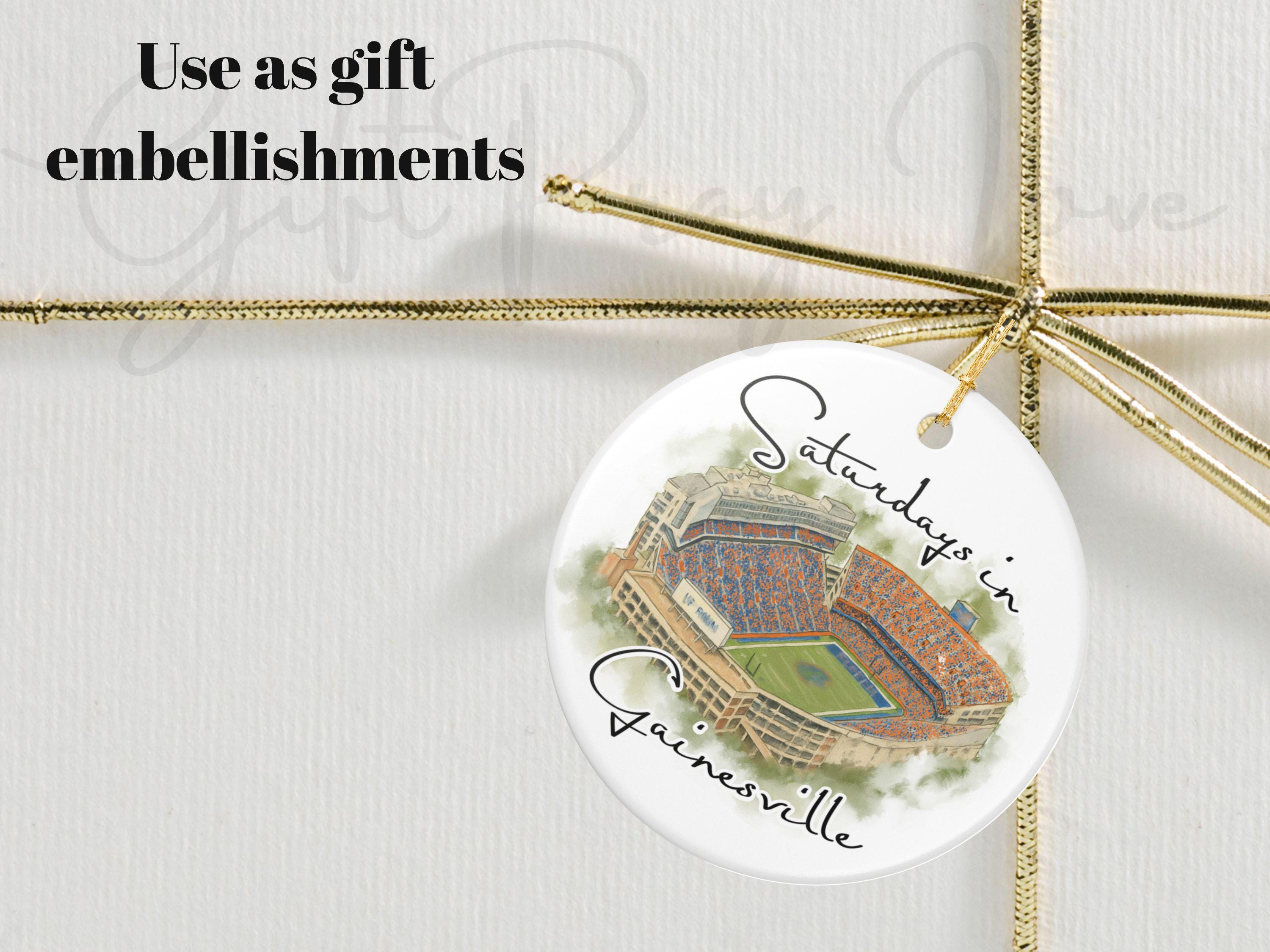 Celebrate the spirit of Saturdays in Gainesville with this beautifully illustrated watercolor stadium ornament. Featuring an artistic aerial view of Gainesville’s iconic game-day scene at the Swamp, this ceramic ornament captures the energy, colors, and tradition that Florida fans love. Printed with high-resolution artwork on a smooth, glossy finish, it makes the perfect keepsake for holiday decorating, year-round display, or gifting to any Gainesville football lover.