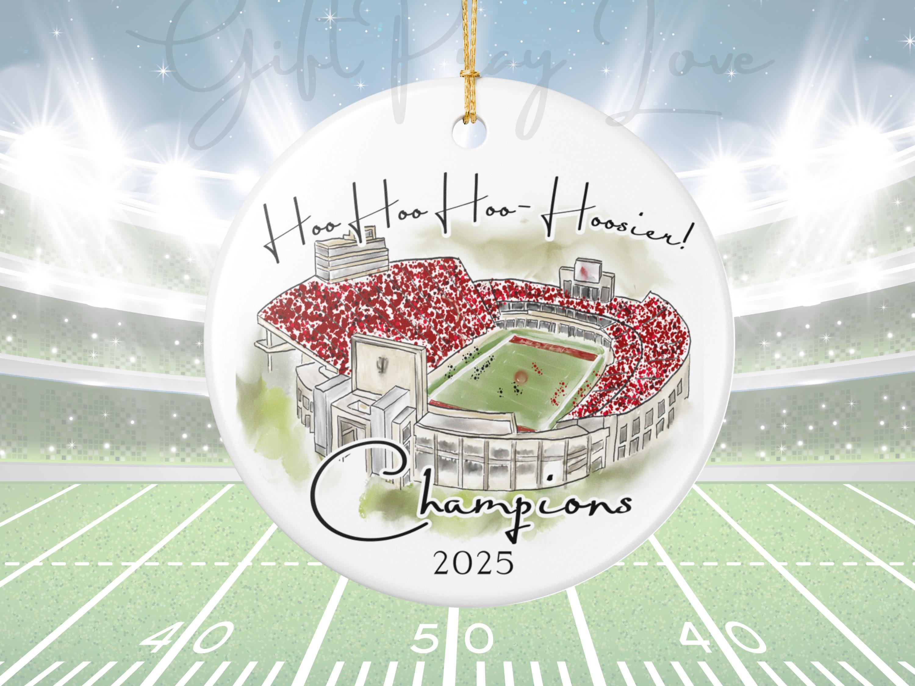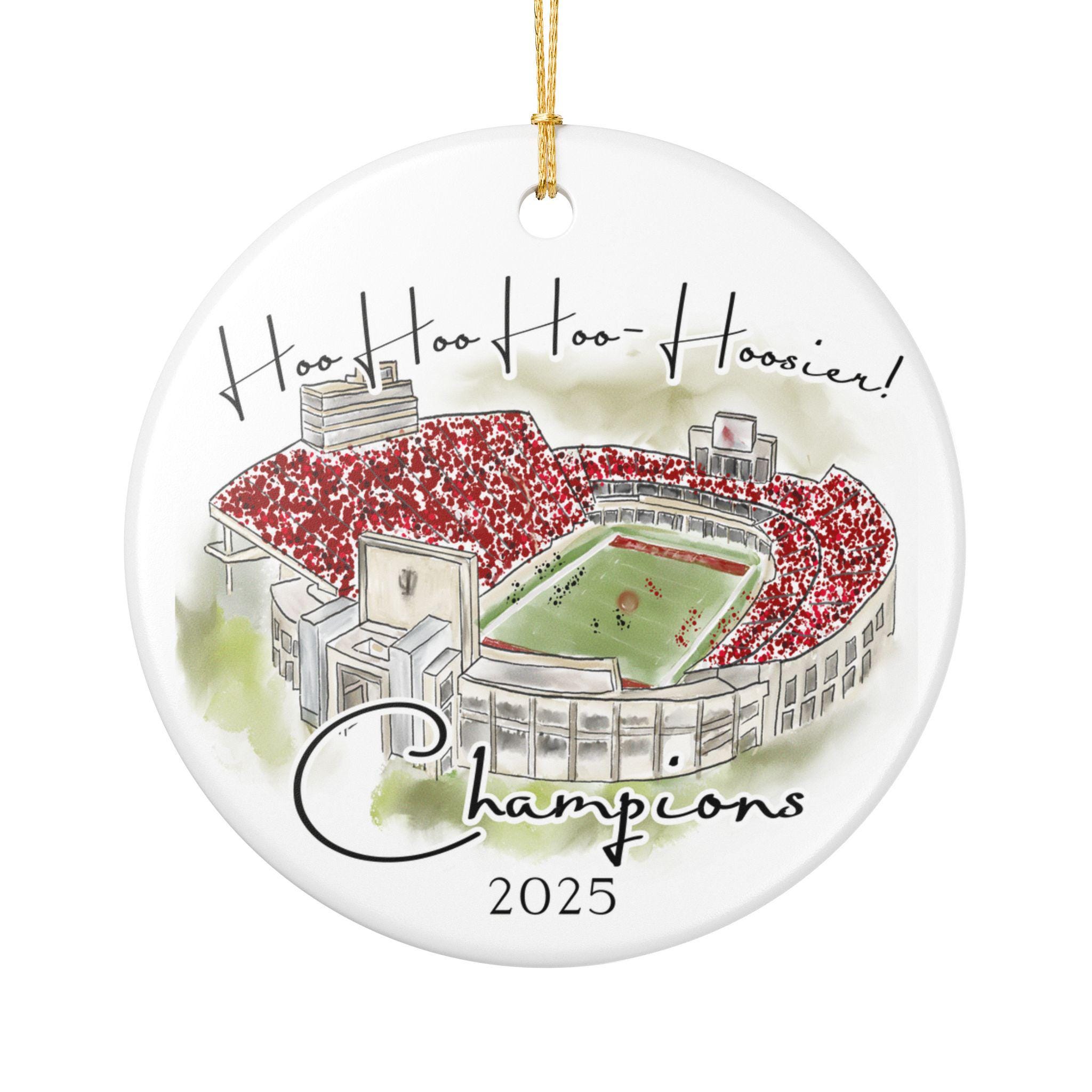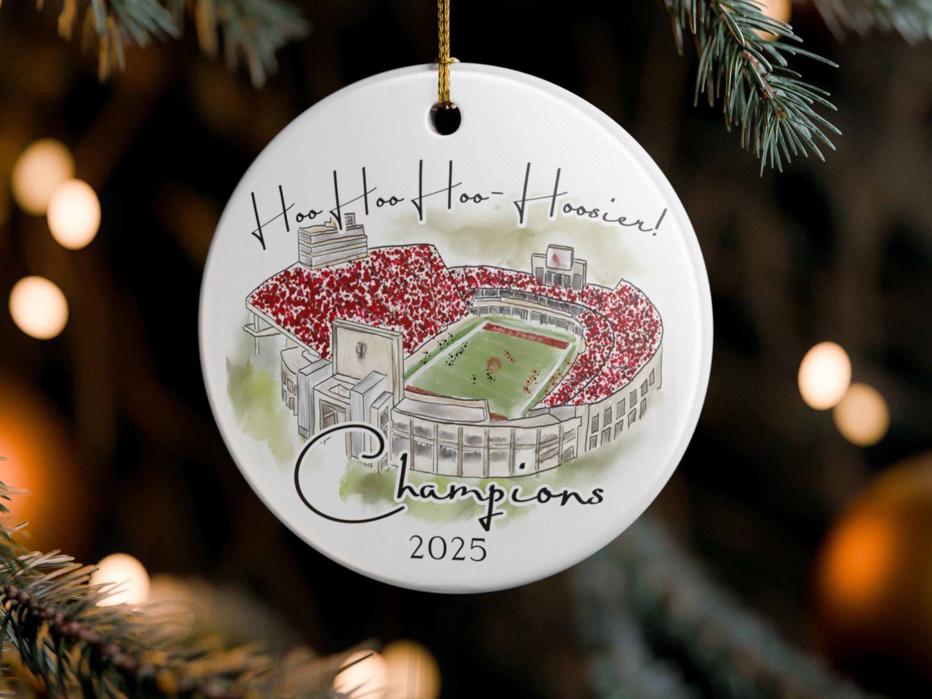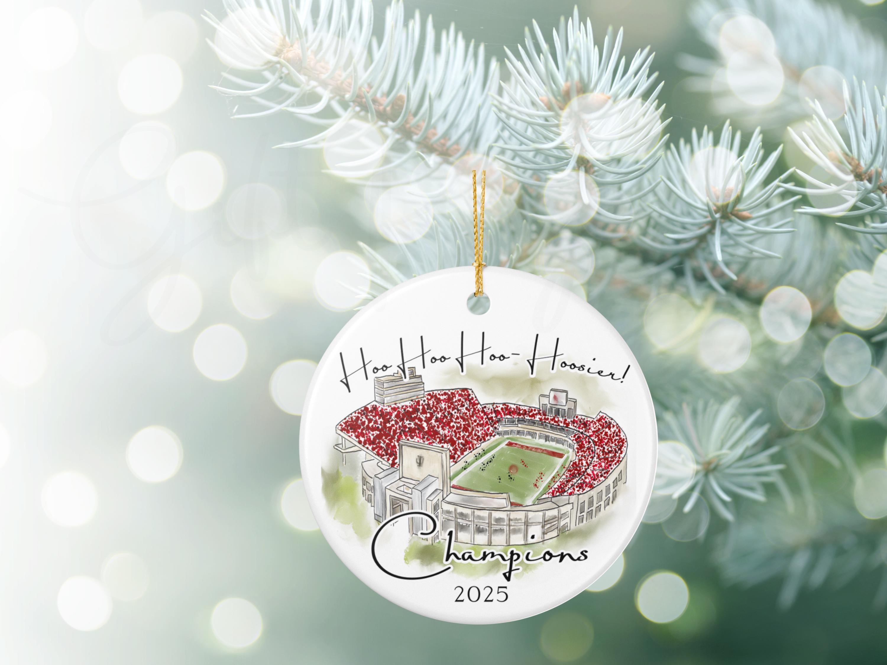 Celebrate a historic season with this Indiana 2025 Big 10 Champions ornament, featuring a handcrafted watercolor illustration of the iconic stadium packed in red. The spirited phrase “Hoo Hoo Hoo–Hoosier!” adds game-day energy, making this ornament the perfect keepsake for Indiana fans, alumni, students, and anyone who loves Bloomington football traditions.