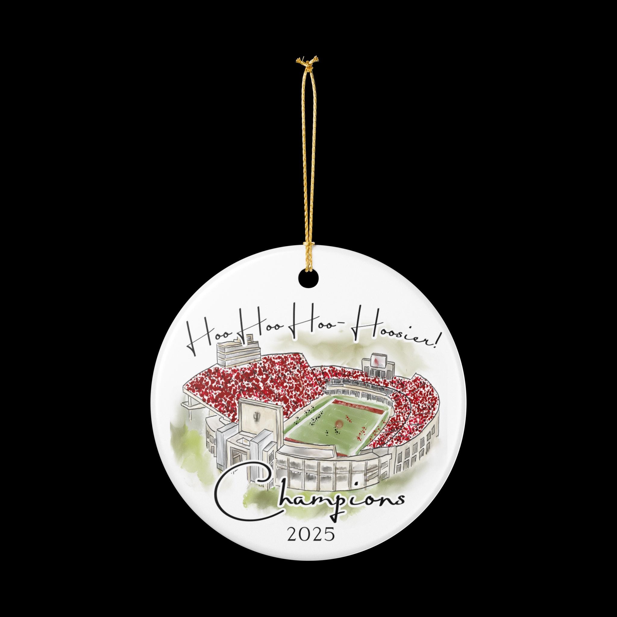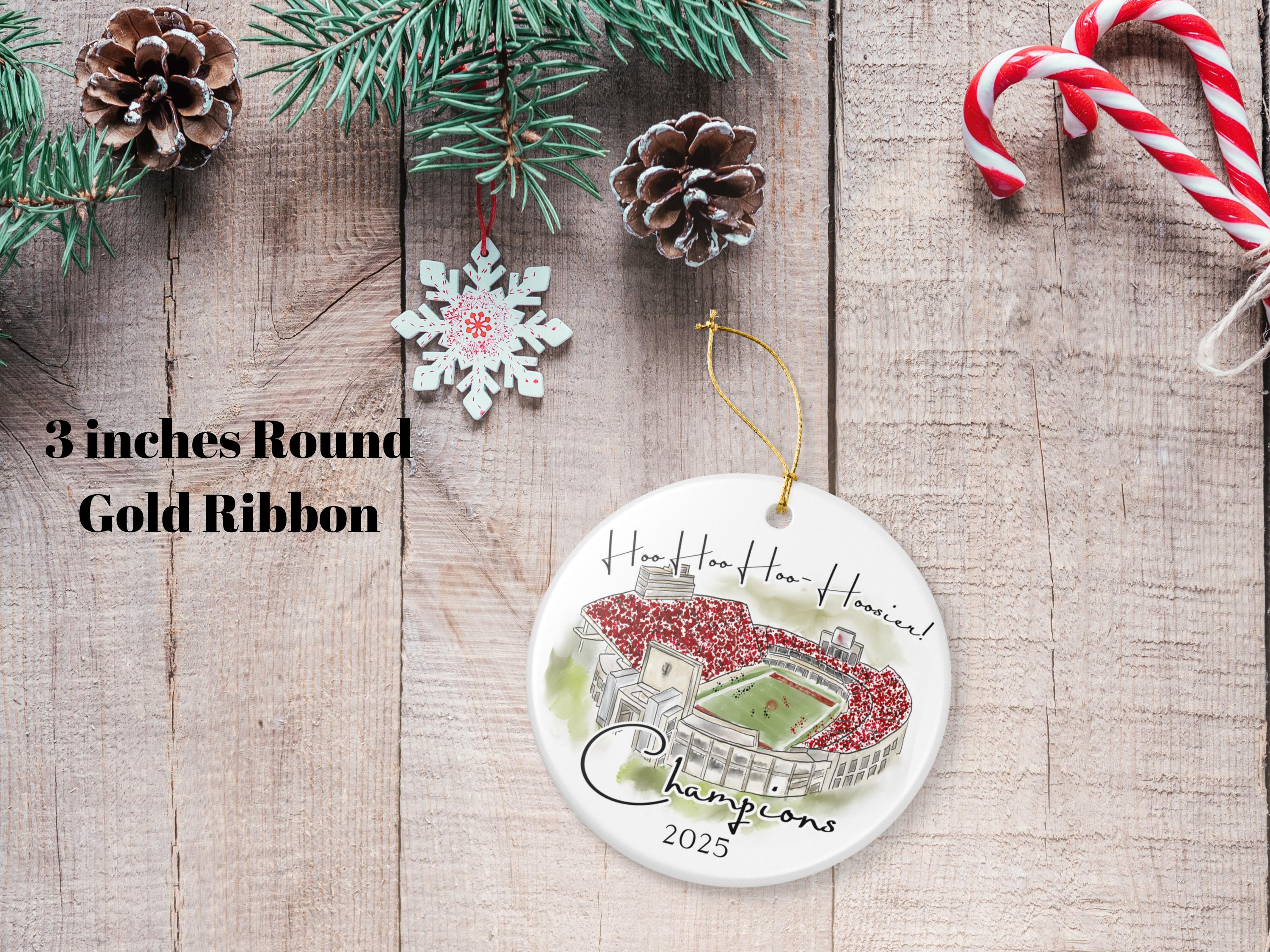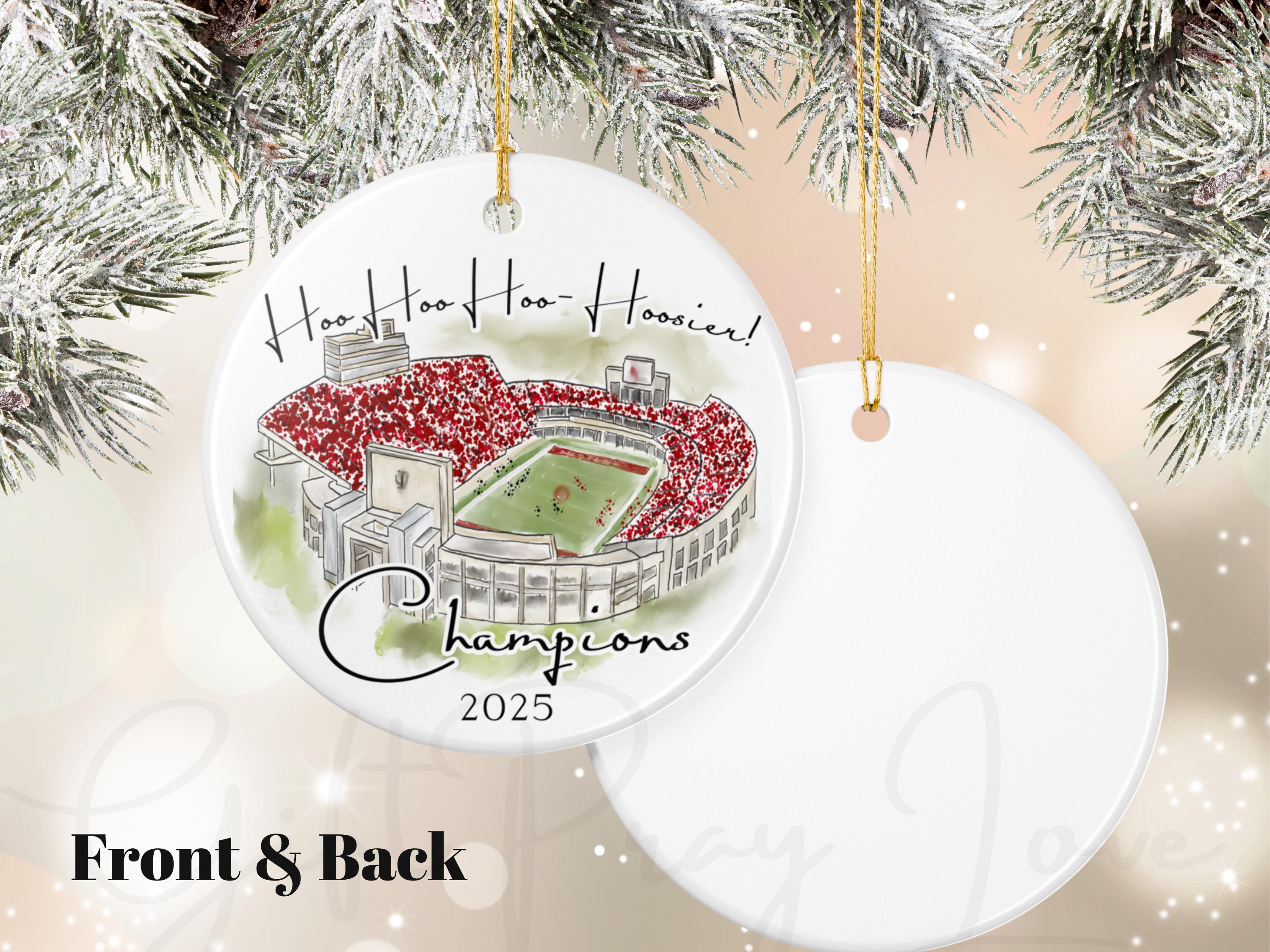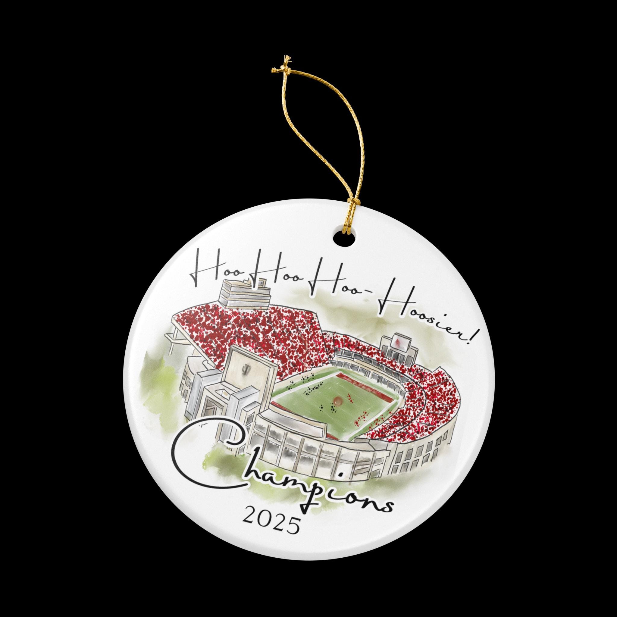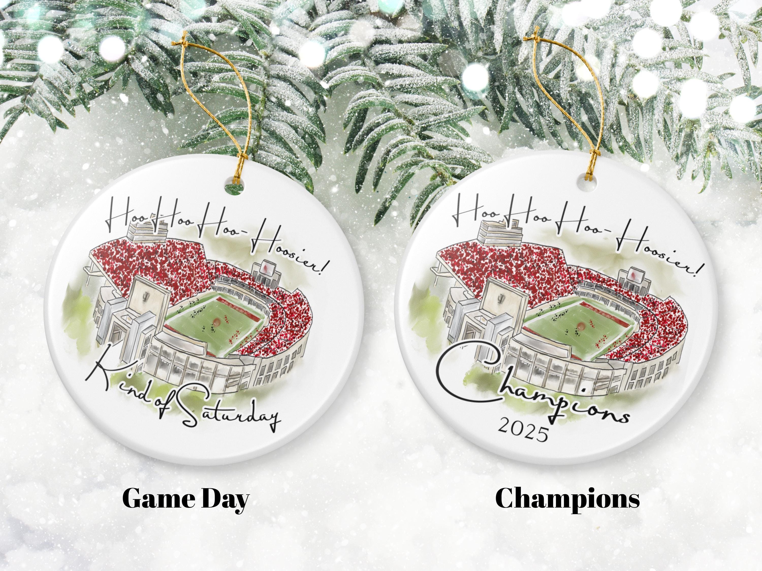 Celebrate a historic season with this Indiana 2025 Big 10 Champions ornament, featuring a handcrafted watercolor illustration of the iconic stadium packed in red. The spirited phrase “Hoo Hoo Hoo–Hoosier!” adds game-day energy, making this ornament the perfect keepsake for Indiana fans, alumni, students, and anyone who loves Bloomington football traditions.