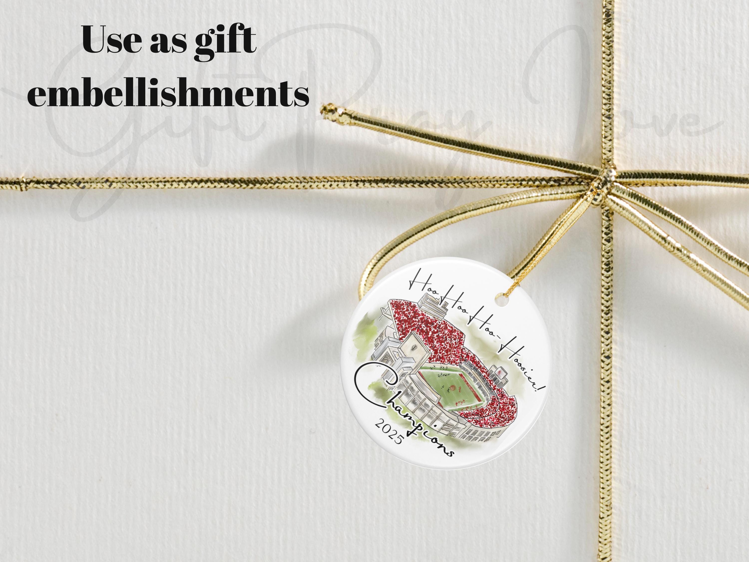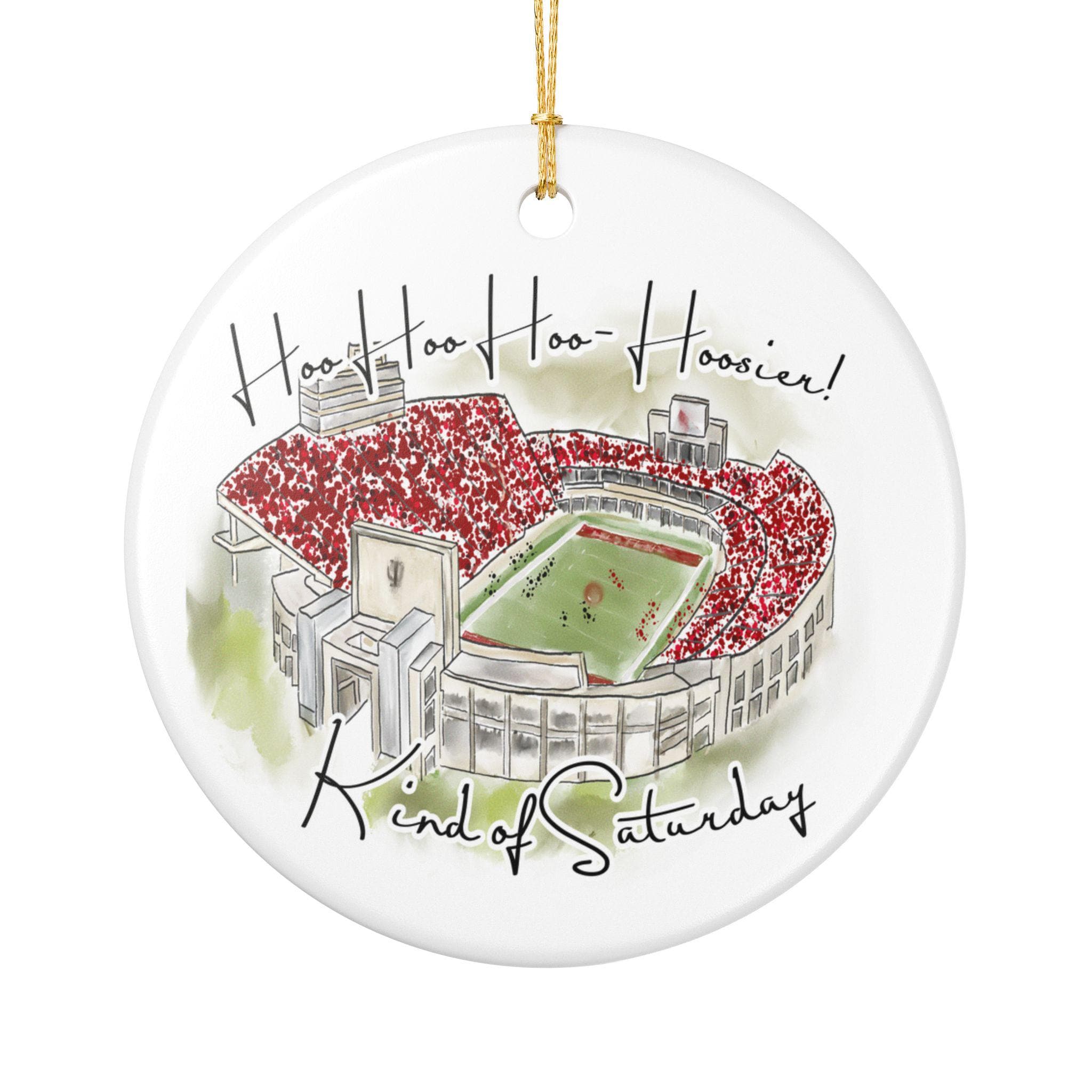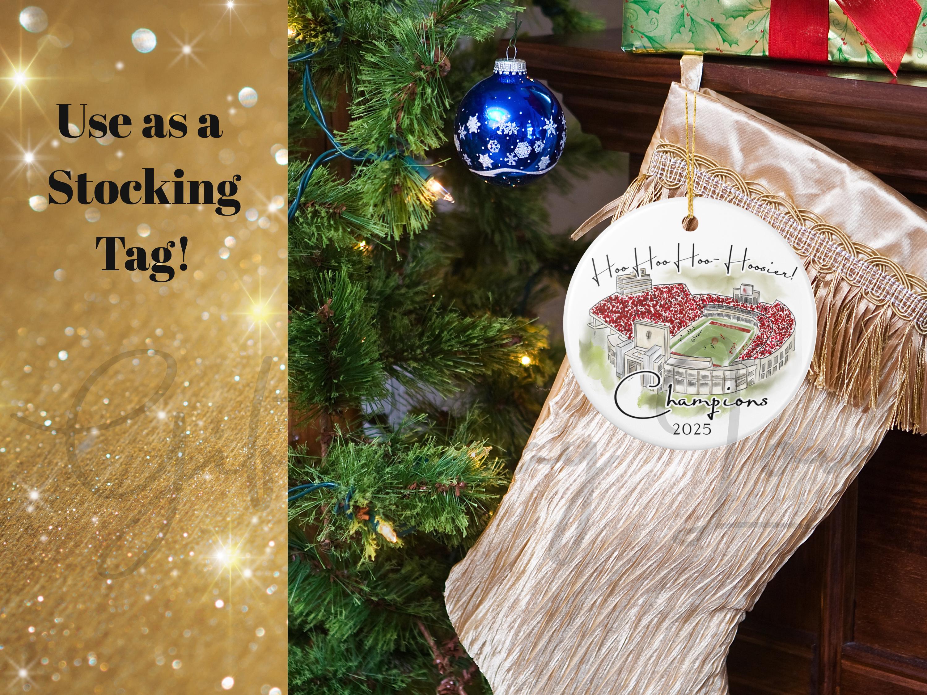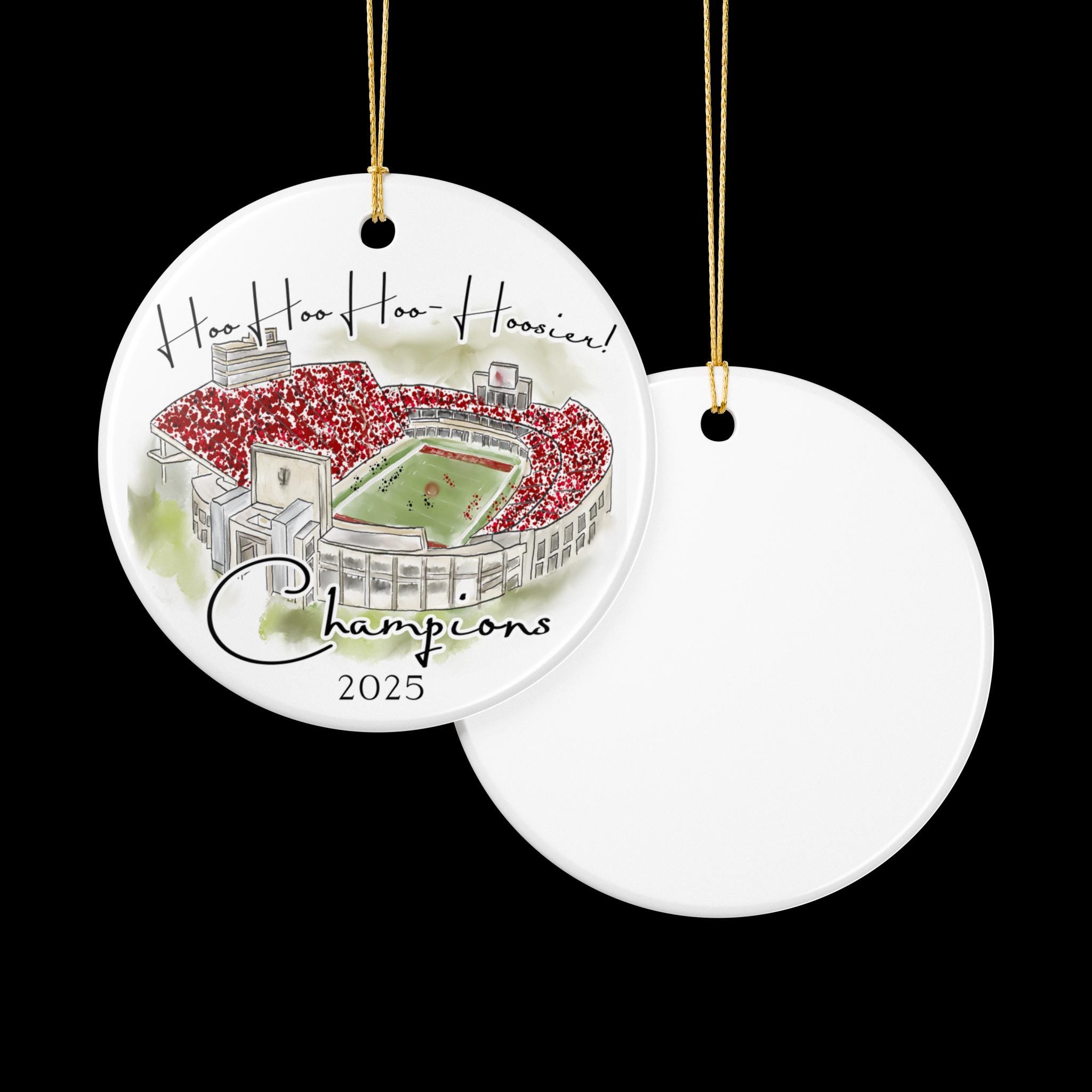 Celebrate a historic season with this Indiana 2025 Big 10 Champions ornament, featuring a handcrafted watercolor illustration of the iconic stadium packed in red. The spirited phrase “Hoo Hoo Hoo–Hoosier!” adds game-day energy, making this ornament the perfect keepsake for Indiana fans, alumni, students, and anyone who loves Bloomington football traditions.