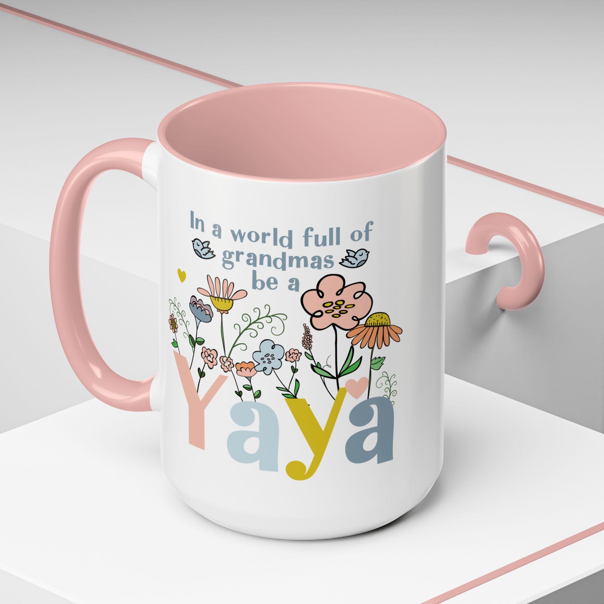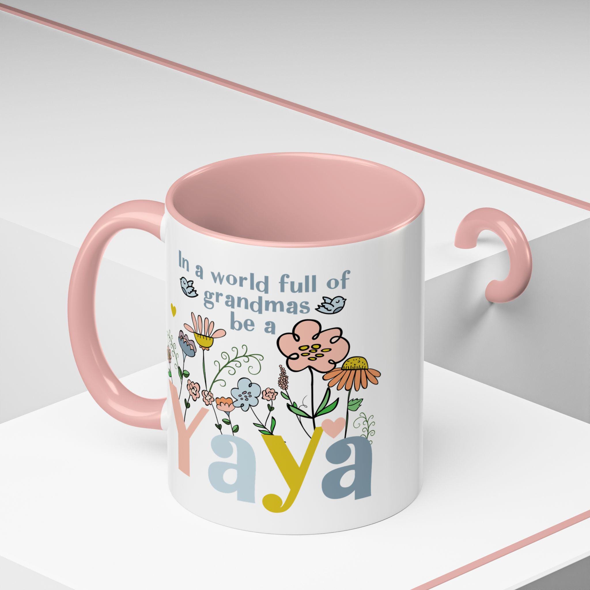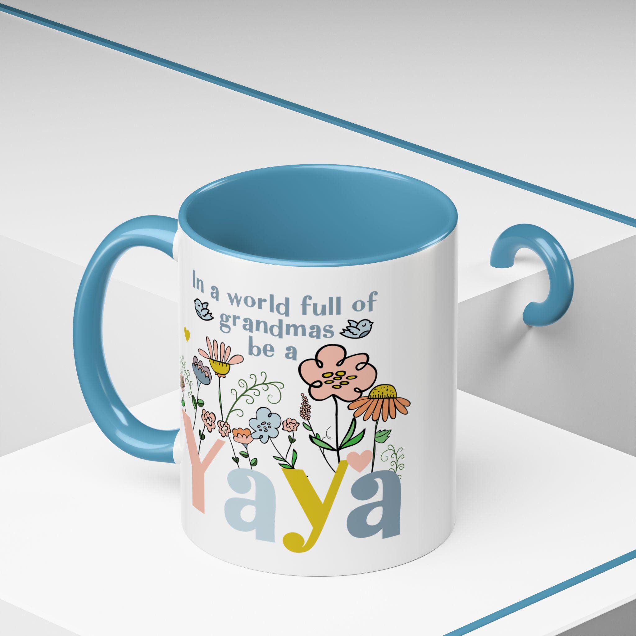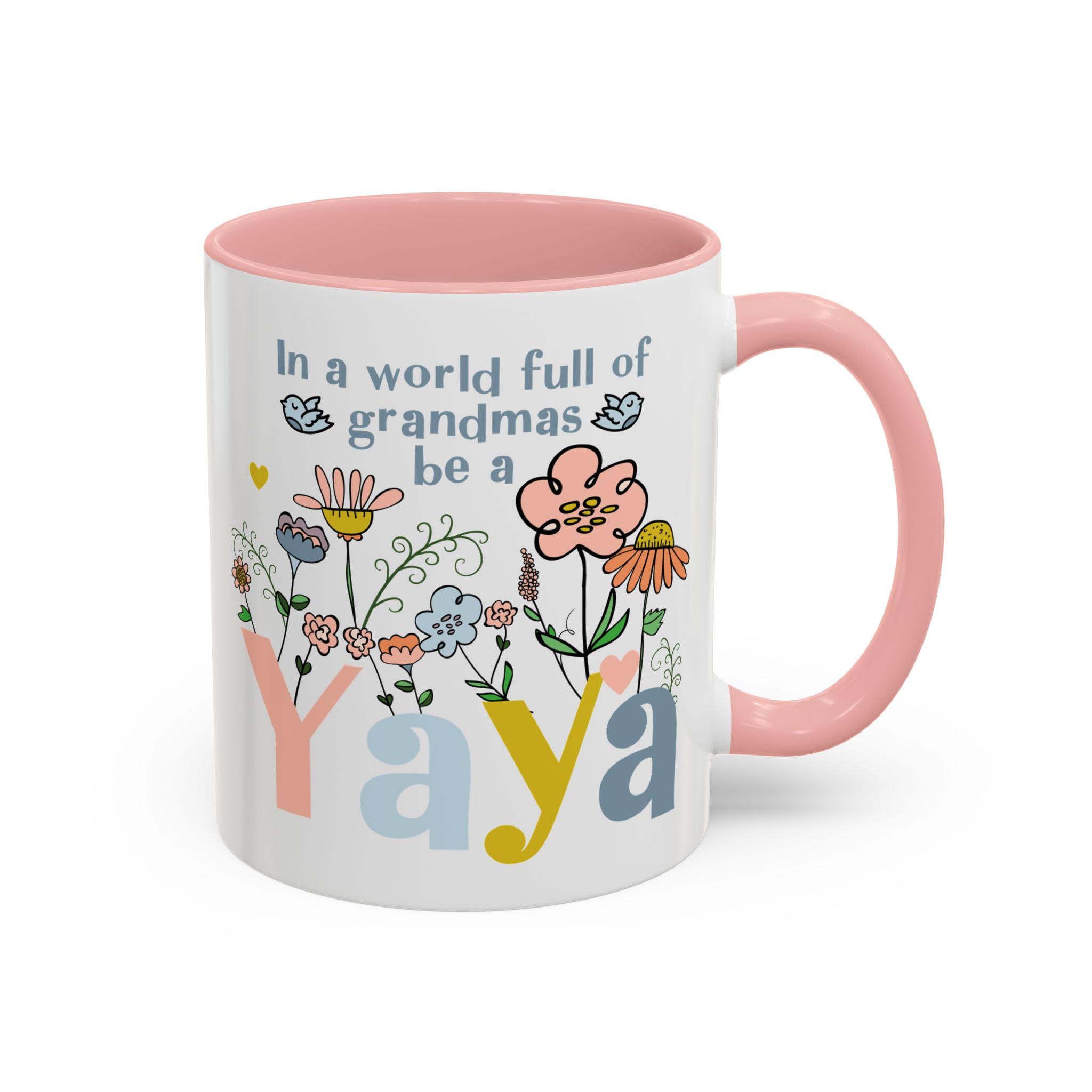 Brighten a beloved Yaya’s day with this cheerful floral coffee mug featuring the sweet and uplifting phrase “In a world full of grandmas, be a Yaya.” With soft pastel flowers, playful birds, and warm colors, this mug adds joy to every cup of coffee or tea.