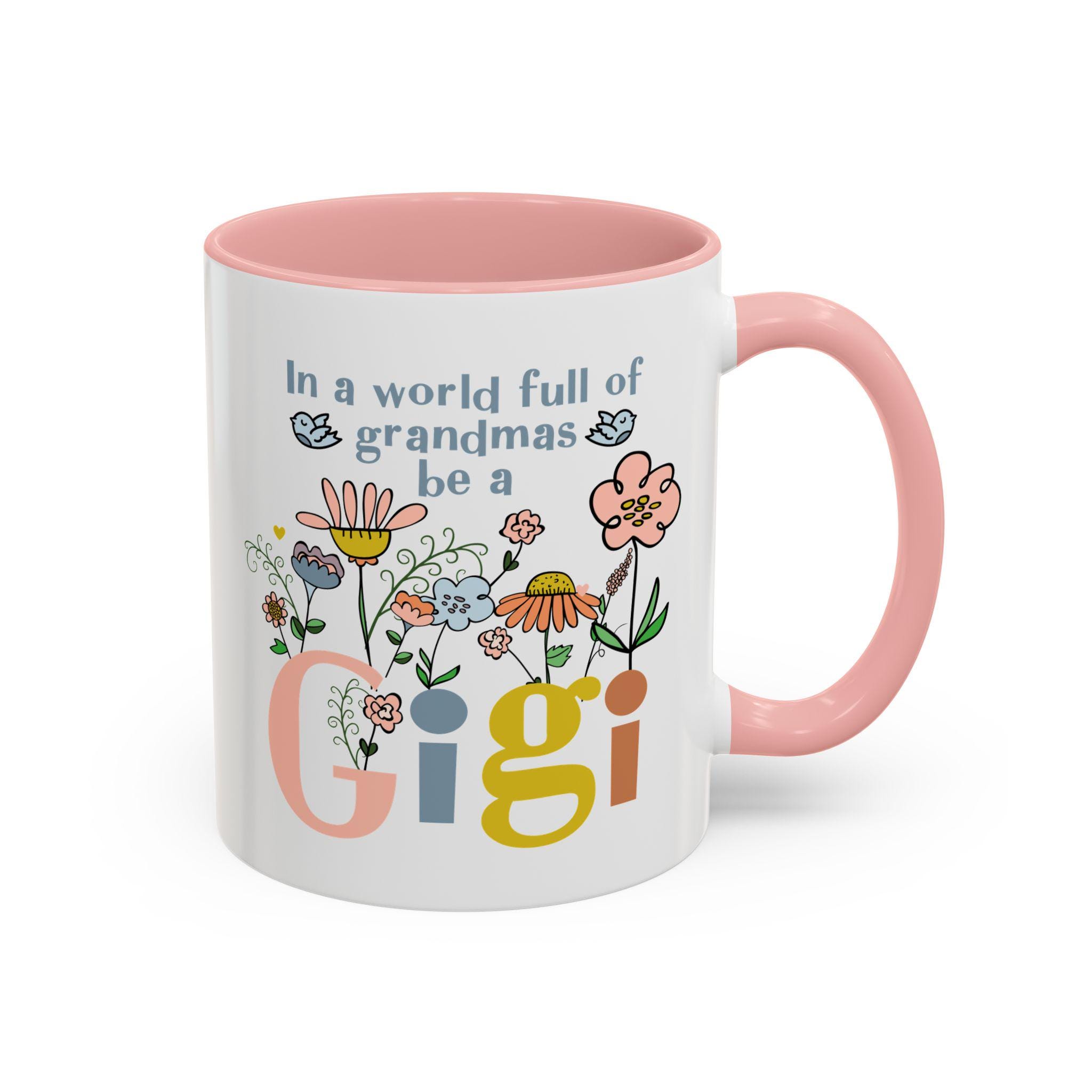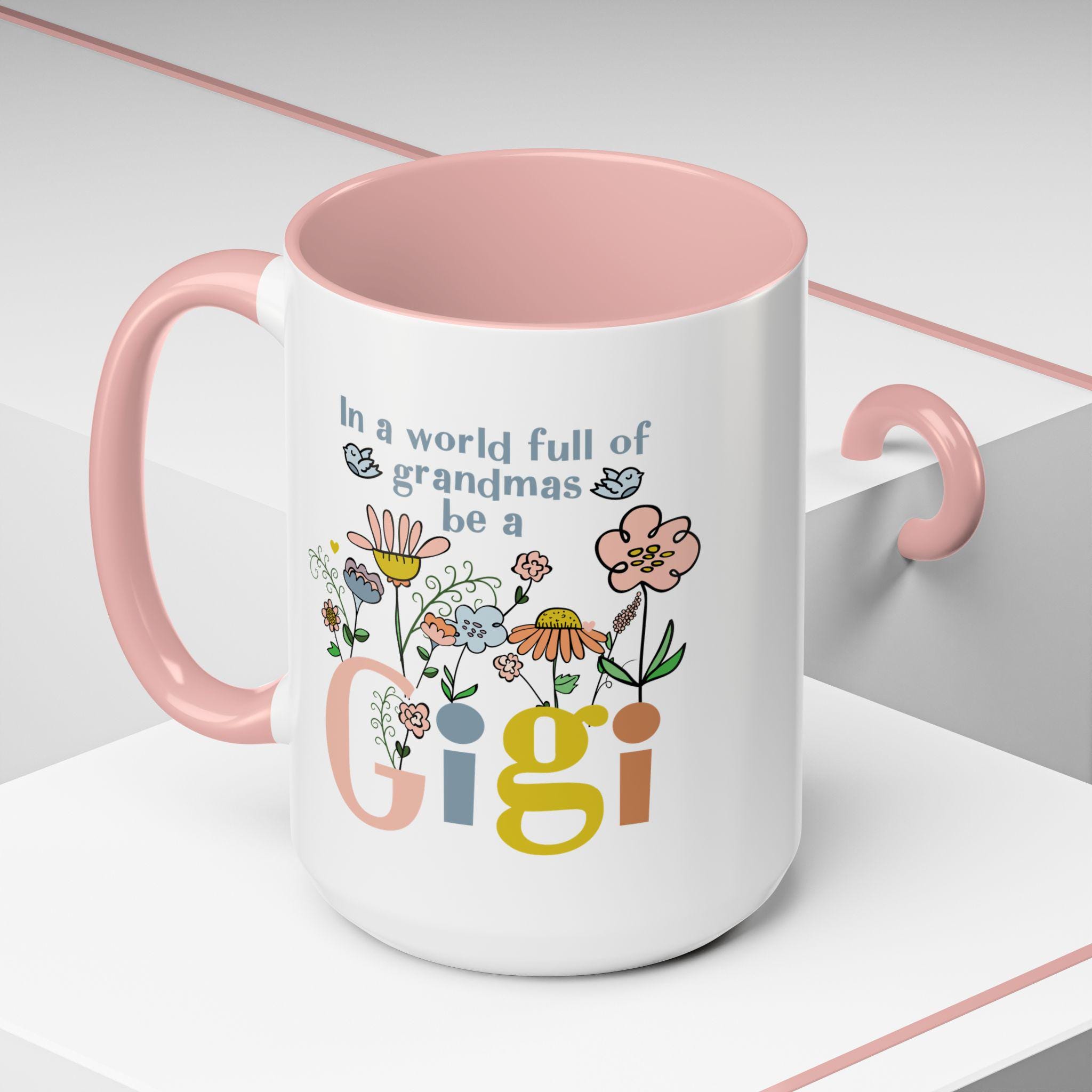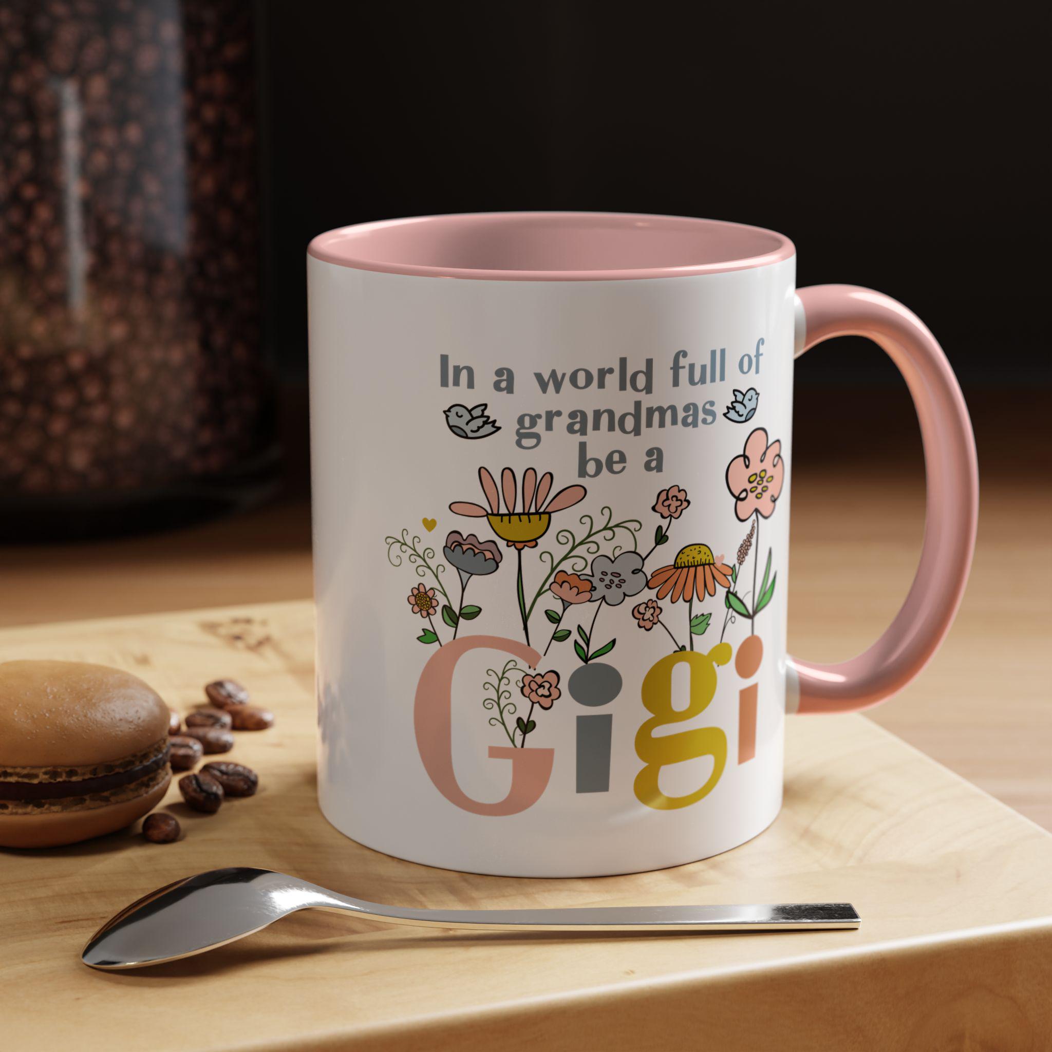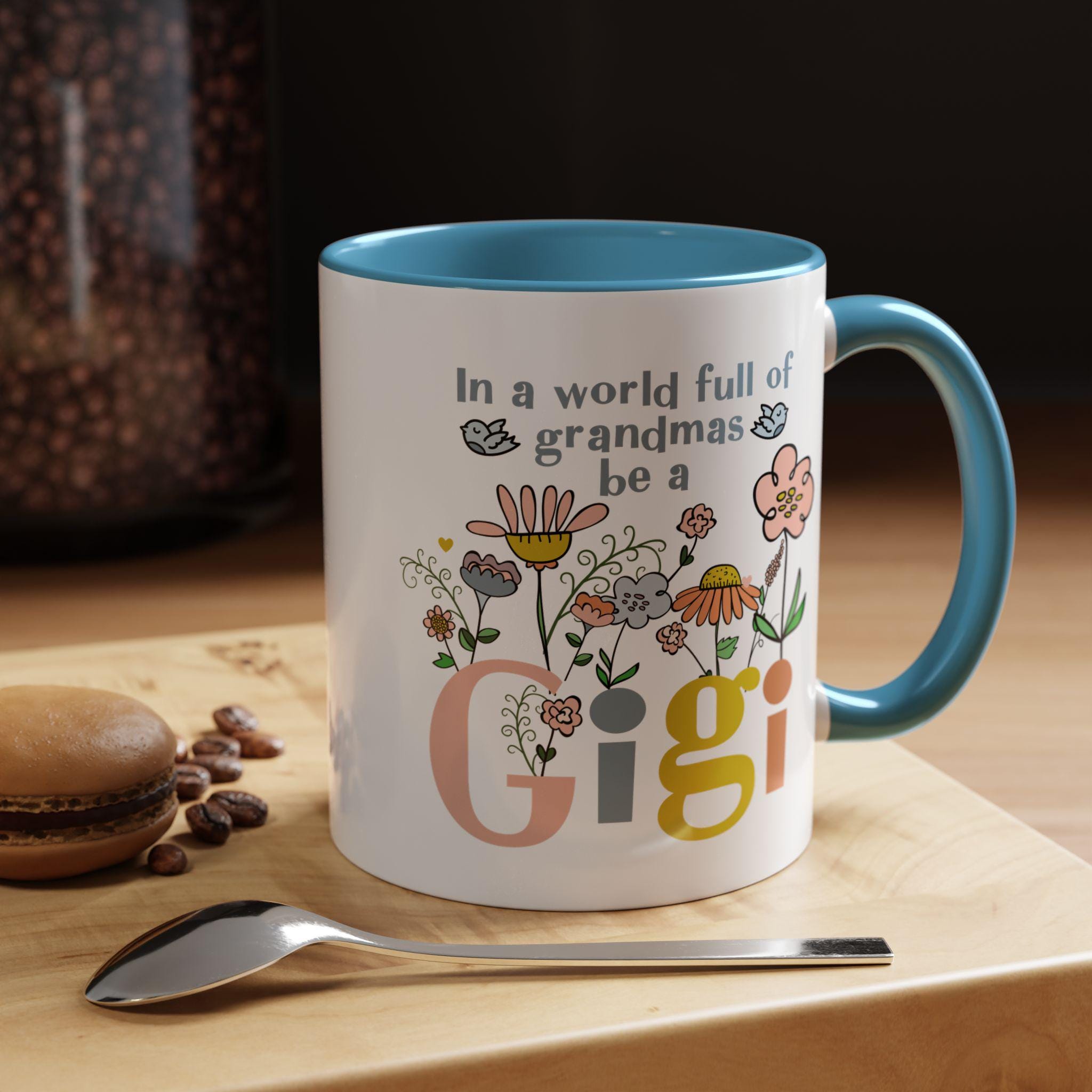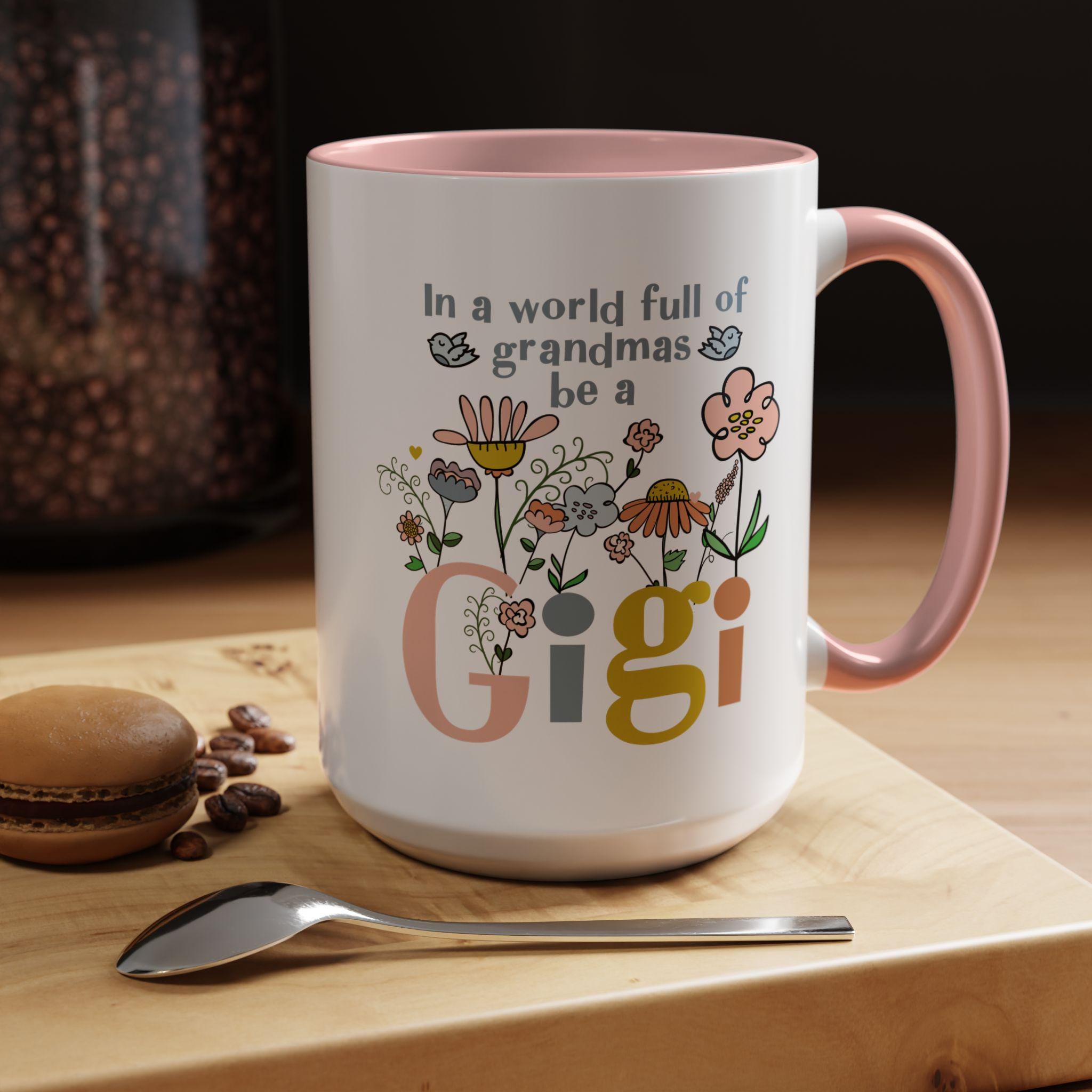 Celebrate a special Gigi with this beautifully designed coffee mug featuring the phrase “In a world full of grandmas, be a Gigi.” Soft pastel florals and charming birds create a warm, uplifting design that brings joy to every morning. This high-quality ceramic mug is available in 11oz and 15oz, offering a glossy finish, comfortable handle, and a durable print designed for daily use. It is dishwasher safe, microwave safe, and printed permanently on both sides for left- or right-handed sipping.