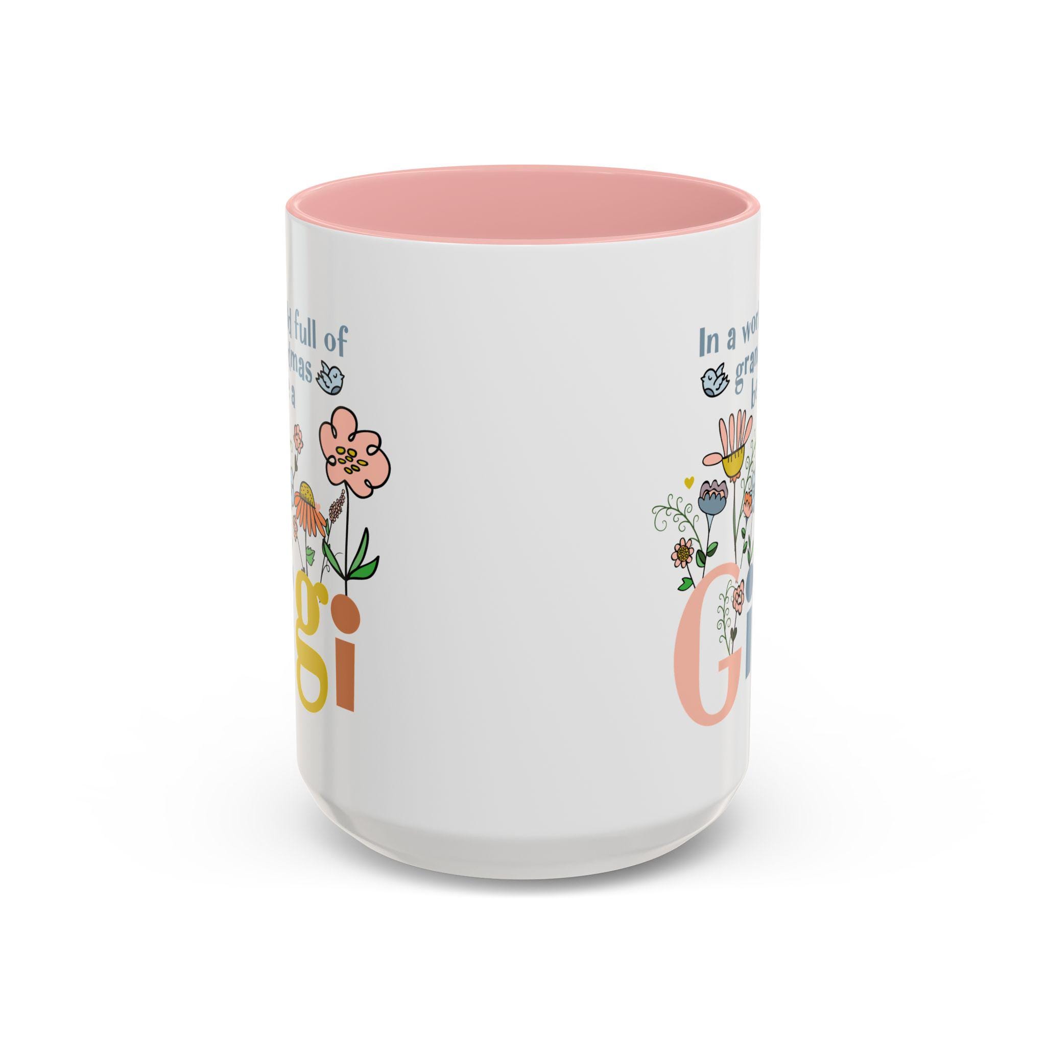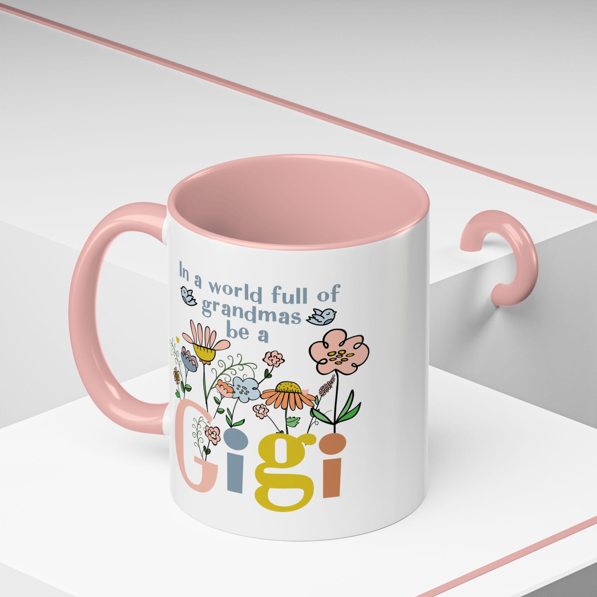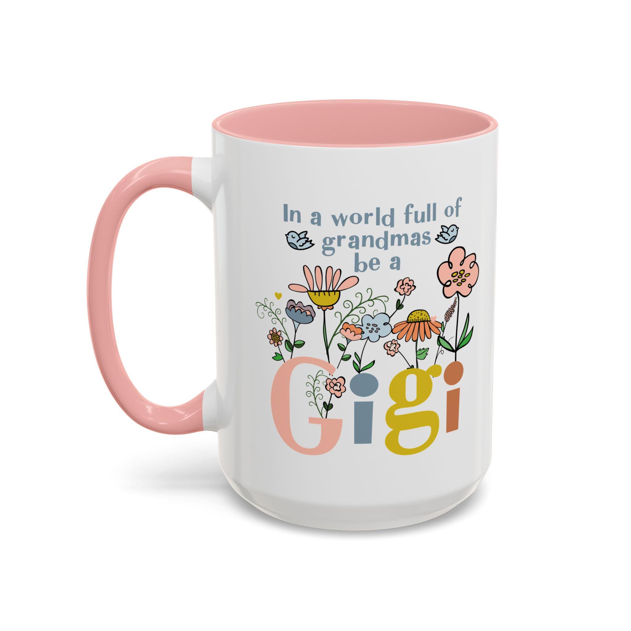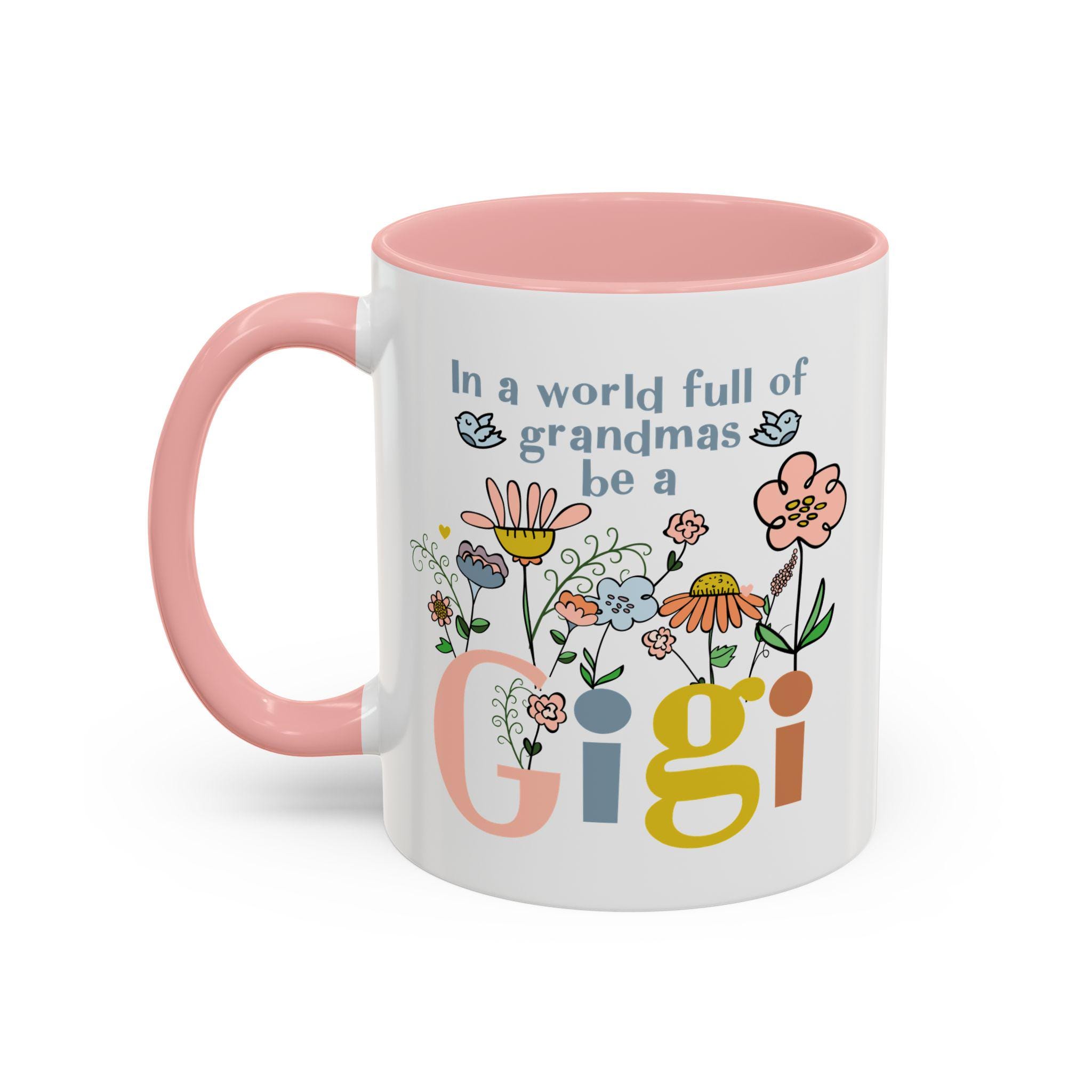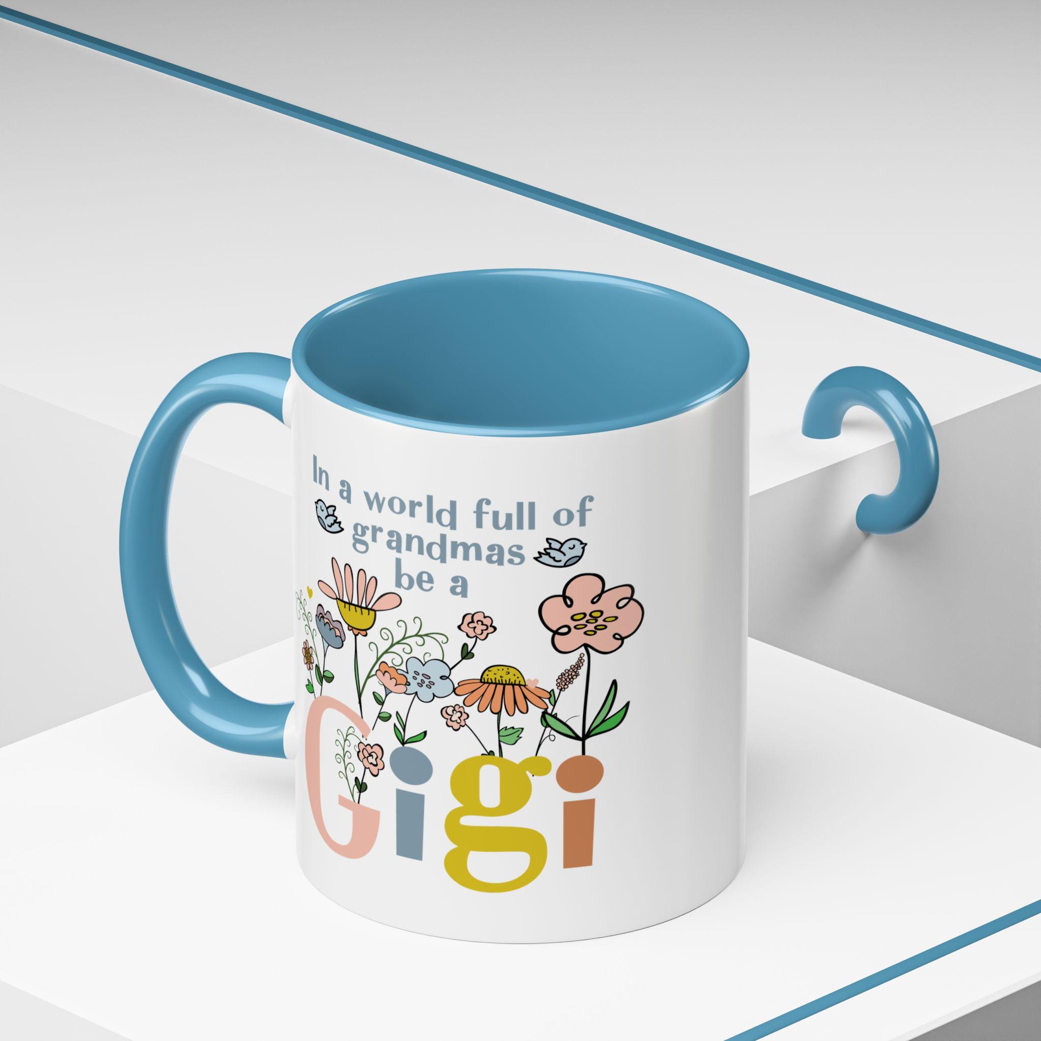 Celebrate a special Gigi with this beautifully designed coffee mug featuring the phrase “In a world full of grandmas, be a Gigi.” Soft pastel florals and charming birds create a warm, uplifting design that brings joy to every morning. This high-quality ceramic mug is available in 11oz and 15oz, offering a glossy finish, comfortable handle, and a durable print designed for daily use. It is dishwasher safe, microwave safe, and printed permanently on both sides for left- or right-handed sipping.