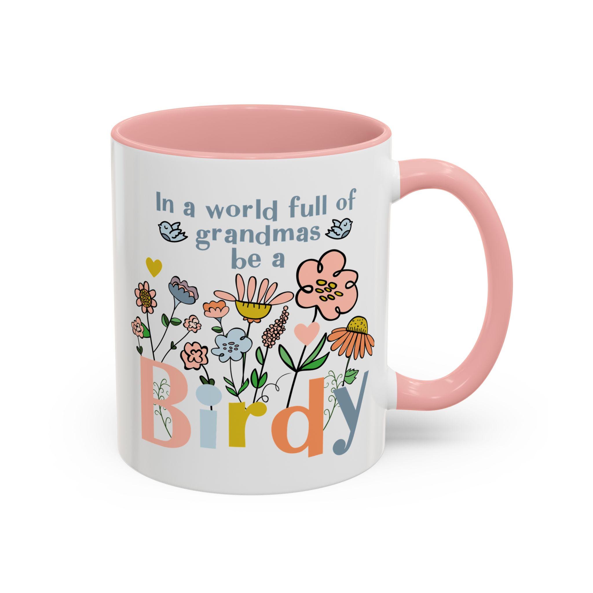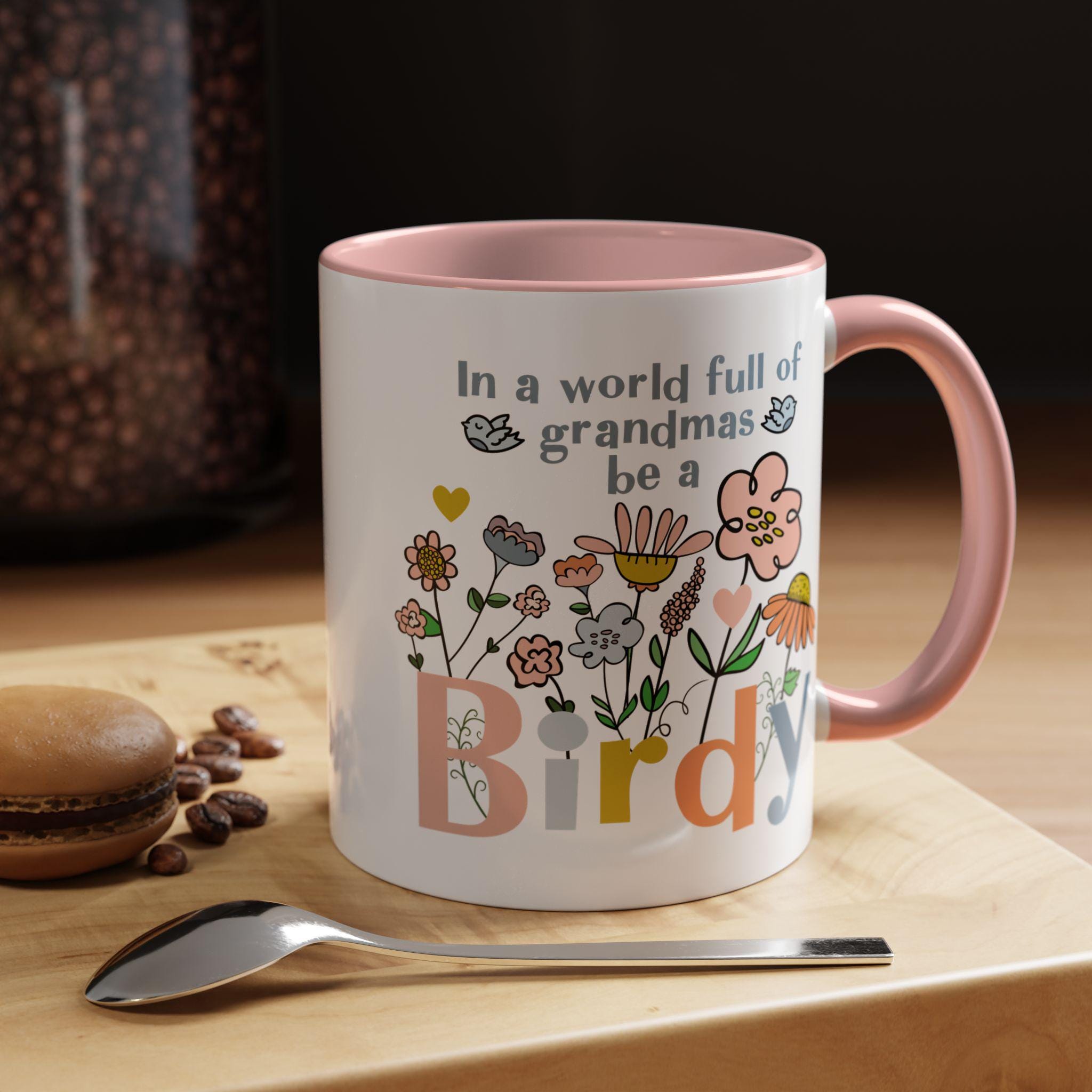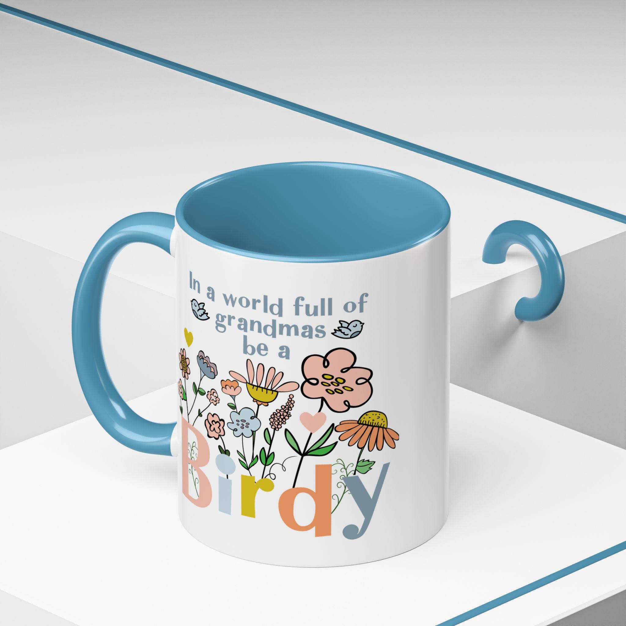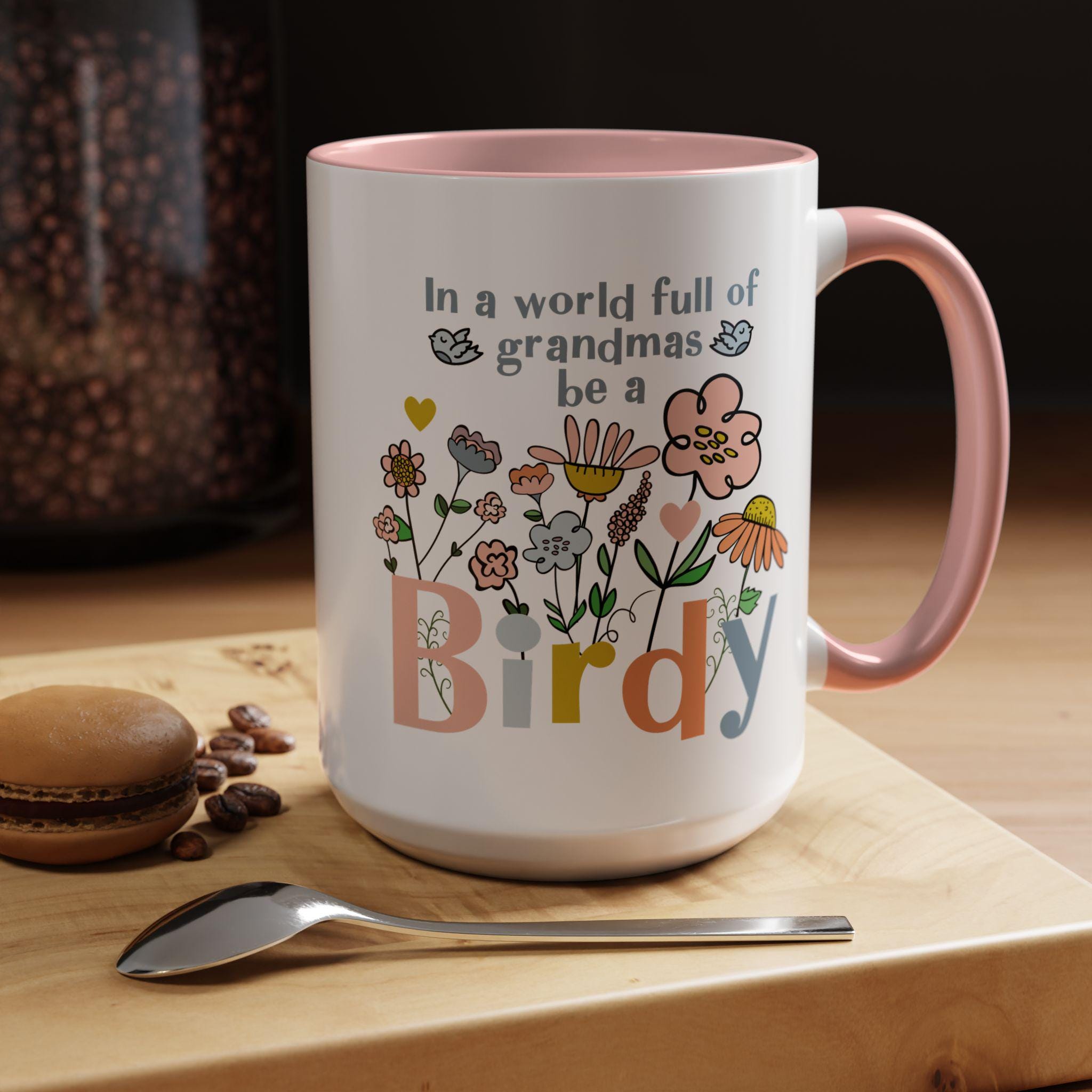 Celebrate a special Birdy with this charming floral coffee mug featuring the uplifting phrase “In a world full of grandmas, be a Birdy.” Soft pastel florals and sweet bird accents create a joyful, heartwarming design that brightens every morning. This high-quality ceramic mug is available in 11oz and 15oz, offering a glossy finish, comfortable handle, and durable print made for daily use. It is microwave safe, dishwasher safe, and printed permanently on both sides for left- or right-handed sipping.