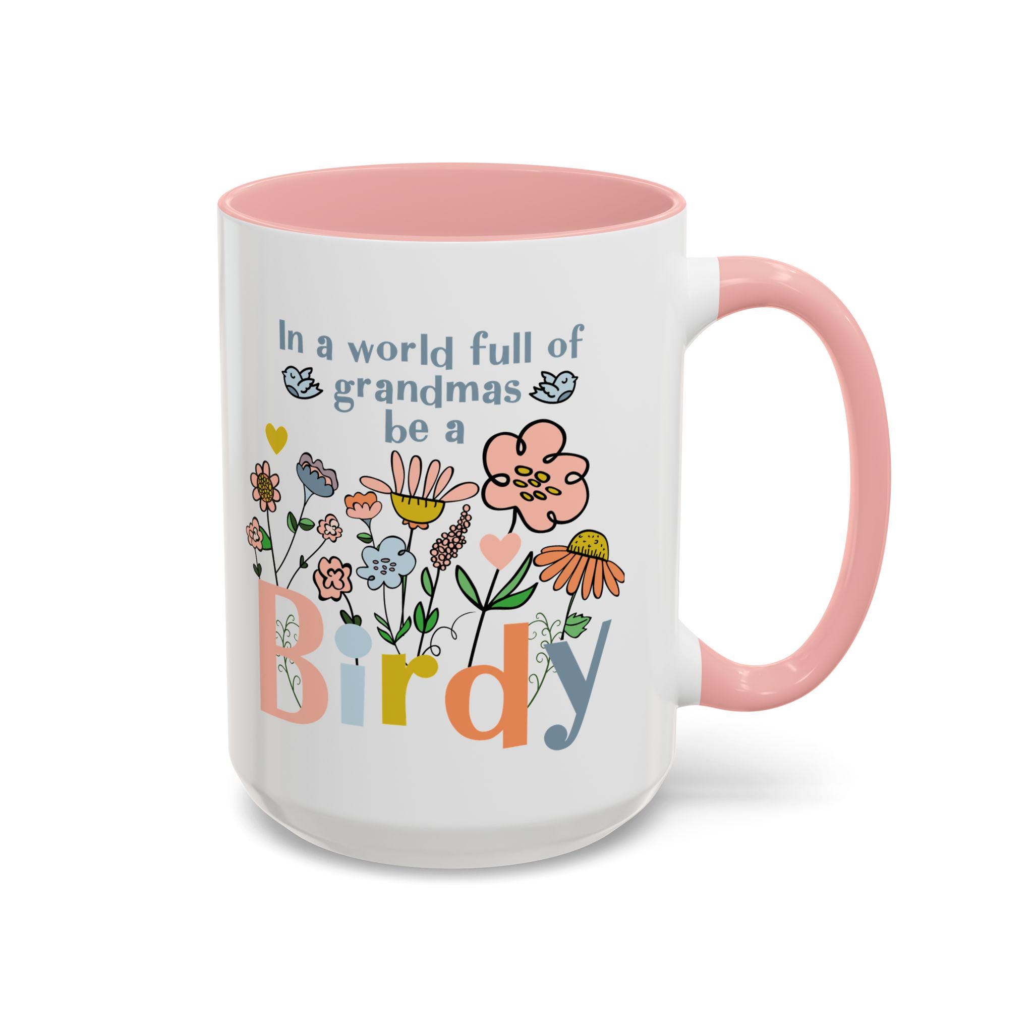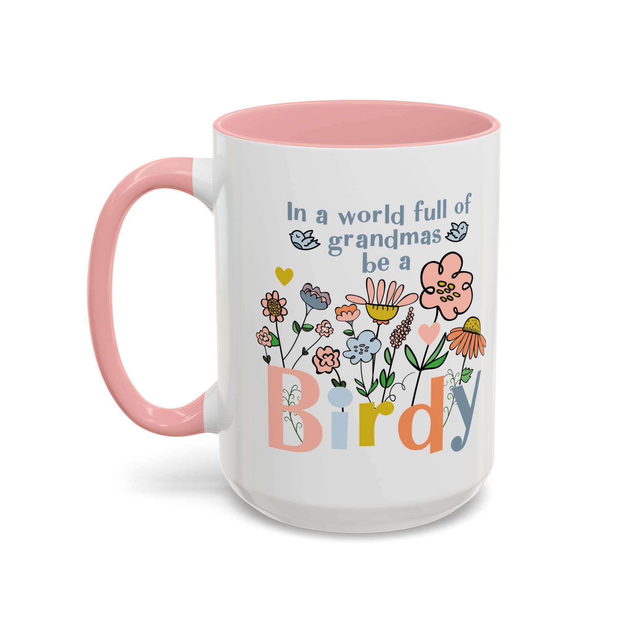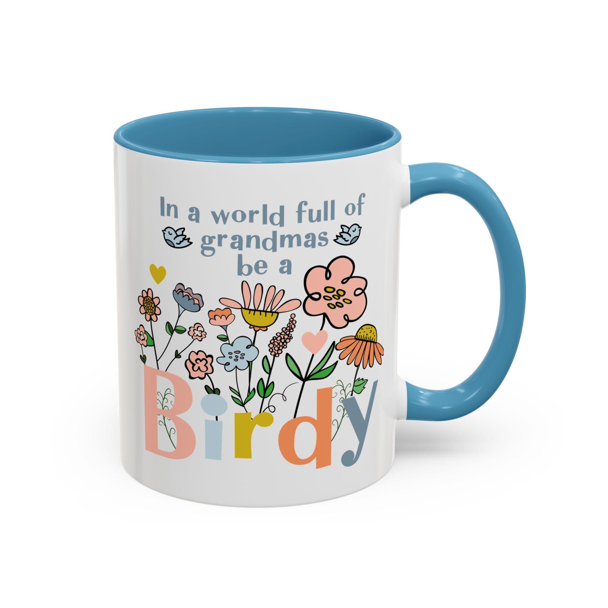 Celebrate a special Birdy with this charming floral coffee mug featuring the uplifting phrase “In a world full of grandmas, be a Birdy.” Soft pastel florals and sweet bird accents create a joyful, heartwarming design that brightens every morning. This high-quality ceramic mug is available in 11oz and 15oz, offering a glossy finish, comfortable handle, and durable print made for daily use. It is microwave safe, dishwasher safe, and printed permanently on both sides for left- or right-handed sipping.
