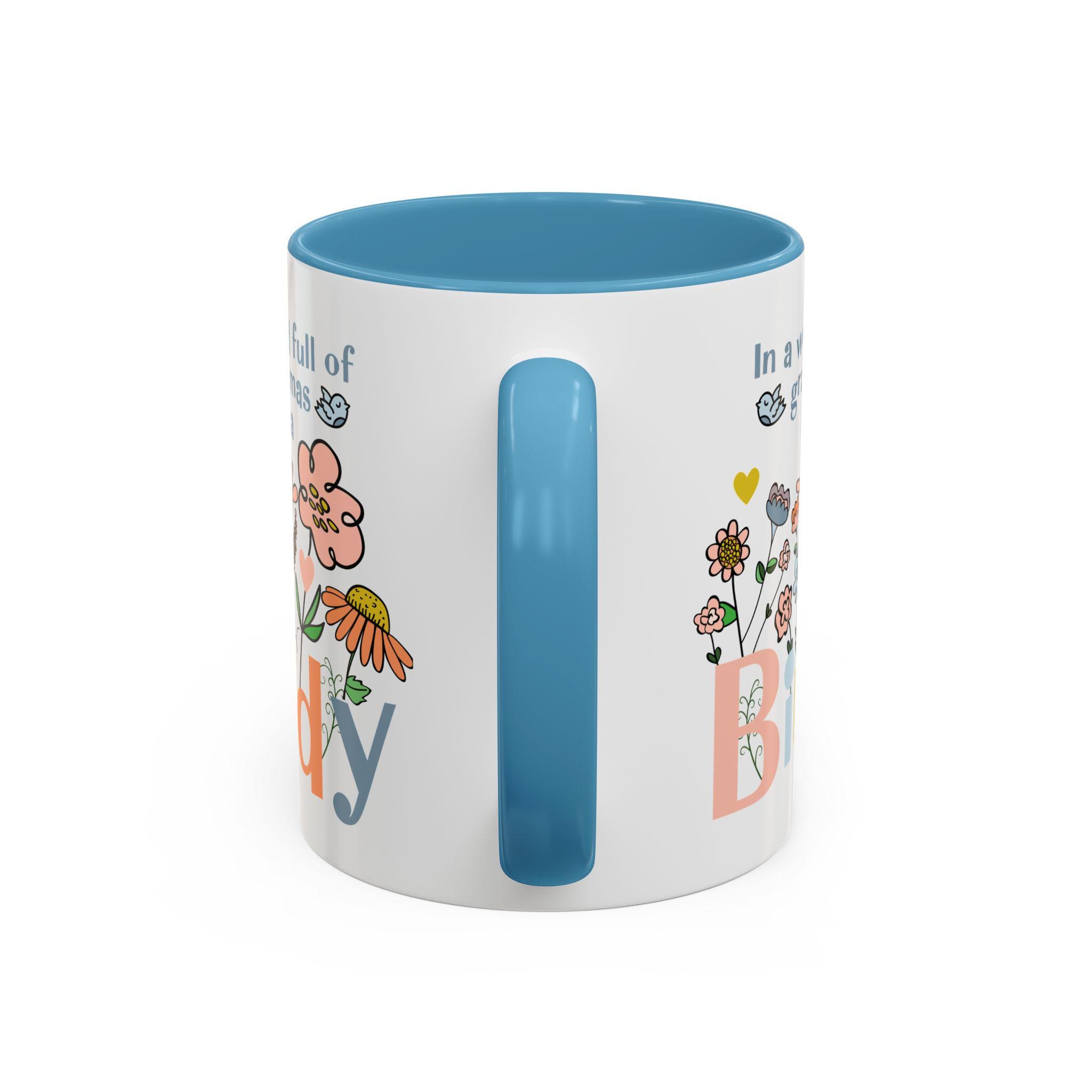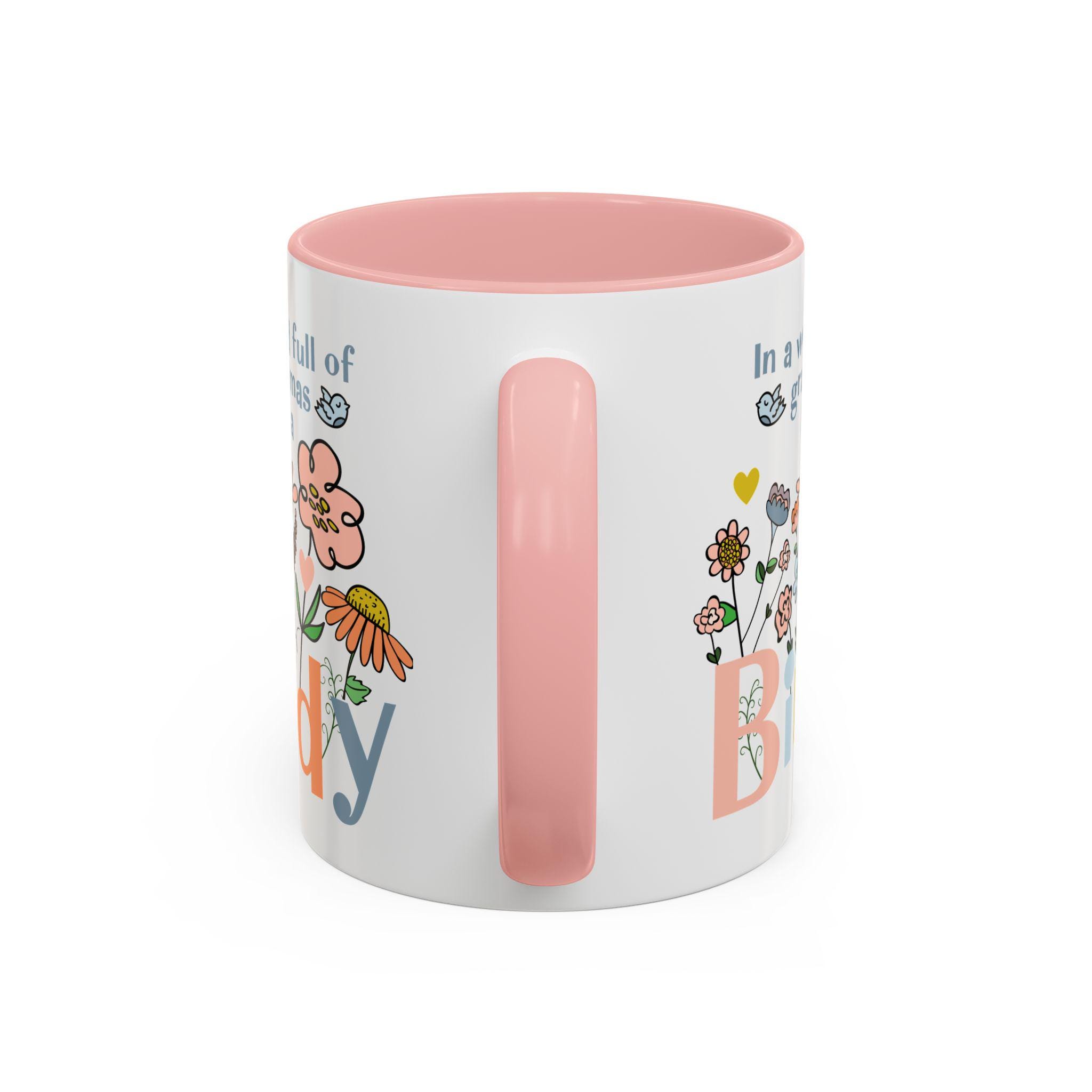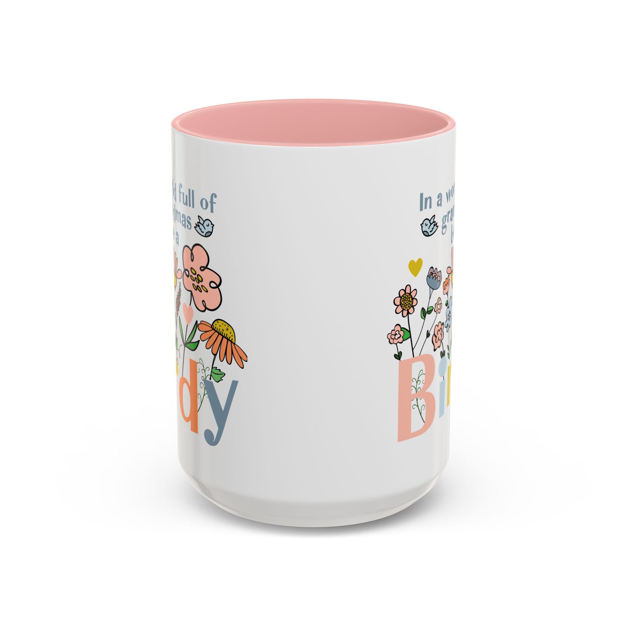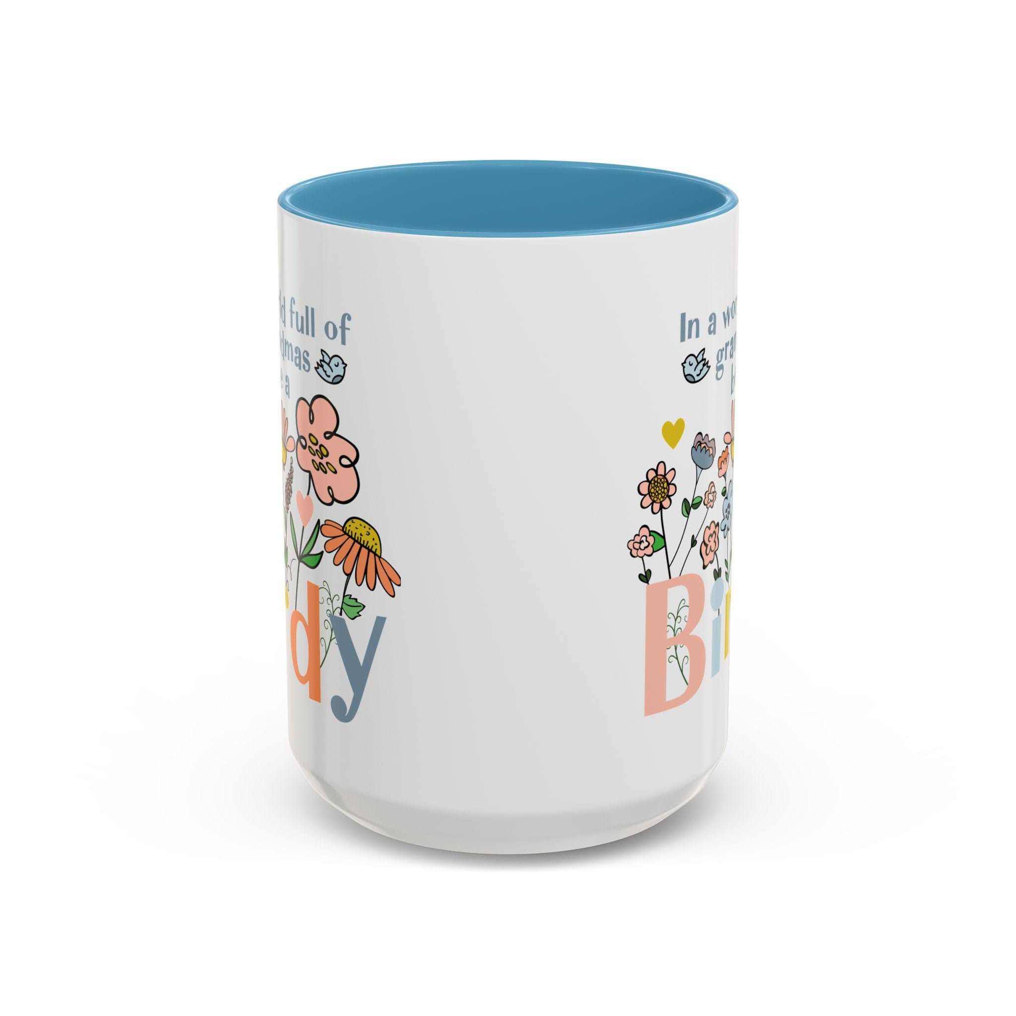Celebrate a special Birdy with this charming floral coffee mug featuring the uplifting phrase “In a world full of grandmas, be a Birdy.” Soft pastel florals and sweet bird accents create a joyful, heartwarming design that brightens every morning. This high-quality ceramic mug is available in 11oz and 15oz, offering a glossy finish, comfortable handle, and durable print made for daily use. It is microwave safe, dishwasher safe, and printed permanently on both sides for left- or right-handed sipping.