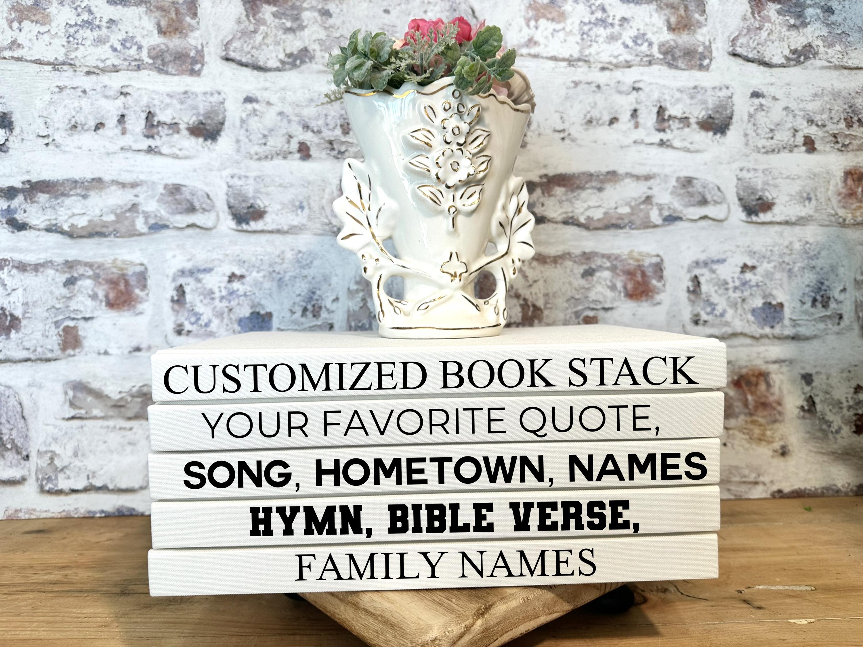 Introducing our exquisite collection of custom coffee table books, where your imagination takes center stage. Handcrafted with love and precision, these one-of-a-kind literary masterpieces are perfect for any bookworm or those seeking a unique and personal gift. Allow us to bring your favorite stories to life by customizing the book cover spines with your desired title, author name, or even a meaningful or famous quote, bible verse, or poem. Your imagination is the only limitation! Crafted from high-quality materials, these custom books will add an elegant touch to your home decor or make for a cherished keepsake. Whether you're celebrating a special occasion or simply indulging in your love for literature, our custom book stacks are designed to captivate and enchant, making them a truly remarkable addition to any bookshelf. Create your own prayer journal or custom guest book.